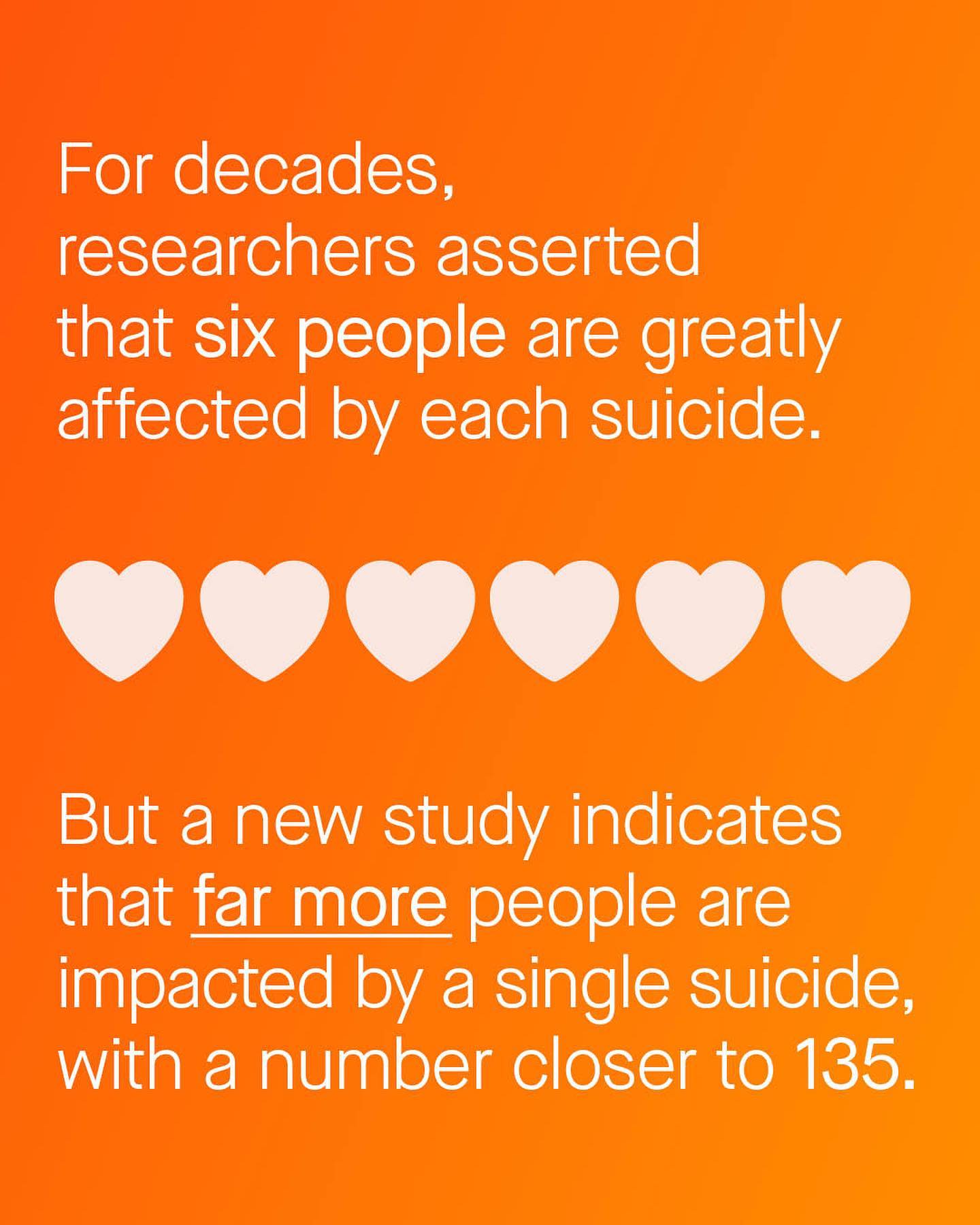 Please send this to those who need to see it. Suicide continues to claim hundreds of thousands every year, and devastates the lives of countless millions more. Although heavily affecting men, nobody is immune to it. So please remember – you, me and everyone else, matter. You are important. More important, to more people, in more ways than we ever knew. Until recently we thought just six people were impacted by a single suicide, but new research has shown the true number is far, far higher. We don’t, and can’t, ever know what our life means, in what ways, and to who. The role model to a friend, or teacher to a child. You are the hero to a housemate, the coffee to a colleague, the morning smile to a postal worker, and the apple of the eye of a stranger. The ripples of our lives and actions, emanate and echo out further than we know, and perhaps more than you allow yourself to believe. So here’s a study to remind you of my favourite thing - the objective truth. So who are your 135? ~ Study [1] Images: m-t-elgassier from Unsplash #suicideprevention #ttmmenshealth
