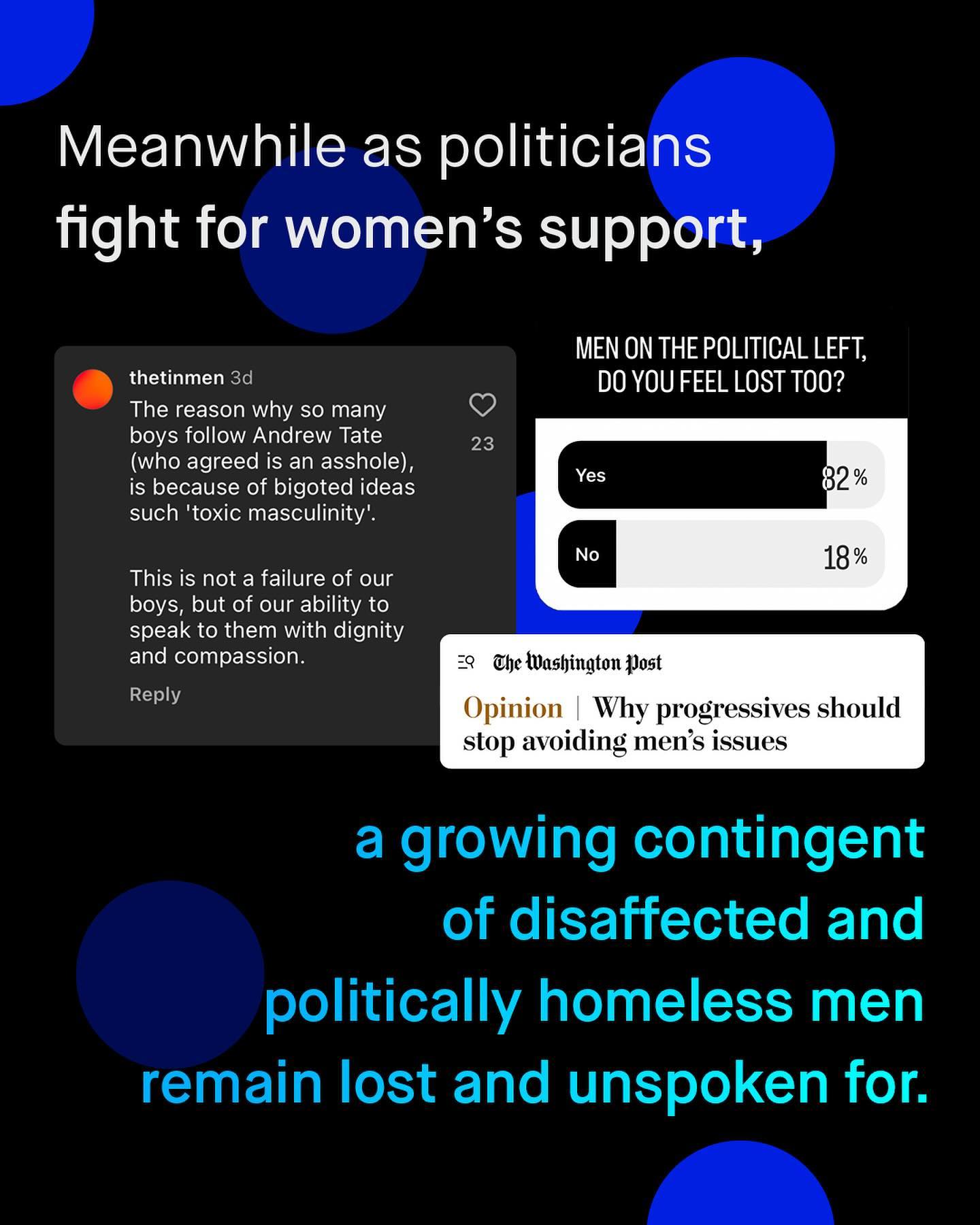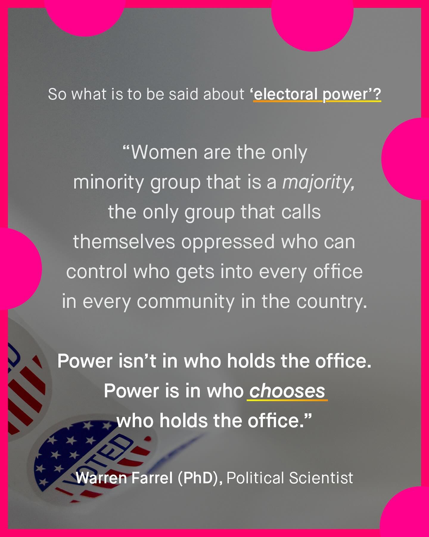It will not surprise you, but I have a rather dim view of politics. Every year I find my opinion of politicians hits a new rock bottom, only to outdo itself shorty afterward by diving yet further still, to new unexplored lows, deeper into the quagmire of political incompetence and narcissism. I simply do not believe in politics any longer, or at least not in its ability to create meaningful and lasting change. This is especially true when it comes to boys and men, and the issues you read on this page, that usually provoke a level of political appetite best described as a ‘shit sandwich’. Men and boys advocacy is a political time bomb, that will end the career of whoever finds themselves holding it when the fuse runs out. It’s why politicians have failed men and boys so spectacularly, and for so long. Because it’s unpopular. And that’s really what politics is all about. Looking good. If an opinion doesn’t look good, or sound great, then don’t say it; because politics is about winning votes, not making change. Politics is largely self-serving. Usually won by whoever can beat their chest the hardest, yell the loudest, squeeze out the most crocodile tears, or wring their hands most convincingly. It’s why so many political “allies” advocate for women, support the creation and funding of various women’s departments, and badge themselves as feminists. Not necessarily because they care, but because women vote. Yes. Women outvote men in every election, and can single handedly decide who pulls the levers of power, in every political office in the country. Politicians are well aware of this. Yet women’s electoral power, the biggest voting bloc of its kind, is never discussed within the context of ‘power dynamics’. Why not? Why do so many politicians pander solely to women and girls, yet betray the other 50% of their constituents? Do politicians really care, or are they simply looking for votes? And who pays the price of this game of ‘politicks’? What do you think? ~ Voter turnout and Gender Images by Getty, Gradienta, MyMind, Gemma Chua Tran and Elliot Stallion