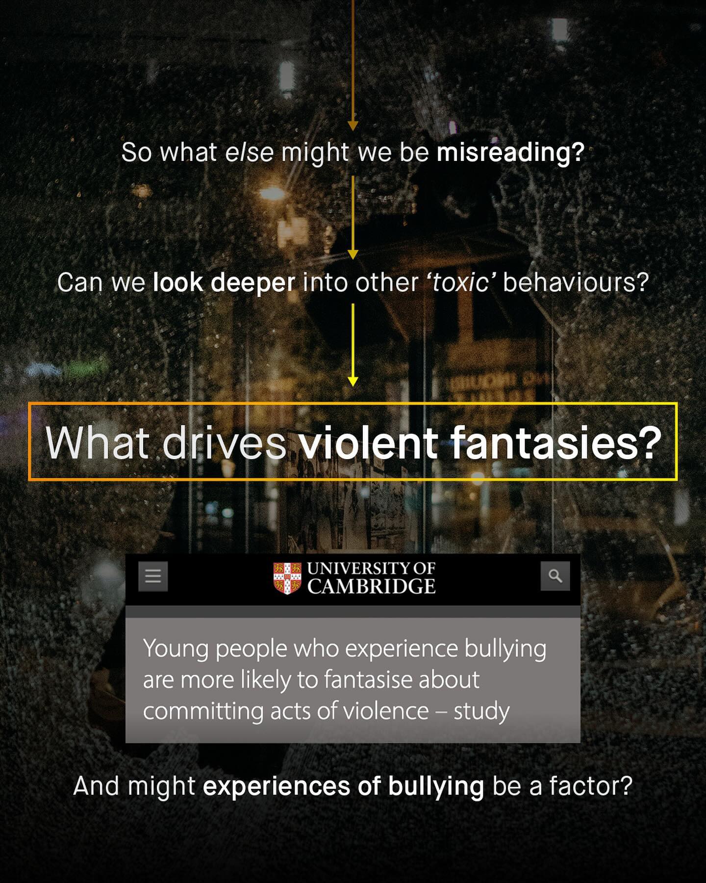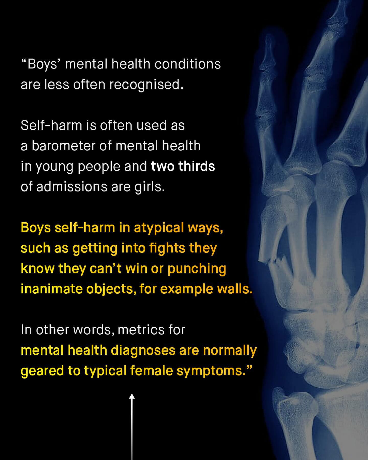 TW: Self Harm Male violence, and violent men and boys, continues to be distorted through an antiquated, ideological lens, that fails to see what violence is, and where it comes from. Once again we lean into the same cartoonish, childlike, and conspiratorial interpretations of such behaviour. It’s ‘the patriarchy incarnate’, or ‘male oppression made real’ you might hear, or ‘if he punches a wall, then he will surely punch you!’ Such asinine observations wouldn’t look out of place scrawled across the back pages of a teenager’s pop-psychology text book; but are an unwelcome guest in the realm of grown up discussion. Frustratingly, the problematic behaviour of women and girls is rightly seen as the product of their environment and traumatic experiences… Yet the cause of these same behaviours by males, are seen as internalised within men and boys themselves, and a product of so called “toxic” masculinity. Meaning - when a woman has a problem we say ‘we must fix society’, which is correct. But when a man has a problem, we shake our heads and mutter ‘men must fix themselves’… This is a fundamentally unbalanced, dishonest, and sexist approach to understanding male and female behaviour. And such a lack of care, interest, or good faith within the study of male psychology, leads to glaring blind spots within mental health support, diagnosis, and policy, that hurts everyone. We see it within the issue of self harm, which remains a growing epidemic within young women and girls, hitting the headlines in recent years, as hospital admissions of girls increased exponentially. Such headlines and data, make self harm an issue heavily influenced by the female sex. But is it that simple? What if men and boys self harm in atypical ways, outside of our traditional view? That man punching a wall, or getting into unwinnable fights… could that be an act of self harm? What about men who have fantasies of violence; is it time we asked where such fantasies came from, rather than brandishing them as “toxic” too? And are such men and boys most dangerous to others, or themselves? What do you think? ~ #mensmentalhealth #malesuicideawareness #malesuicide #bullying