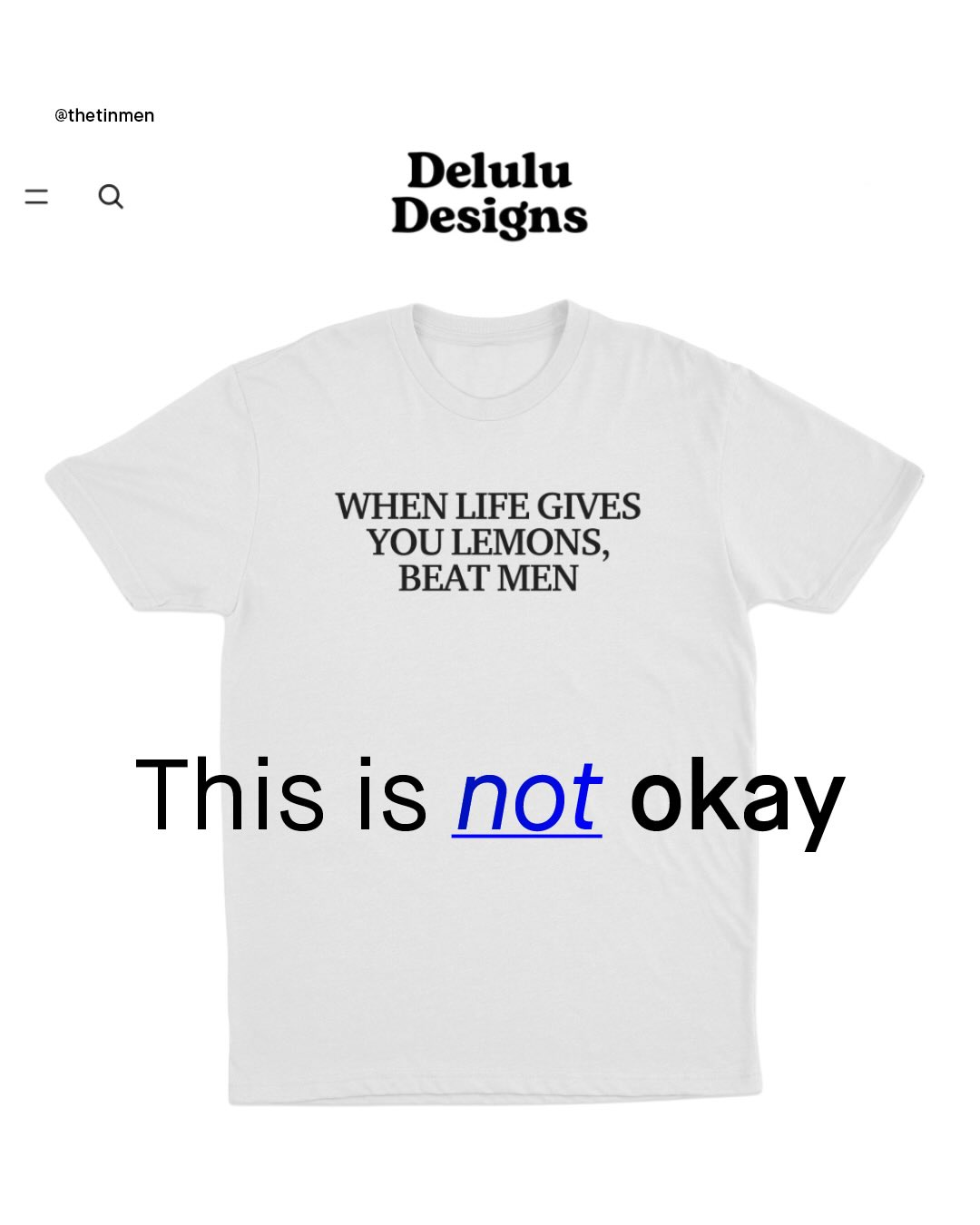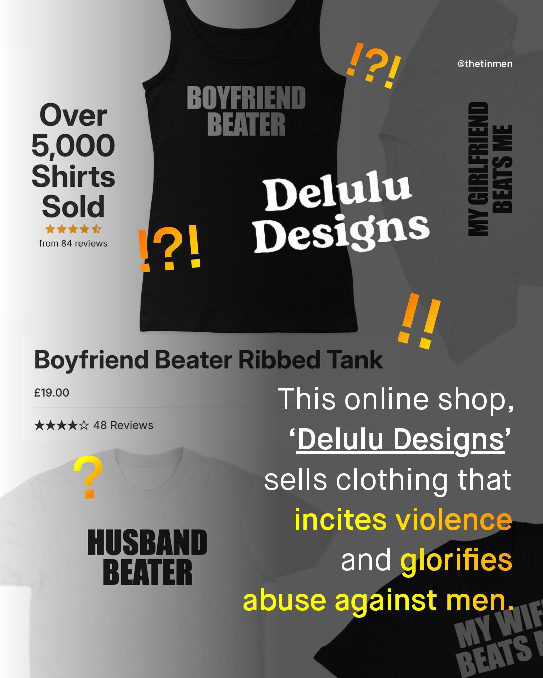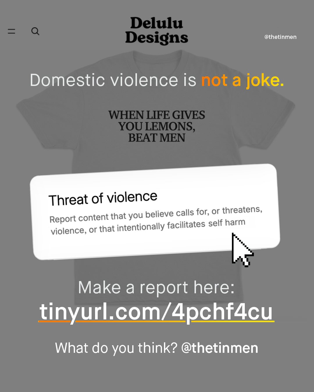 The world has come a long way in reshaping people’s opinions of violence against women; to stop it being used as the butt of jokes, or waved away as inconsequential. Violence against women is, as it should be, passionately and unapologetically spoken about on pulpits across the world, held above heads on protests, and splashed across newspaper headlines. And whilst there is more to be done, the same hard-won shift in attitude cannot be claimed for violence against men. ‘Violence against men’, an unfamiliar phrase to so many, languishes in the most regressive, stubborn, neanderthal-like areas of so many brains; to be chortled about, scoffed at, and minimised. You won’t get the solemn moments of silence, or looks of shock that stories of abused women receive, instead, expect eye rolls, smug smiles, sneers, and laughter. Even our own politicians cannot bear to talk about it, classifying abused men as ‘male victims of violence against women’, and breathing a deep sigh of relief instead. But last week, I was sent something that shocked me even more than any of this – A website selling a whole series of t-shirts, hoodies, jumpers and vests, of varying colours and designs, that straight up encourage violence against men, trivializing, condoning, and inciting such violence, for a few quid in their own back pocket. More shocking still is the response; hundreds of thousands of ‘likes’ and comments, shares and purchases, that simply would not happen if the roles were reversed. However, it must be said that, an even larger number of comments are pushing back, with horror and dismay. Thankfully, something can be done. @printful who are Delulu’s Print on Demand service have already promised to ‘take the appropriate action’, when I contacted them. And now it’s time to get @shopify to do the same. Terms of Service are there for a reason. Delulu, to put it mildly, have broken these terms, and now it’s time to remove them as a store. So let’s take action, and remind the world that no abuse, of any kind, toward anyone, is a joke. What do you think?