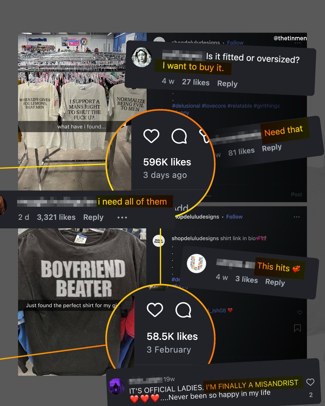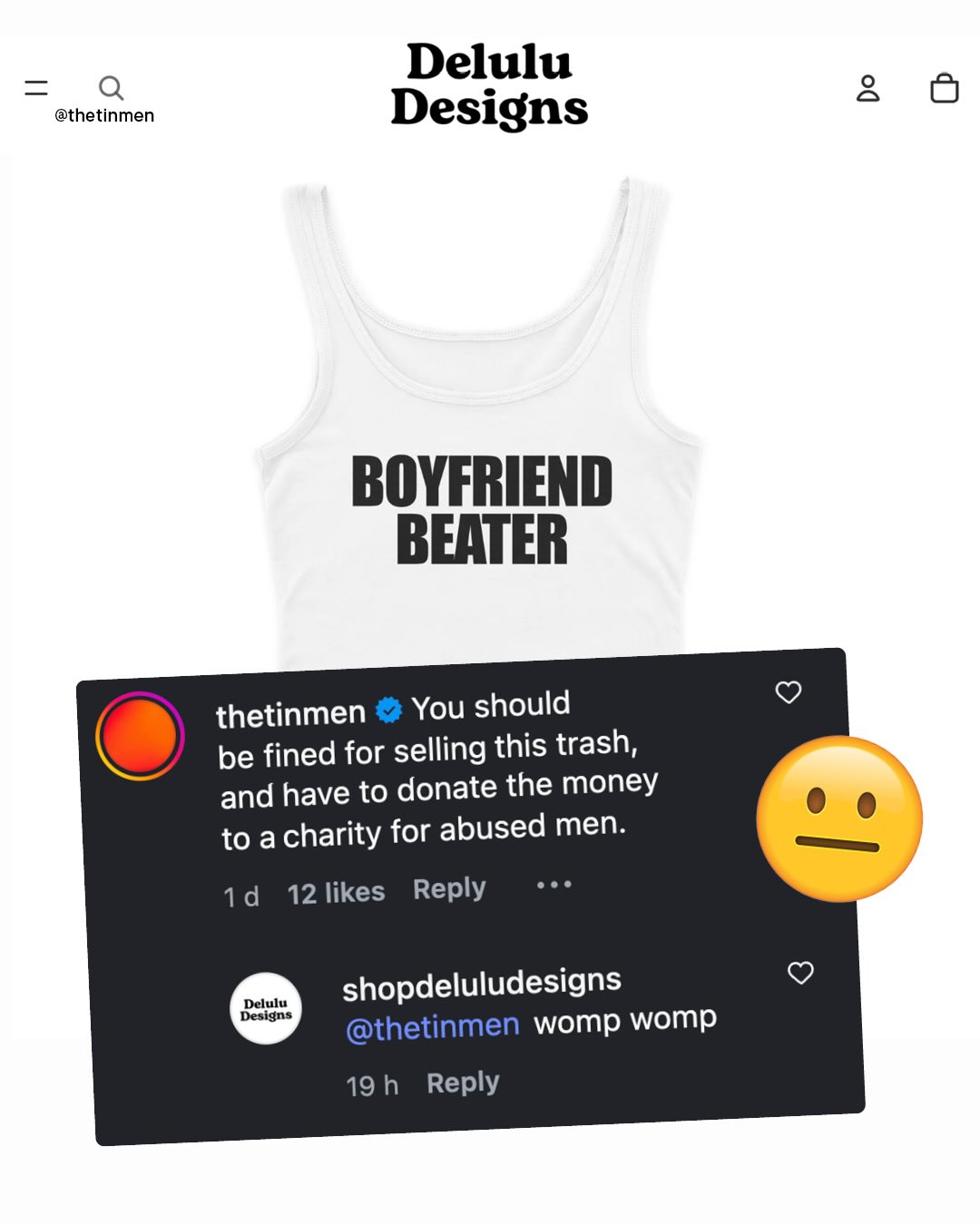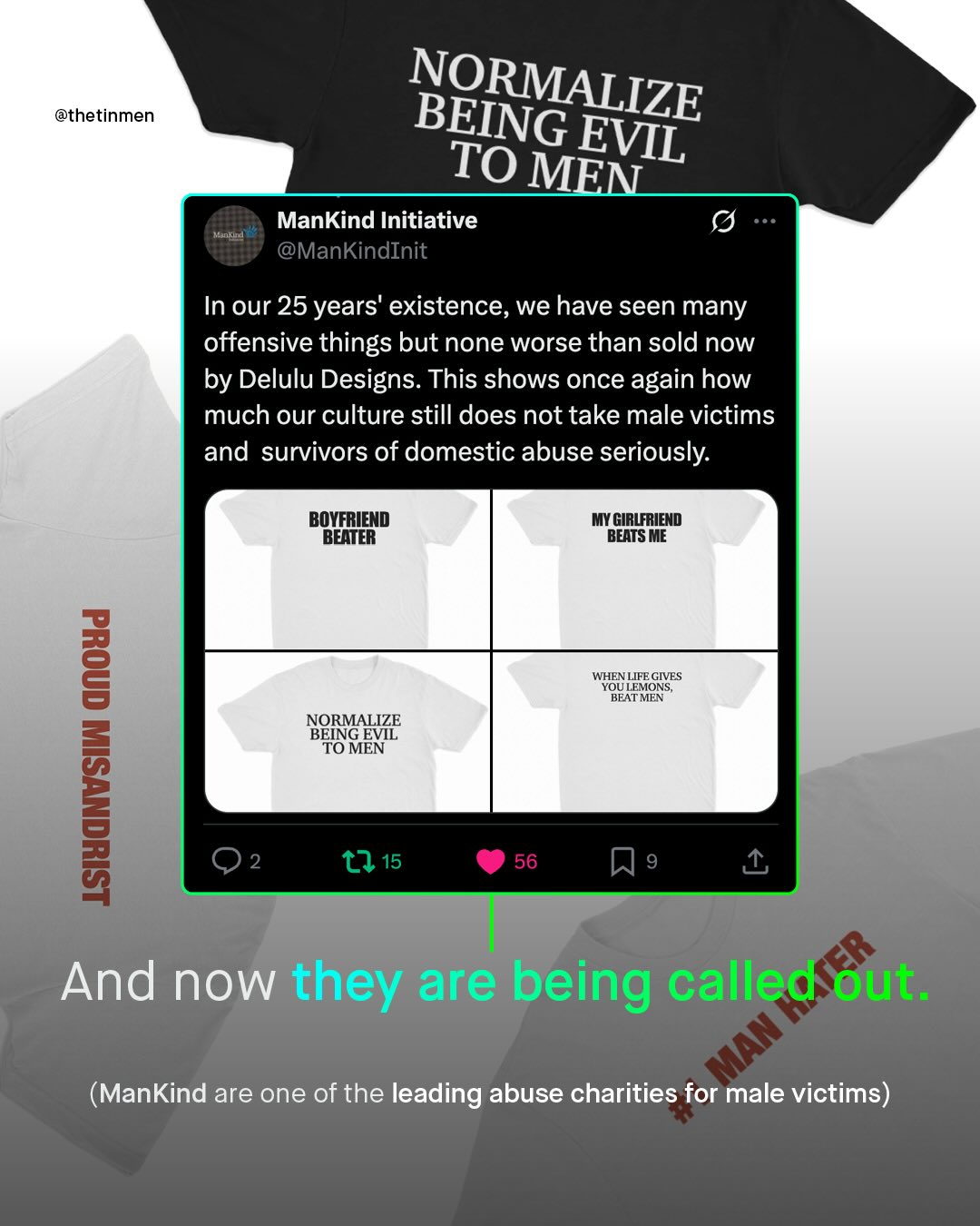 The world has come a long way in reshaping people’s opinions of violence against women; to stop it being used as the butt of jokes, or waved away as inconsequential. Violence against women is, as it should be, passionately and unapologetically spoken about on pulpits across the world, held above heads on protests, and splashed across newspaper headlines. And whilst there is more to be done, the same hard-won shift in attitude cannot be claimed for violence against men. ‘Violence against men’, an unfamiliar phrase to so many, languishes in the most regressive, stubborn, neanderthal-like areas of so many brains; to be chortled about, scoffed at, and minimised. You won’t get the solemn moments of silence, or looks of shock that stories of abused women receive, instead, expect eye rolls, smug smiles, sneers, and laughter. Even our own politicians cannot bear to talk about it, classifying abused men as ‘male victims of violence against women’, and breathing a deep sigh of relief instead. But last week, I was sent something that shocked me even more than any of this – A website selling a whole series of t-shirts, hoodies, jumpers and vests, of varying colours and designs, that straight up encourage violence against men, trivializing, condoning, and inciting such violence, for a few quid in their own back pocket. More shocking still is the response; hundreds of thousands of ‘likes’ and comments, shares and purchases, that simply would not happen if the roles were reversed. However, it must be said that, an even larger number of comments are pushing back, with horror and dismay. Thankfully, something can be done. @printful who are Delulu’s Print on Demand service have already promised to ‘take the appropriate action’, when I contacted them. And now it’s time to get @shopify to do the same. Terms of Service are there for a reason. Delulu, to put it mildly, have broken these terms, and now it’s time to remove them as a store. So let’s take action, and remind the world that no abuse, of any kind, toward anyone, is a joke. What do you think?