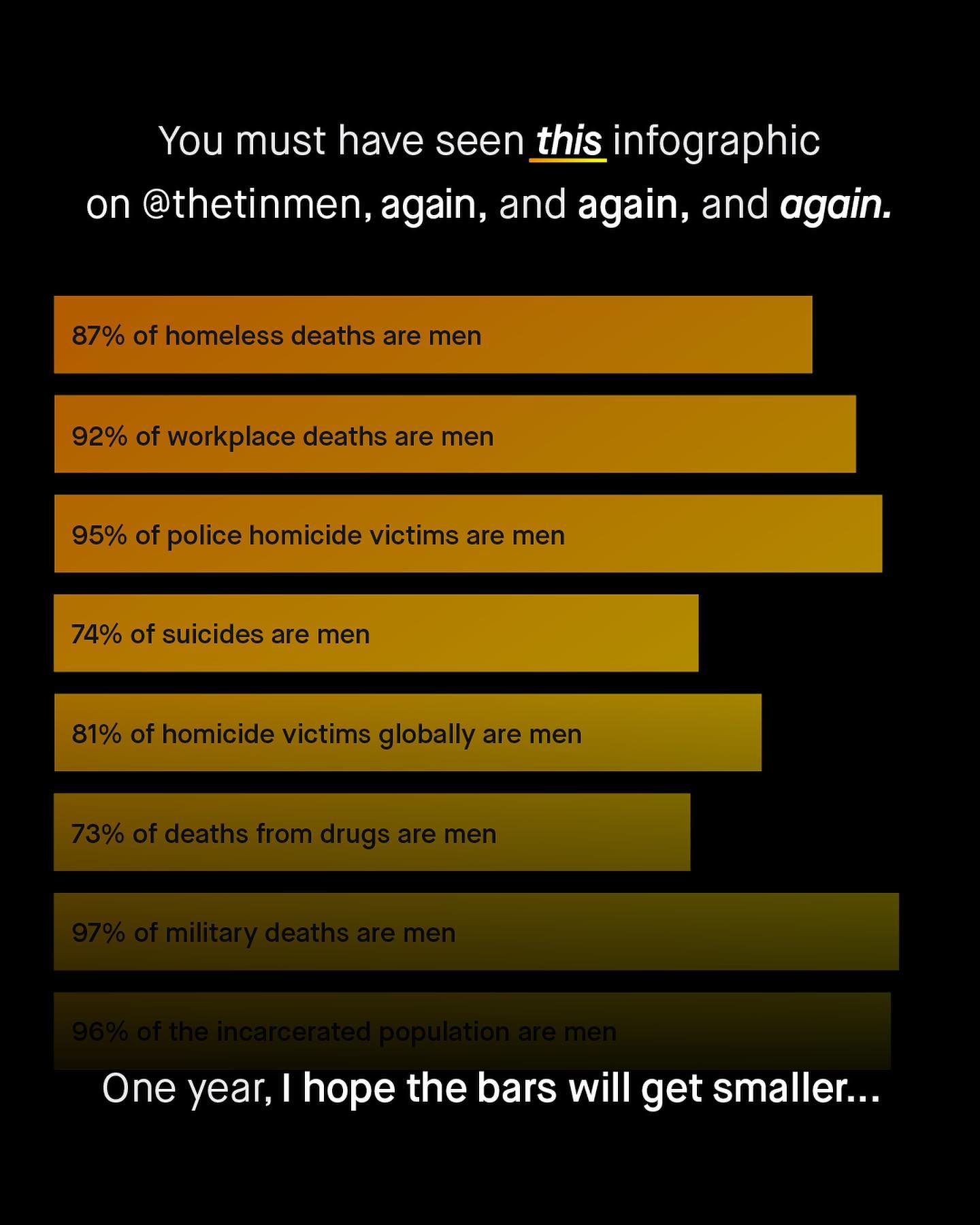 I know, sometimes on this page you’ll see the same graphs, numbers, charts, or diagrams, several times. You’ll hear the same claims, the same shocking stories, and same hidden realities revealed. You’ll read the same issues talked about, discussed, and dissected; battled over in the comments, again, and again, and again. Round and round @thetinmen goes, the never ending Groundhog Day of Instagram. So yes, if it feels like I repeat myself, it’s because, well… I am. I repeat myself because nothing changes. Each year the same staggering number of male deaths happen at work. The same number of men tragically take their own lives. The same vulnerable men remain shut out of abuse shelters. The same charities, Governments, politicians, and organisations do, and say nothing. The same fathers don’t have equal rights. The same boys don’t have bodily autonomy. And advocacy to change that is still laughed at, or shouted down, talked over, by the same nit wit voices, with the same tiresome jokes and whines. So here we are. I don’t know how long we stay on this ride, I don’t know how nauseating it will become, or who will join, or leave us along the way. But for as long as society repeats its pattern of not caring, or talking in good faith about men and boys, so must we repeat our own pattern; of insisting for change, again, and again, and again, until one day it finally happens. So strap yourself in, buy another ticket, and I’ll see you next time around. All aboard. ~ Boys Behind for Three Decades Homeless Deaths Workplaces Deaths Police Homicide Male Suicide Homicide by sex Incarcerated Population Drug deaths by sex War deaths Images by Joe Yates, Jeswin Thomas, Yousef Salhamoud, Josh Olalde, Miles Storey #mensmentalhealth