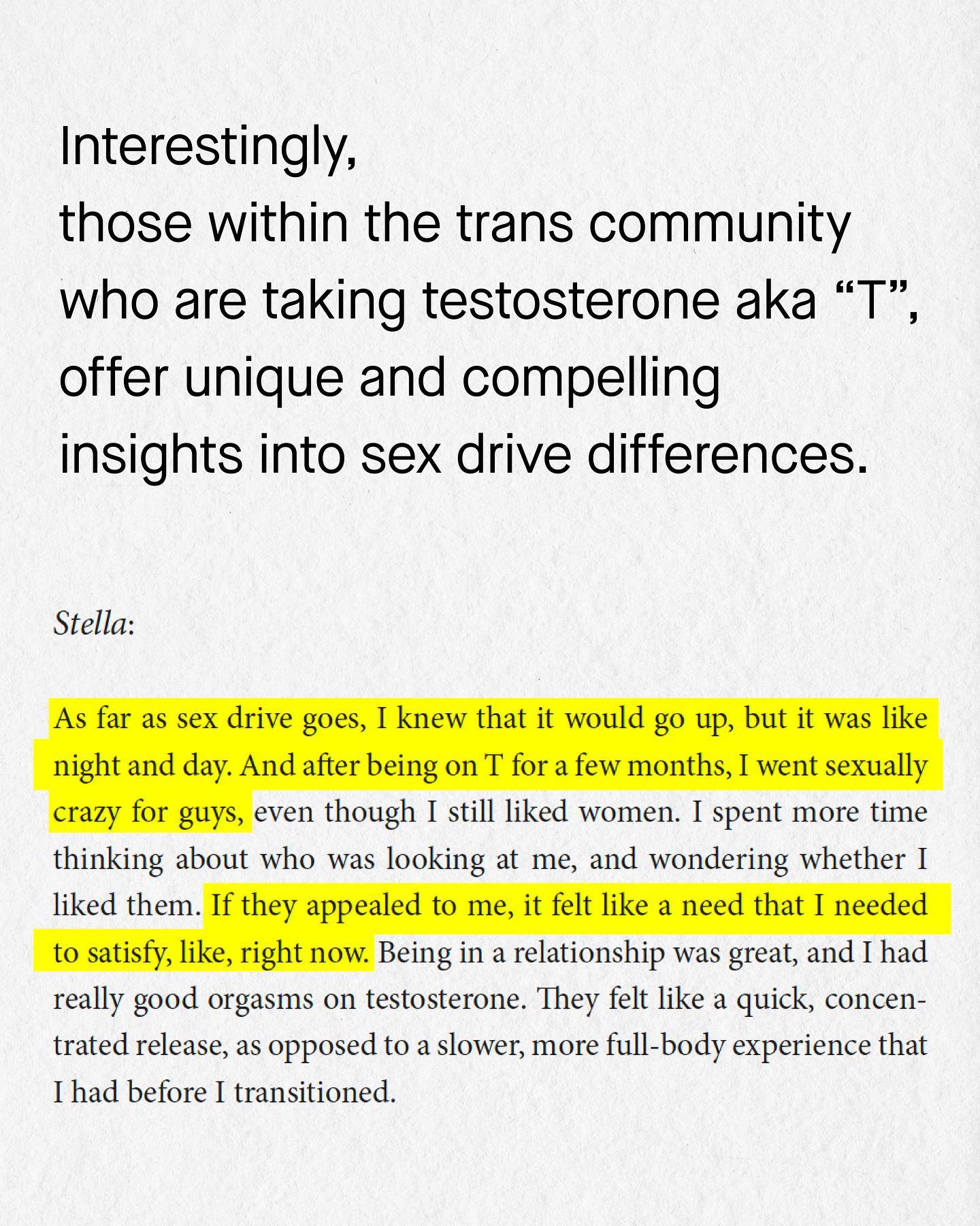 Anyone who has lived as, or indeed known, a pubescent boy, knows it is far from a fairytale. Your emotions are like fireworks. You’re pissed off, and not sure why. You’re moody. Or quiet. Or dramatic. Or all of them, or none, or something entirely different. It’s a mess. And then there’s the inevitable fascination with sex. How could something so newly fangled to the teen boy’s mind suddenly feel so all encompassing? A new word, that was never part of his vocabulary has suddenly arrived, to make the boys adolescent brain its home. The sex light switches on, and I’m afraid to say lads, it will stay on for quite a while yet. But have you ever wondered how this compares to a woman’s sex drive? The two are so often compared. But it’s a treacherous comparison to make, as to understand both is to somehow disentangle the impossibly enmeshed influences of biology vs culture. Despite progress, you’re right that women are more often shamed for having casual sex, and we are still more accepting of a man’s sexual conquests. Culture is important. But you’d be wrong to ignore entirely the hormones that shape and dominate male behaviour, and how they play a major role in sex. And yes, I’m talking about testosterone. ‘The hormone that dominates and divides’, as Harvard evolutionary biologist Carole Hooven describes. Or as Germain Greer more clumsily put it, ‘testosterone is a rare poison’. So what can be said about men’s sex drive? Is it really higher than womens, and if so, why? Is testosterone the culprit to the sex addled brains of a billion teenage boys? And could the trans community hold the key to understanding both sides of the divide? ~ Study Study review Carole Hooven Images by Diana Light, Codioful, Kiwi Hug, Womaniser Toys, Annie Sprat, Alexander Krivitskiy #sexpositivity #sexualhealth #sexualwellness