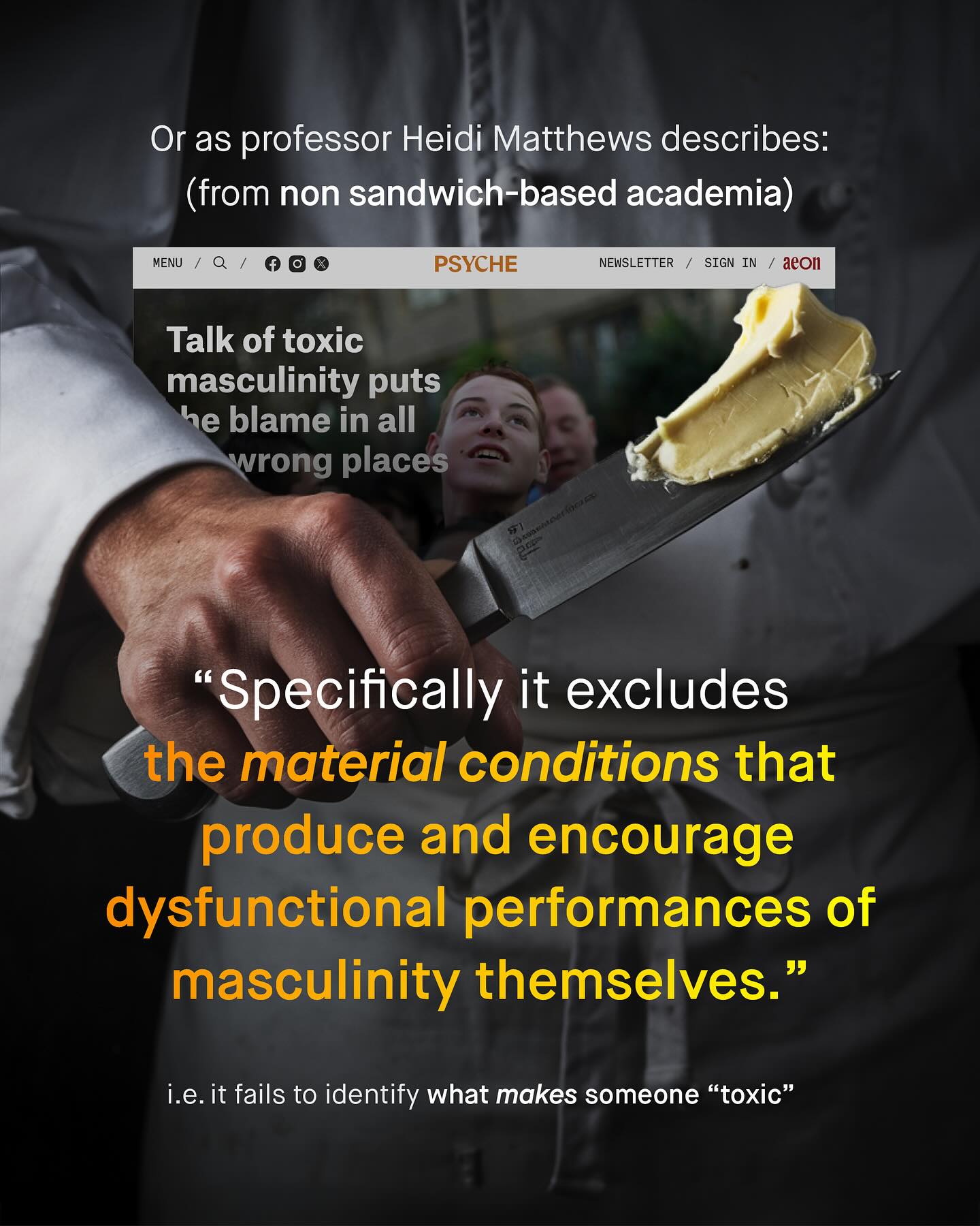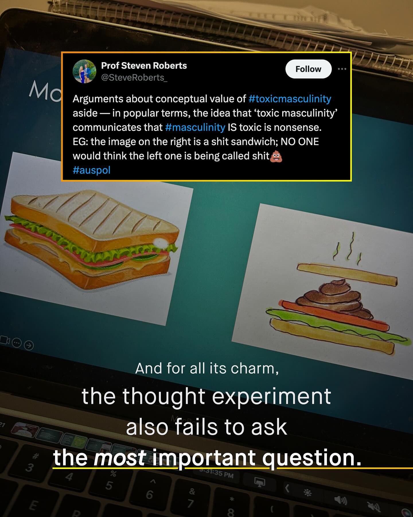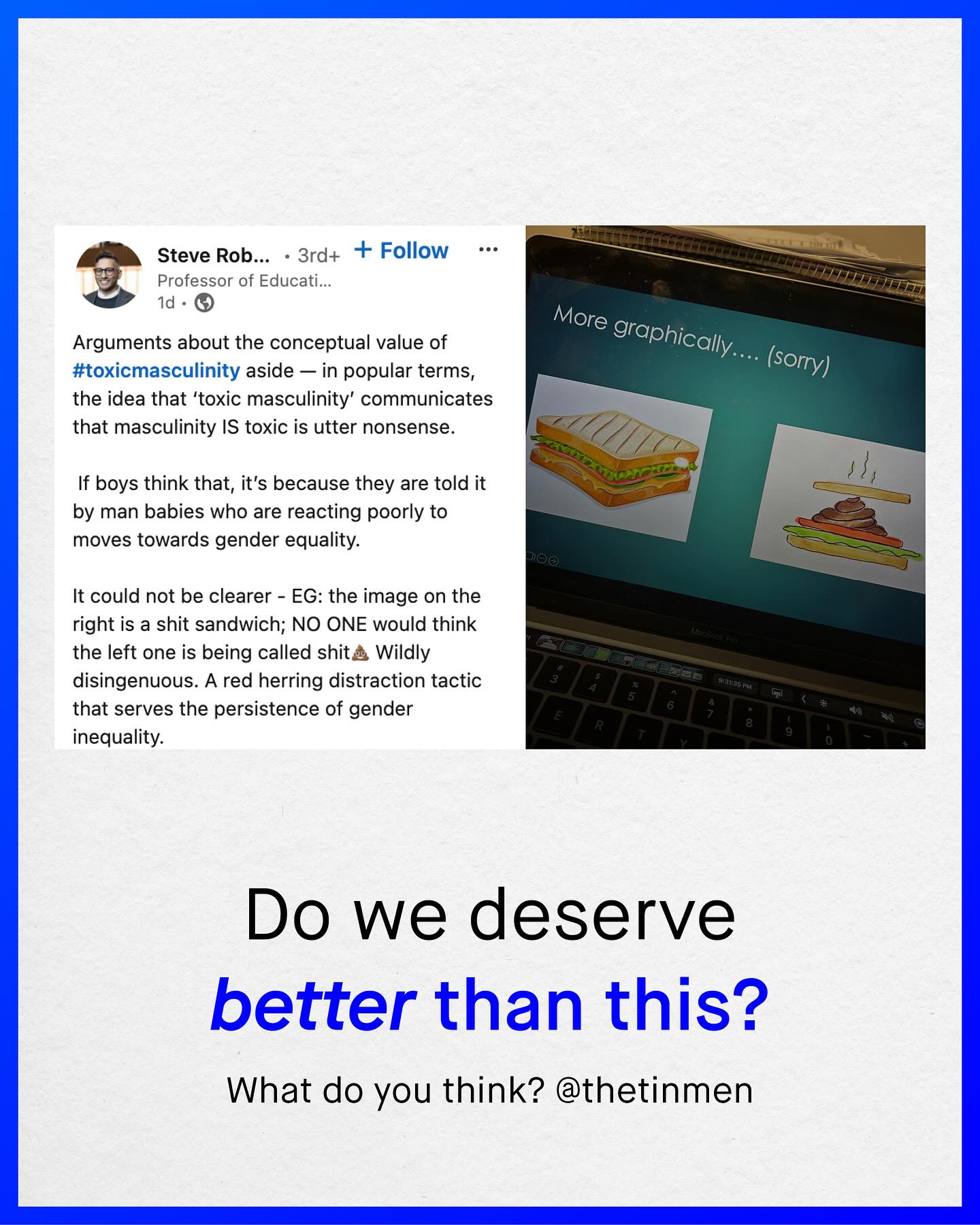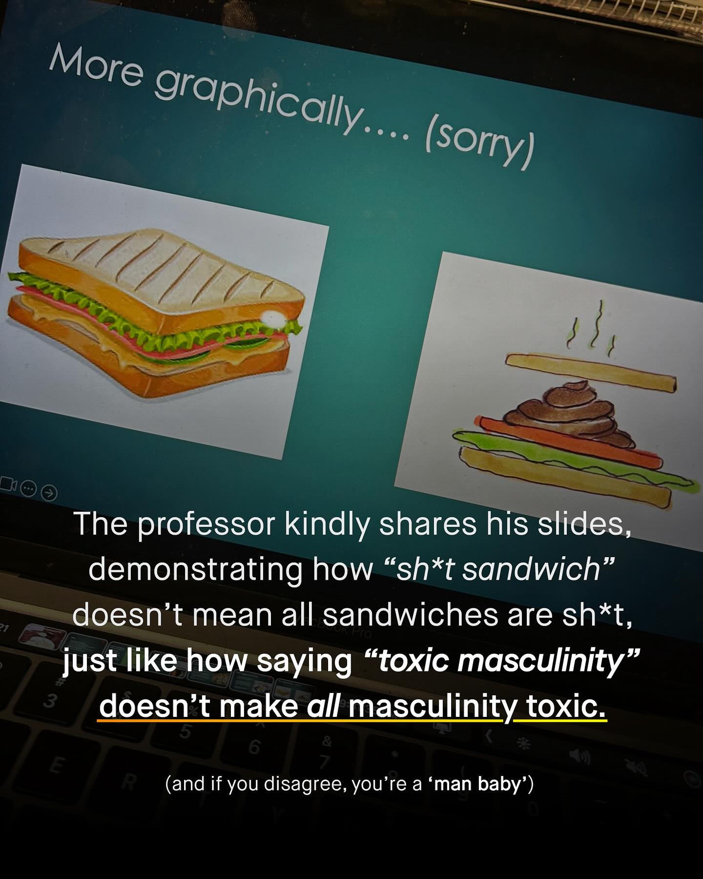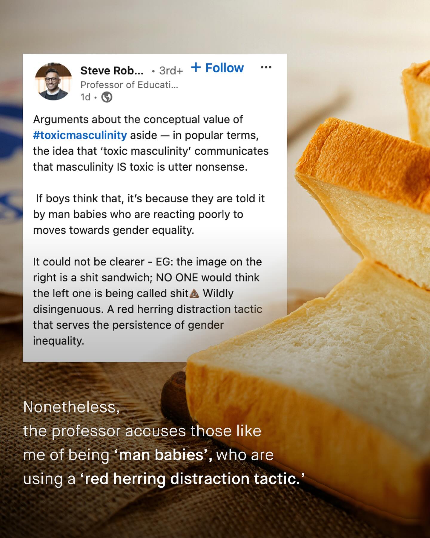 Welcome to the internet, where there are many truly awful people, saying incredibly dumb things. Sadly, much of this is unavoidable, and simply part and package of social media Yup. Naivety, entitlement, and stupidity are woven deeply into the fabric of society, and a burden we must all put up with, and try to mitigate. But there has to be a line drawn. And when is see professors, academics and PhDs blabbering their own kind of nonsense, burping out anti-male rhetoric, and accusing those who disagree of being ‘man babies’, the gloves have to come off. For there is no one I hold a lower opinion of, especially those in clinical spaces, who hold these views whilst working directly with vulnerable men and boys. Because they should simply know better. Here is just one of them. This man is a professor, and he still seemingly cannot wrap his head around why comparing a human being, to two slices of bread, with cheese, butter and lettuce, smeared with shit, could be offensive. Such a man with all his paper accolades, and golden handshakes, has clearly learnt nothing from the decades of dehumanising, and objectifying thought experiments that women were subjected too. So here is a post just for you. Explaining simply why ‘toxic masculinity’ is entirely inappropriate, and insulting, and comparing such a concept to excrement on bread, does very little to ameliorate that. To such people I say: grow up. Conduct yourself in a way even remotely close to that expected of a professor; or failing that, just try to be a grown adult, and a good human being, and not some infant who’s somehow gotten hold of his parent’s phone. So is this the kind of advocacy you want, and that boys need? Sh*t andwiches. God damn. - Images by Charles Chen