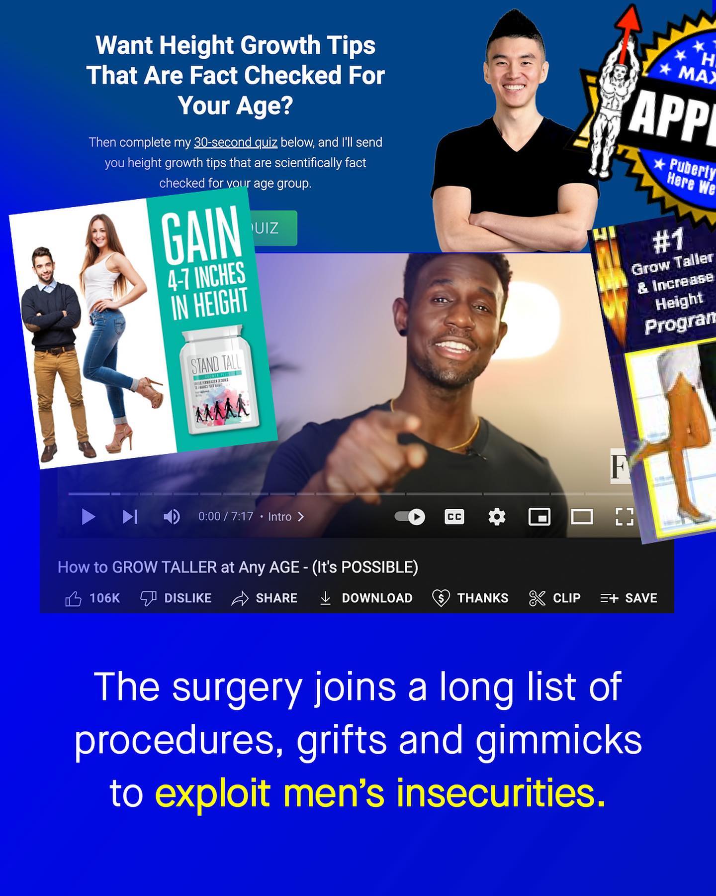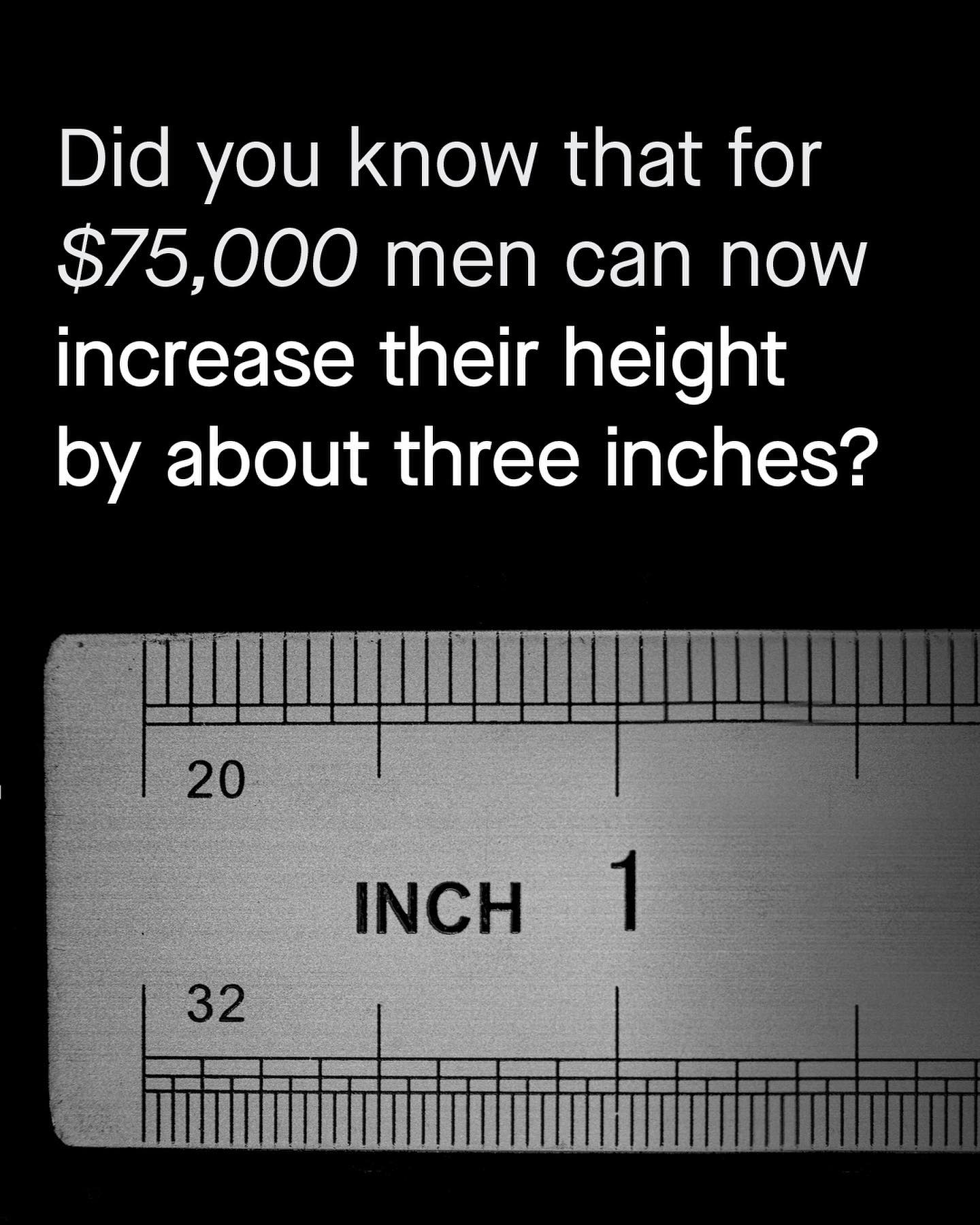The face of cosmetic surgery has changed remarkably; transforming into a billion dollar industry of bum lifts, botox and boob jobs. Us men have sat on the sidelines, watching our women become embroiled in so many exploitative surgeries they do not need, and likely don’t even want – transforming their bodies, into Instagram-filter-style impossibilities. The danger is getting larger, younger and more difficult to differentiate. But now, is it men’s turn? Has the cosmetic machine turned its eyes to our insecurities? Ones of length, breadth, hairlines and of course, height? Let’s talk about a surgery that is not new, but has suddenly become very popular in ways for which it was never intended. A procedure where your legs are broken, stretched and healed… for a few extra inches. Let’s look at limb lengthening surgery. ~ Images courtesy of GQ Study, Height and Dating The Atlantic, Height and Salary #bodypositivity #shortkings