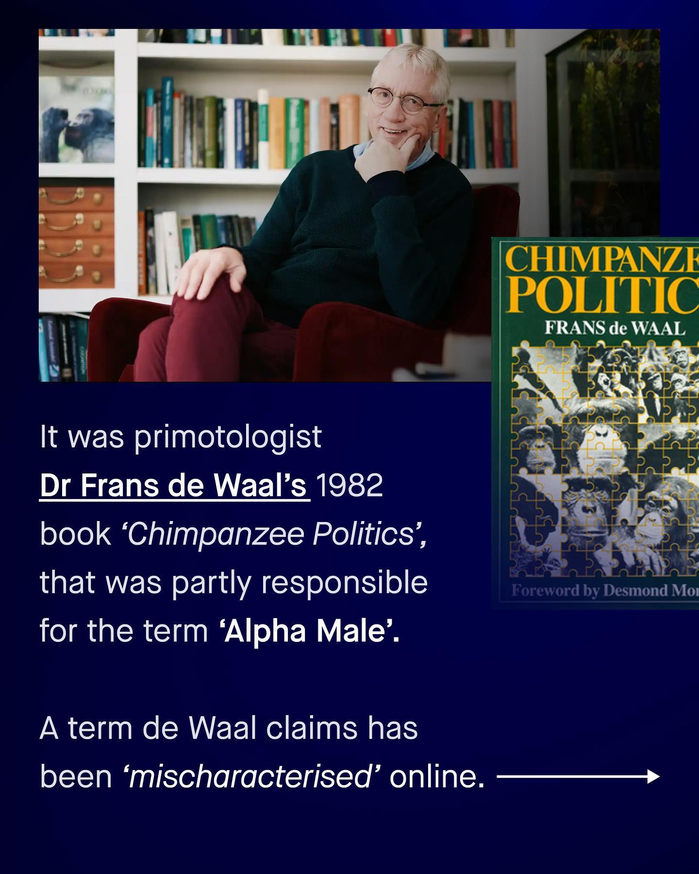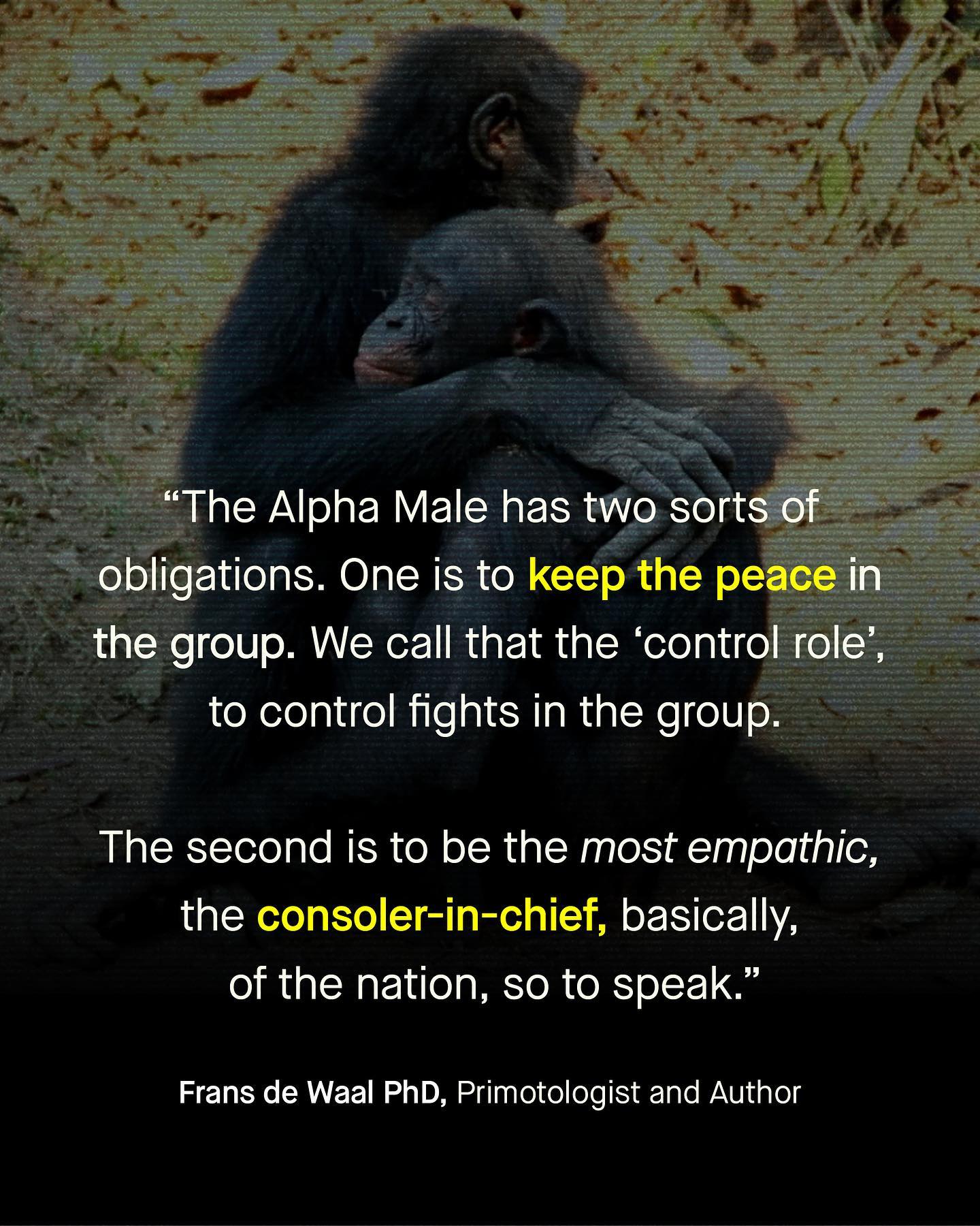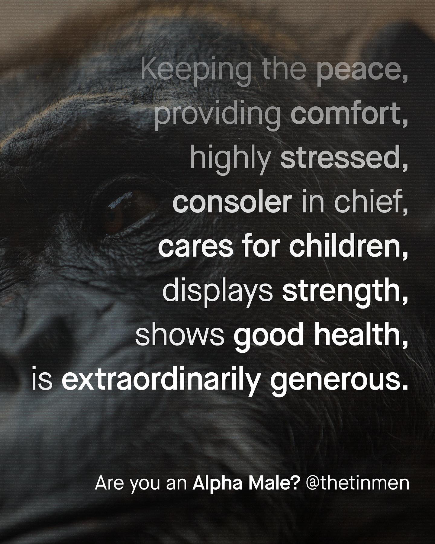 Whether it be from the plethora or ‘business’ books, or shouted from the window of a Bugatti, the industry of helping men be more ‘Alpha Male’ is booming. These voices may claim to speak for the next generation of ‘high value’ men, but it’s a worldview I find as regressive and unhelpful as calling men ‘patriarchal’ or ‘oppressive’, or ‘toxic’, or ‘fragile’. Yes ‘Alpha Male’ is just another shallow term to appropriate maleness. To many, an Alpha Male is a rich and powerful man, who is able to dominate and assert himself financially. It is used as widely as it is wrongly, to basically describe obnoxious, arrogant and superficial men, as some kind of role model. But the reality of Alpha Males, at least in how they appear in the animal kingdom, tells a different story. In Chimpanzees, our closest relative, Alpha Males are actually extraordinarily generous. And whilst they are strong and show good health, the are also characterised by their acts of compassion, and gift giving. They are compassionate. Showing the highest amount of empathy of all chimpanzees, even higher than alpha females. Winning support and respect from peers through showing kindness to children, acting as both impartial peacekeepers of the group, and the ‘chief consolers’ within chimpanzee communities. They are not bullies, that post loud and annoying TikTok’s. So what can we learn about Alpha Males from Dr Frans de Waal, the primatologist whose book ‘Chimpanzee Politics’ was in part responsible for popularising the phrase forty years ago… ~ TED Talk  Images by Gradienta, Dan Cristian Padure, Matthew Feeney, Ray Zhou, and Clemente Cardenas from Unsplash #alphamale
