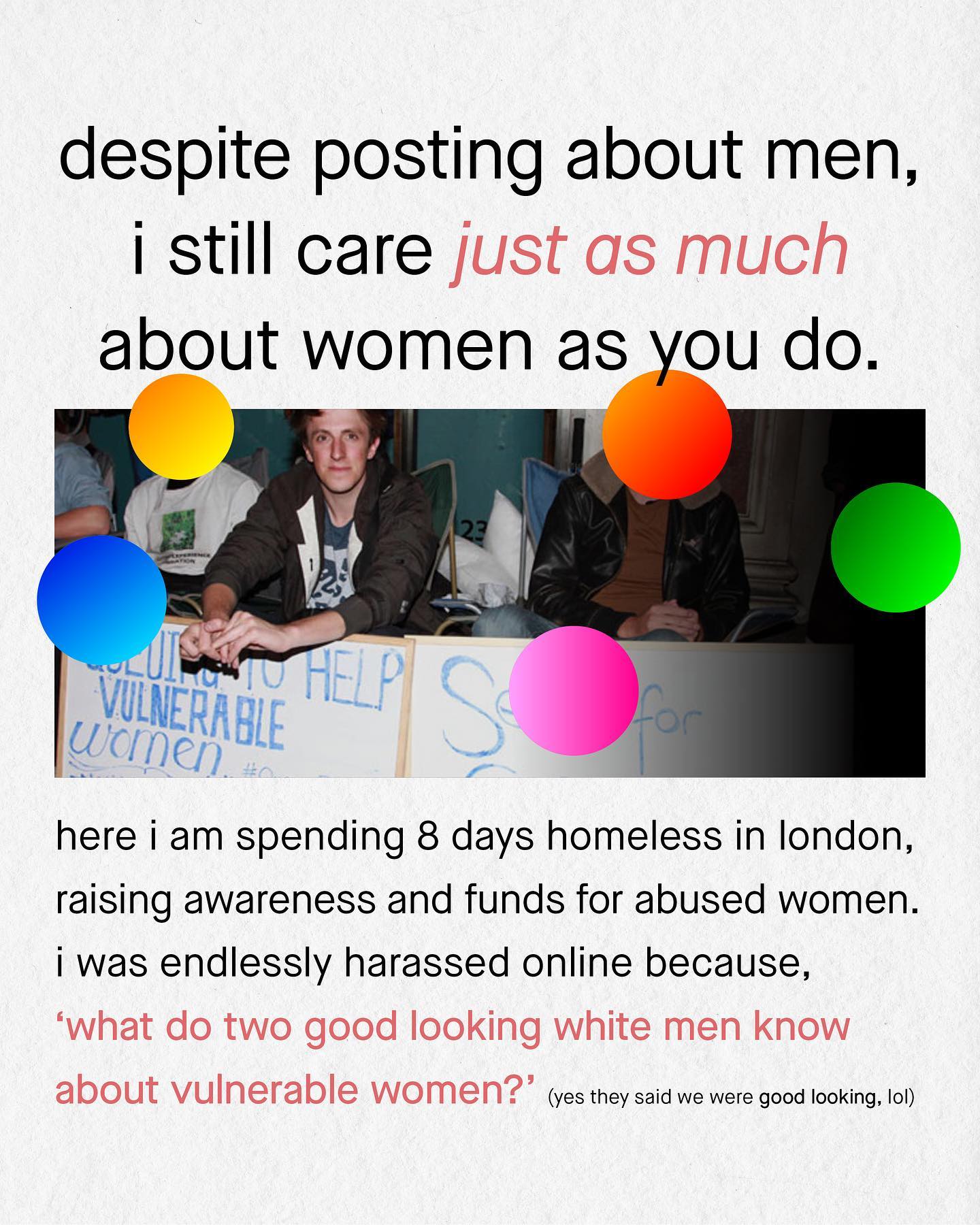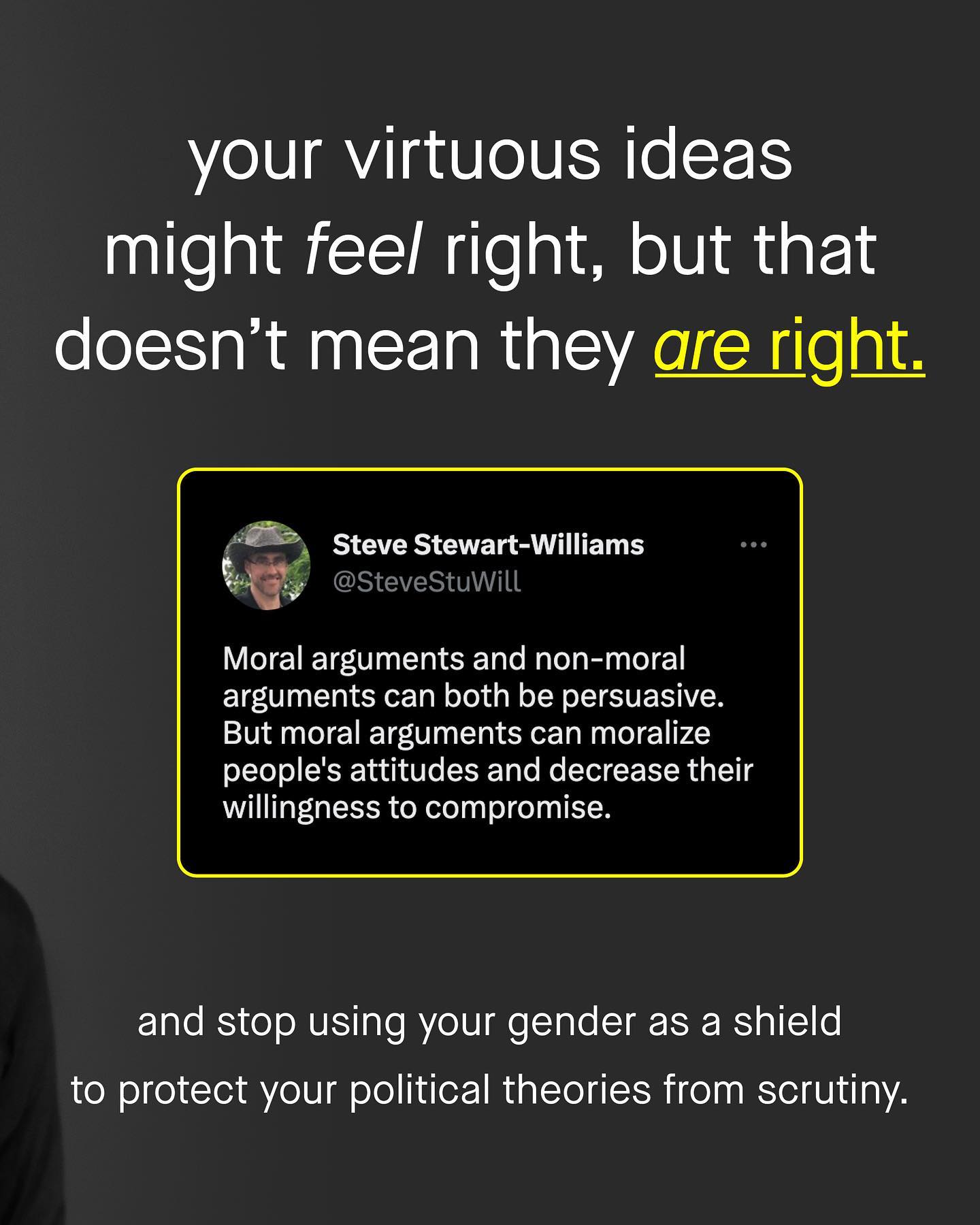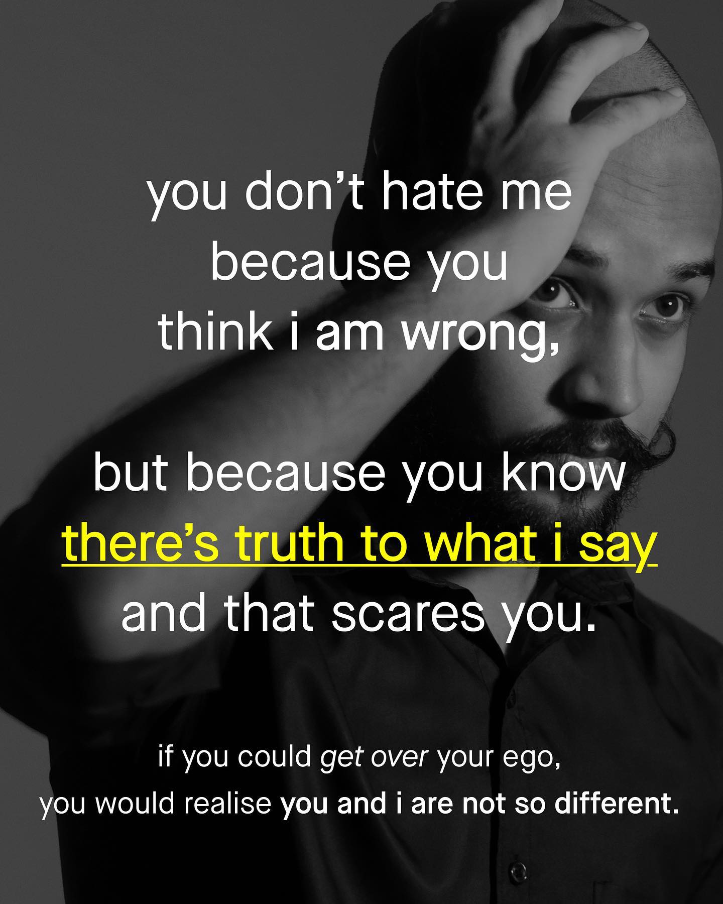 Nobody has been ‘left on read’ more times than me. I’m in the inbox of a hundred people who hate me, asking to talk and understand one another, and almost none of them reply. Why not? If I am so wrong in what I say, so deplorable and ignorant, then what better way to show this than to humiliate me in a live debate? Imagine my face when the wheels finally fall off @thetinmen, and I’m left grovelling at your feet, as you punch the air in victory. I’d never recover. Imagine changing my mind? Do you not vanquish your foes by making them your friends? I hear that these people ‘have better things to do with their time’. Perhaps posting sassy memes or tweeting yourself senseless constitutes as ‘better things’, but to me, nothing is more important than setting an example. Setting an example to my followers, and to yours, of how to have a productive discussion with someone who fundamentally doesn’t agree with me, or like me. Trying to find common ground is something I will always make time for. Because in a world more politically divided than ever; where everyone shouts from roof tops, and nobody sits down to talk, is there anything more desperately needed right now? Until the time to talk arrives, I will not respond to hate with hate, I will not post call outs, or doxx people, as have been done to me. I will not respond to being ostracised, through ostracisation, I will respond with words, ideas and facts. Yes. Too many social media influencers have sealed themselves into their own thick bubble of safety, of validation, and comfort, away from scrutiny, accountability and truth. Too many pat themselves on the back with virtuous ideas, that sound good but mean little, and often steamroller the difficult nuance of detailed discourse. A giant self-congratulatory circle wank has emerged, inward facing and fragile; unable to listen, and unwilling to accept any fault, foible or flaw. So to you, that quiet voice that whispers: ‘maybe I’m not hero of the story after all’, please listen to it, if not for my benefit, then for you own. Can we do better than this? ~