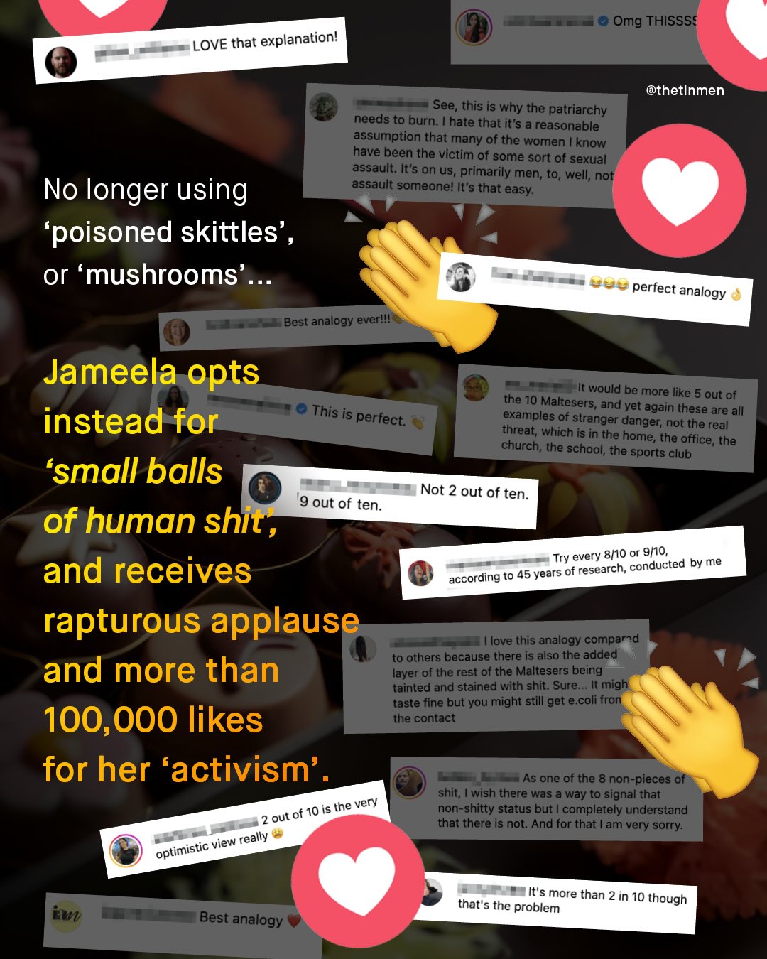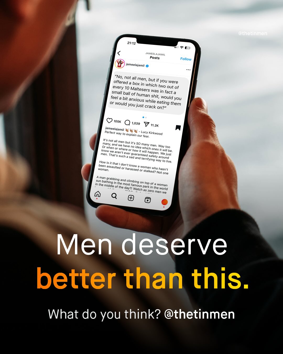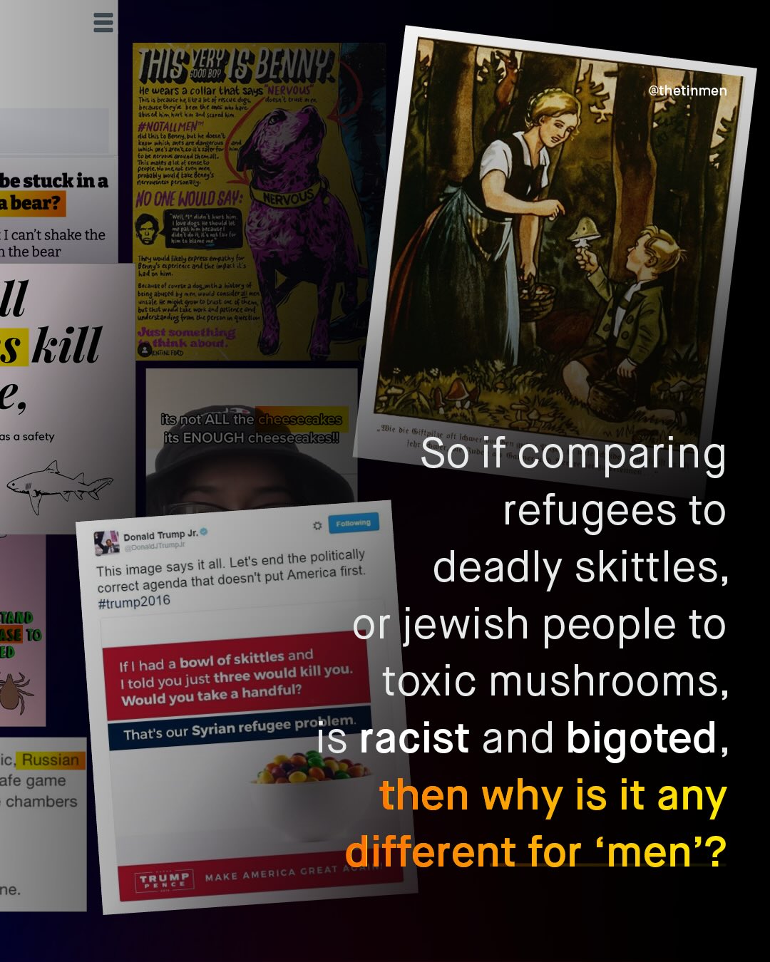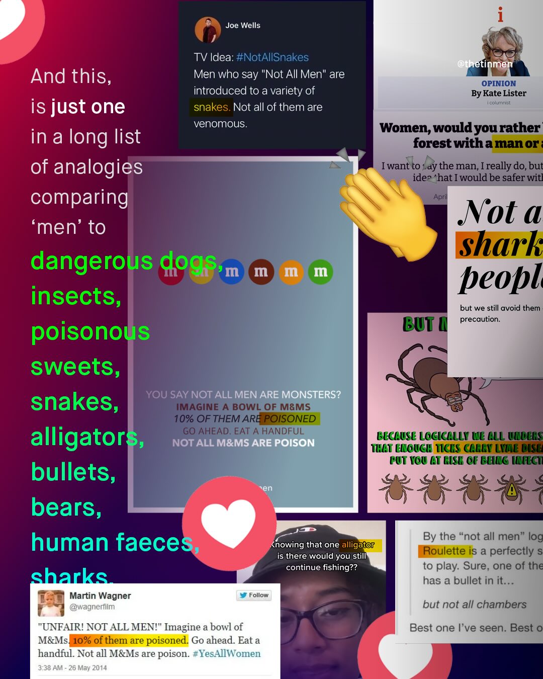 Men are not sharks. They are not ticks with Lyme disease. They are not snakes, rabid dogs, alligators, bears, bullets, insects, or sweets laced with cyanide. And no… They are not ‘tiny balls of human sh*t’ either. I understand there are many men out there who have caused immeasurable harm to women. Far too many men. But whilst you are perfectly within your right to hate those individual men, nothing entitles you to class hatred against “men” as a group. As a society, most of us have learnt this lesson when it comes to other groups; and we are horrified by the danger such dehumanizing language can lead to. And so, the same must surely apply to men too. Throughout history (an even right now) these thought experiments have beleaguered human progress; and whether they are belched from the belly of racist MAGA political figures, printed by anti-semites, or indeed, tweeted out by young, so-called “progressive” feminists, it makes little difference to me. Such views only lead us down and further apart. Such views needlessly turn up the heat, in a space where it is far too hot already. Such views make enemies from allies. And they are not welcome. There is nothing useful or enlightening about them, and they do nothing to further ‘gender equality’; so stop pretending otherwise. Because men are human beings, not inanimate objects, and they are deserving of the same dignity as anyone else would expect. What do you think?