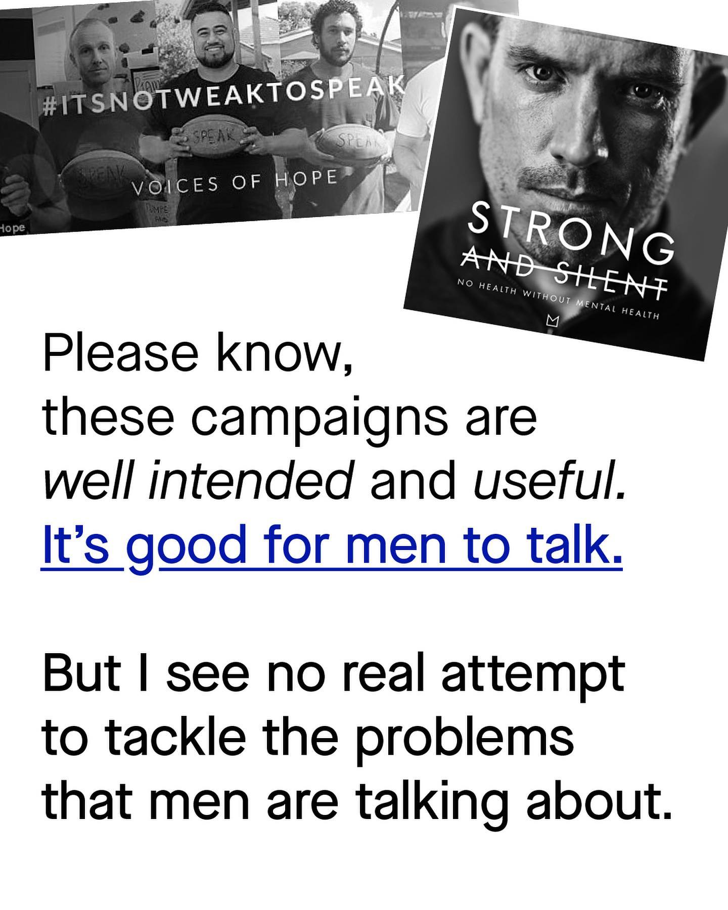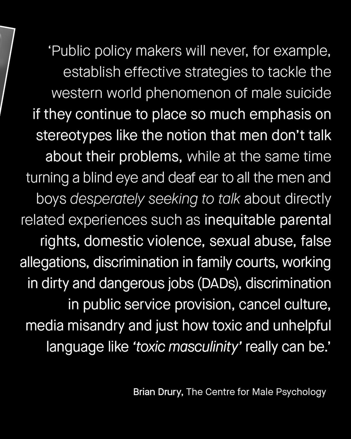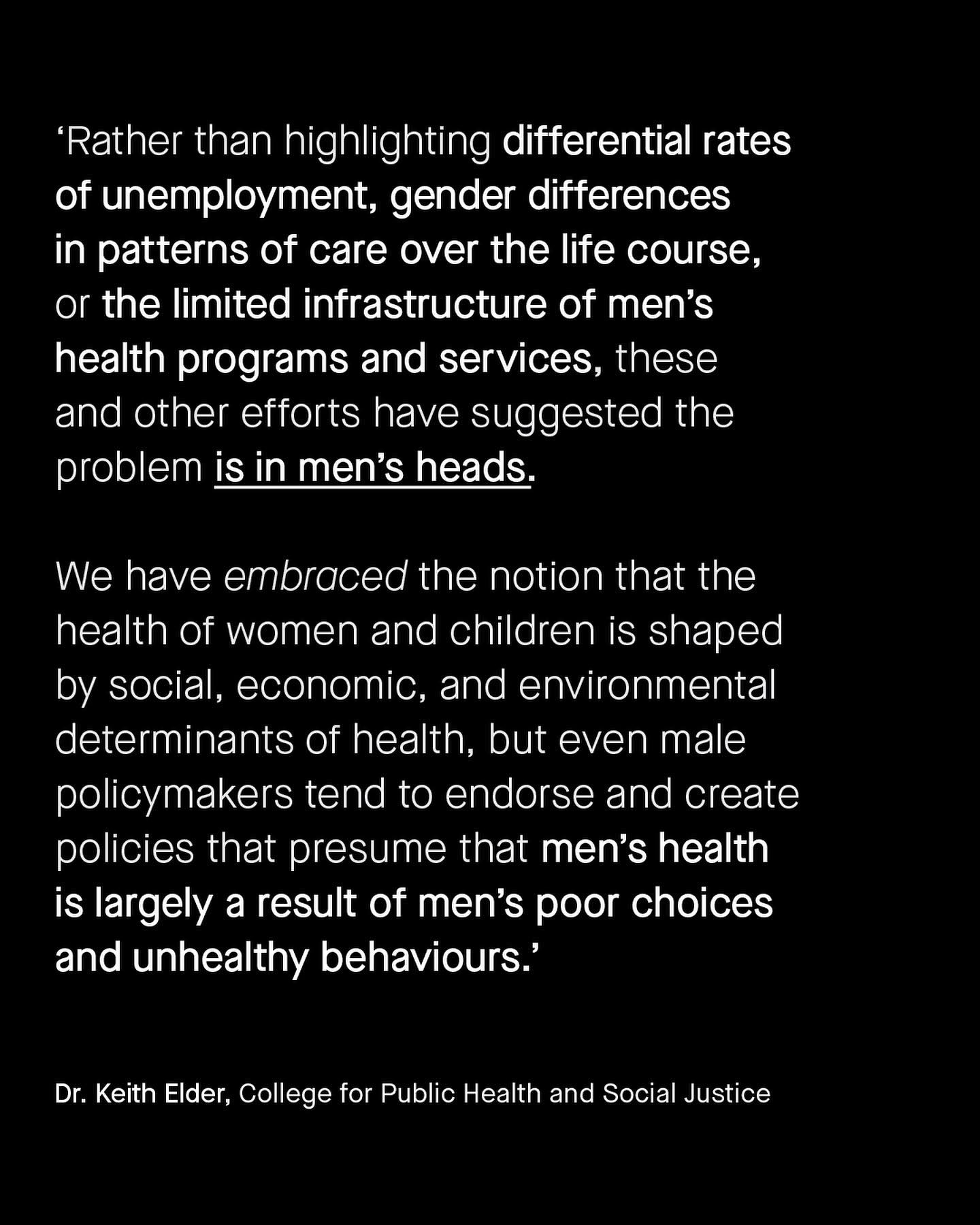 Why does society limit men’s problems to internalised issues, to be solved by a mere change of male mindset? Do we honestly think tears, talk and de-toxification will somehow solve the systemic problems that shape men’s distress? Will they miraculously fix the epidemic of men’s deteriorating physical and mental health, and are these things really a substitute for the infrastructural change we so desperately need? Let’s be real. Society has opened its eyes and ears to the fact that the health and wellbeing of women is shaped by a complex web of intersected socio economic issues. And yet for men, well, their problems are self inflicted, caused by their own poor choices and shitty attitude, for which they only have themselves to blame. “Be less toxic, cry more, open up a little and men will be just fine!“ We don’t do this for anyone else. When women face a problem, we rightly ask: ‘what can we do to change society?’ But when men face a problem, we only ask: ‘what can men do to change themselves?’ It makes no sense. So let’s take a look at how we advocate for men’s health, both physically and mentally, and see how (despite its good intentions) it often fails to address the root causes of the problem. ~ Dr. Keith Elder Dr. Amy Chandler Brian Drury