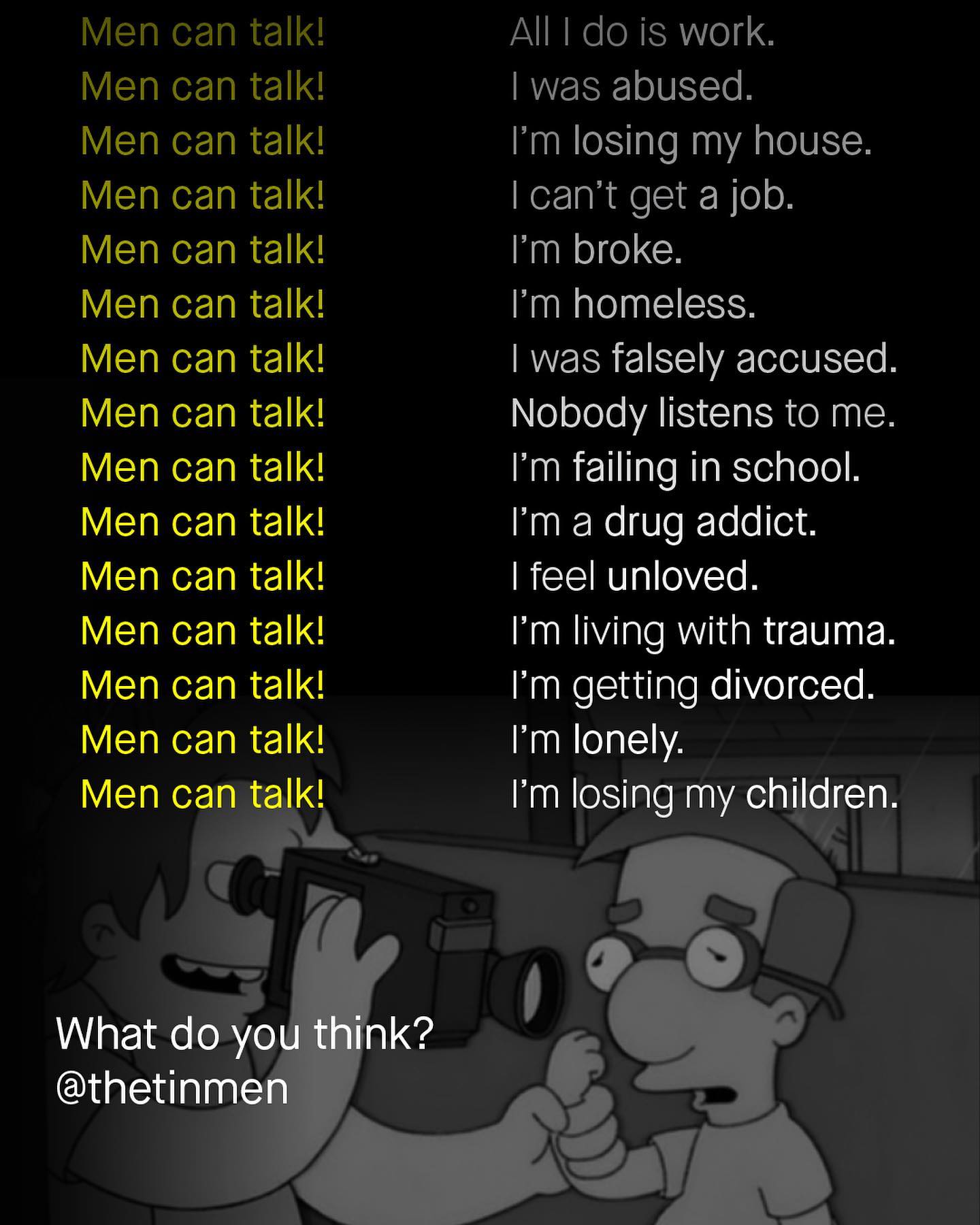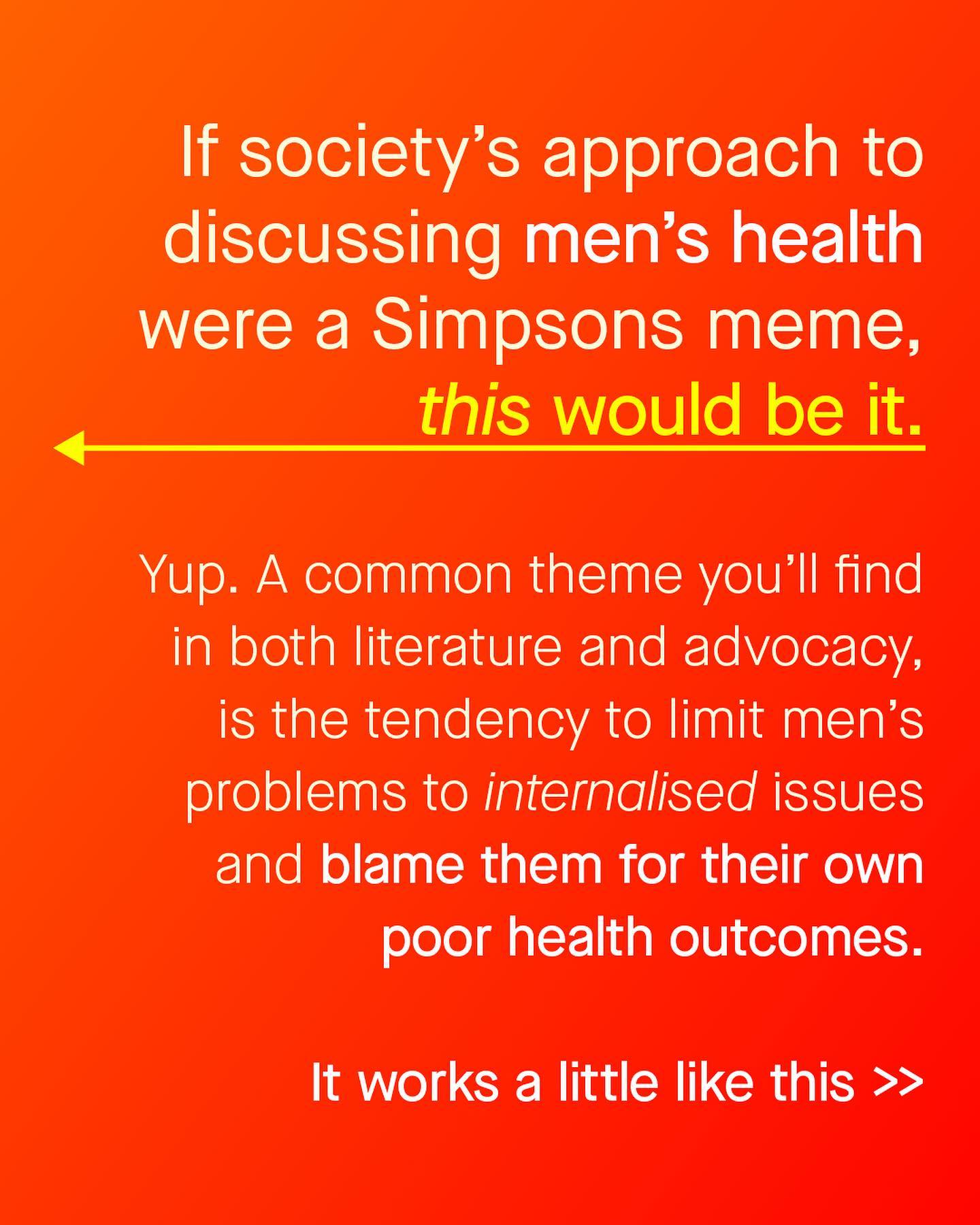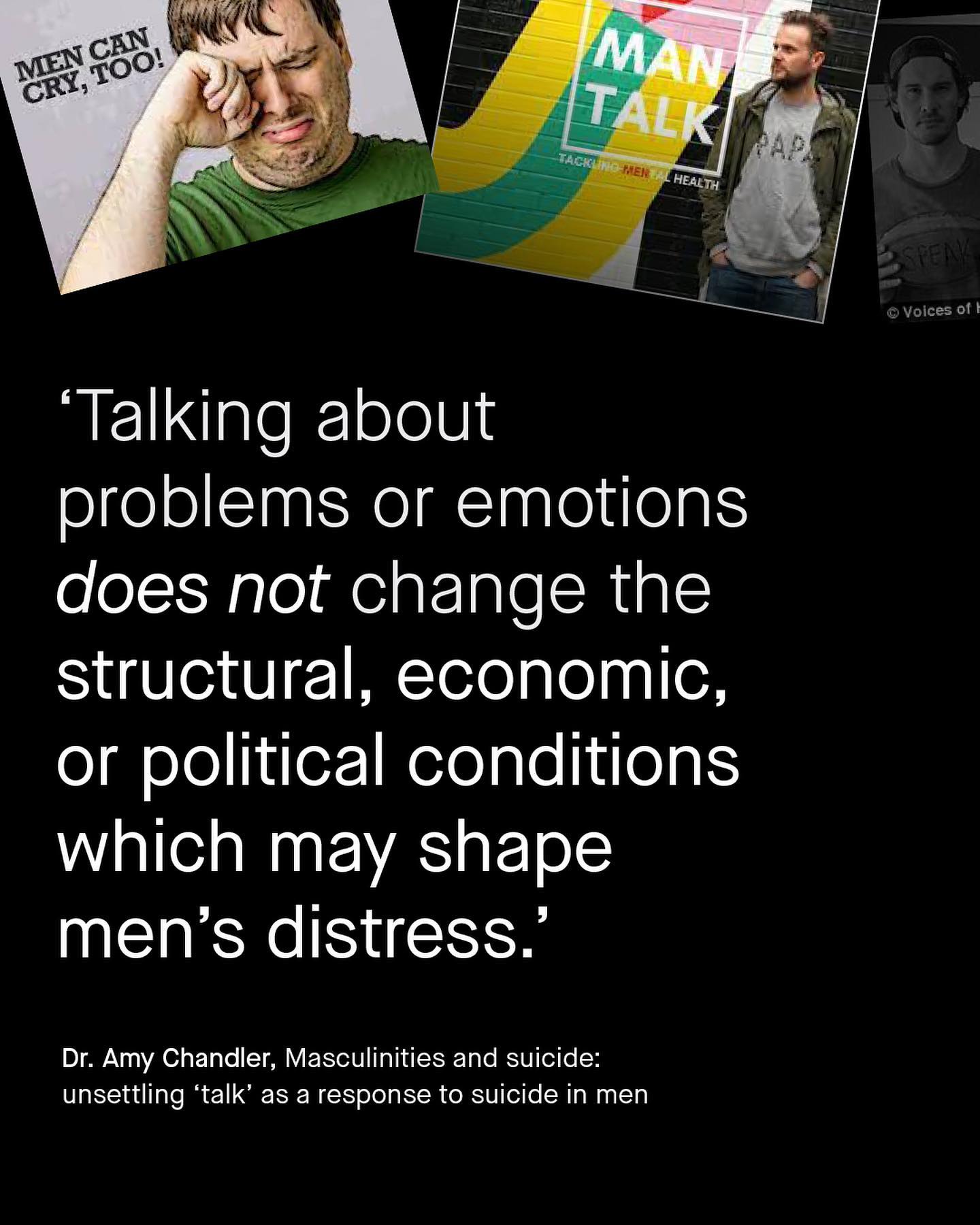 Why does society limit men’s problems to internalised issues, to be solved by a mere change of male mindset? Do we honestly think tears, talk and de-toxification will somehow solve the systemic problems that shape men’s distress? Will they miraculously fix the epidemic of men’s deteriorating physical and mental health, and are these things really a substitute for the infrastructural change we so desperately need? Let’s be real. Society has opened its eyes and ears to the fact that the health and wellbeing of women is shaped by a complex web of intersected socio economic issues. And yet for men, well, their problems are self inflicted, caused by their own poor choices and shitty attitude, for which they only have themselves to blame. “Be less toxic, cry more, open up a little and men will be just fine!“ We don’t do this for anyone else. When women face a problem, we rightly ask: ‘what can we do to change society?’ But when men face a problem, we only ask: ‘what can men do to change themselves?’ It makes no sense. So let’s take a look at how we advocate for men’s health, both physically and mentally, and see how (despite its good intentions) it often fails to address the root causes of the problem. ~ Dr. Keith Elder Dr. Amy Chandler Brian Drury