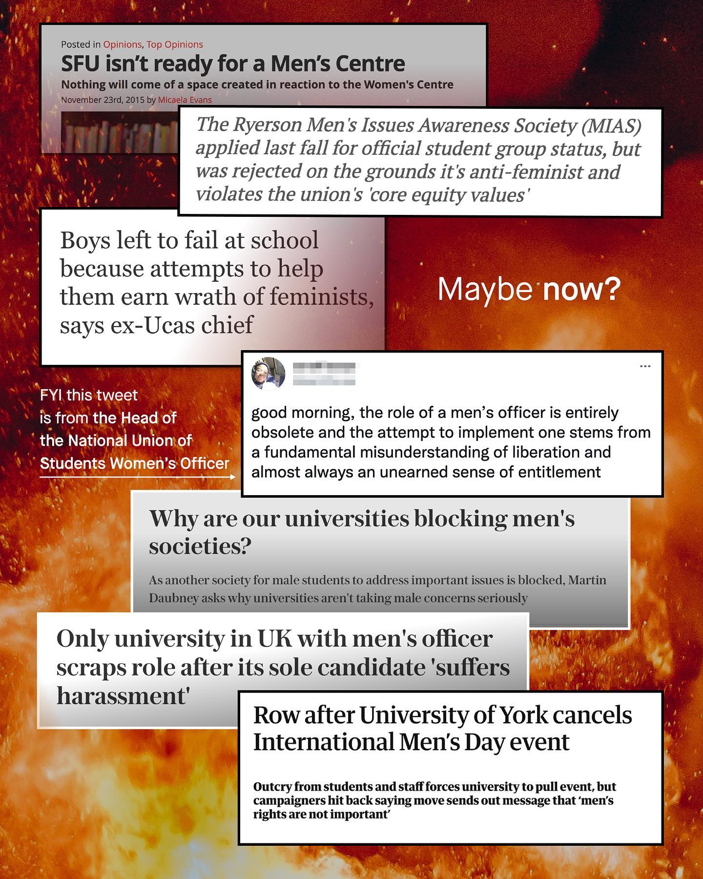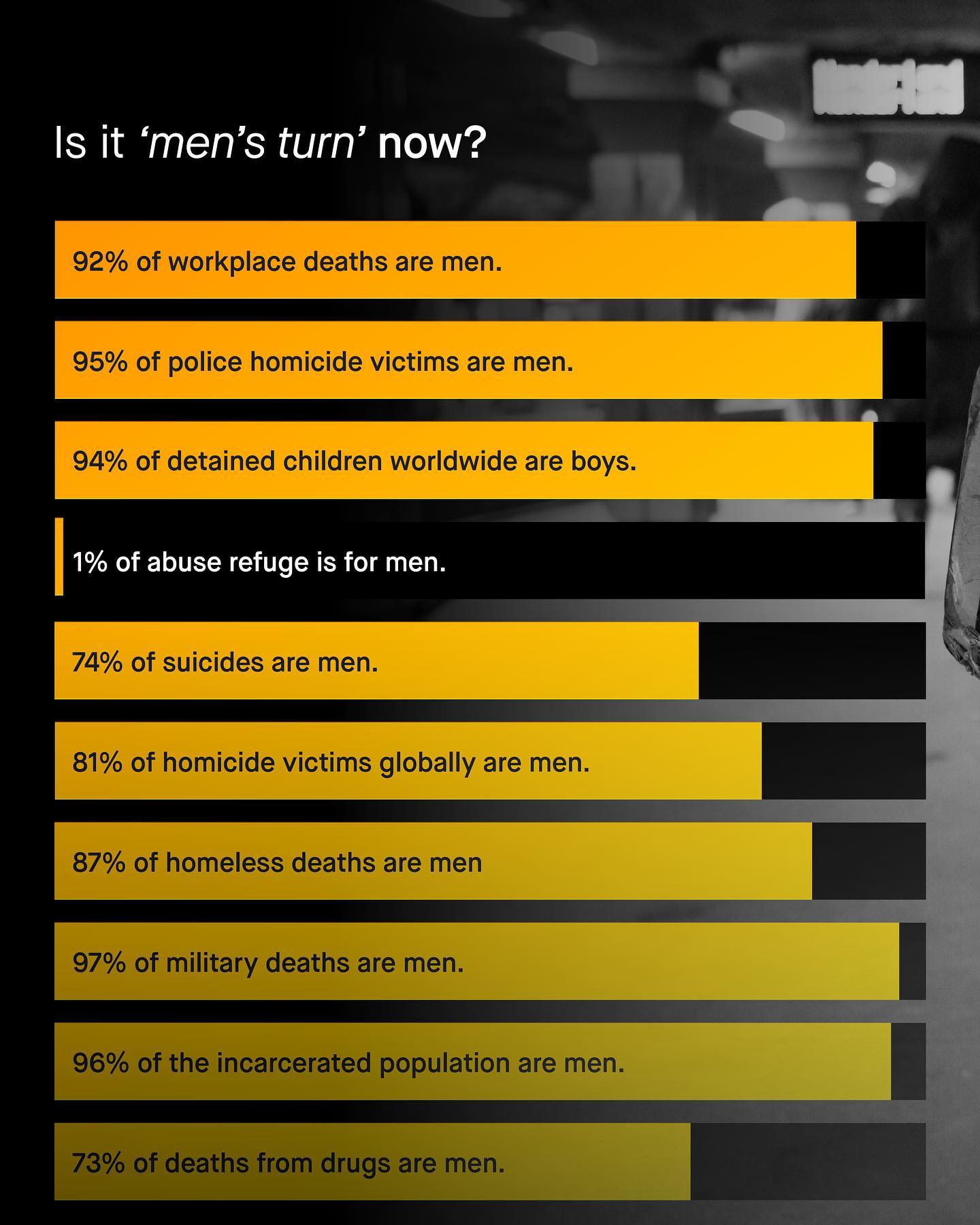 For the 30 or so years I’ve been alive; boys have been failed by schools. Every single year, I see the results come in, and ever year boys fall further behind. And every year I’ve watched nobody do anything. Similarly, I have never known a time where male survivors of abuse are supported, sheltered, or listened to, as female survivors have been for 50 years. I have never known a time where male homeless, those addicted to drugs, or incarcerated, are treated as human beings and with dignity. I have never seen a single ‘International Men’s Day Doodle’. I have never seen a well meaning space for men and boys not be invaded, picketed, and shouted down, by a bunch of warbling idiots calling the whole thing ‘misogynistic’. I have never seen fathers not routinely humiliated on TV. I have never known a time where dads have equal rights to mums. I’ve only ever seen ‘men’ blamed for everything wrong in the world – despite the vast majority of men being good people, and having no role in any of it. I’ve seen people plead with ‘men to talk’, whilst at the same time shrieking and crying, ‘men please shut up!’ Like every man, every day I wake up, and I know the biggest threat to my life is suicide – and yet I see the brave men who are fighting suicide called ‘toxic’, ‘patriarchal’, or ‘privileged’ even, by some of the most ignorant, and privileged people I’ve ever met. I have watched the brothers in my life fall behind, give up, drop out, and let go; betrayed by both left and right; politician, and public alike. And yet, again and again, I am told the conversations I try to foster on this page are not needed; offensive even, and that men have ‘had their say’, and I should go join the back of the queue. ‘Men have had their turn’ I hear. But which men, and when, and what the f**k are you even talking about? This is not Argos, there are no tickets and we can all have a turn, and as far as I’m concerned, men and boys will have a turn too. But what do you think? Did you have a turn? Or did I miss mine? And is it so hard to simply treat ‘the issue’, not the gender? ~ Images by Ilya Chunin, Jakob Owens, Taylor Flo, Christopher Burns, and Matt Collamer.