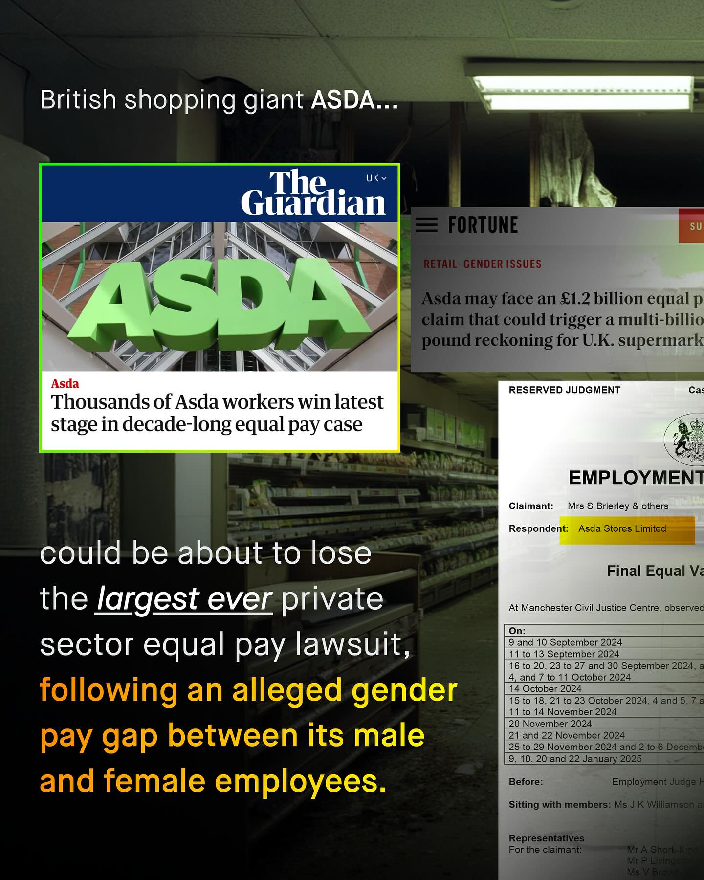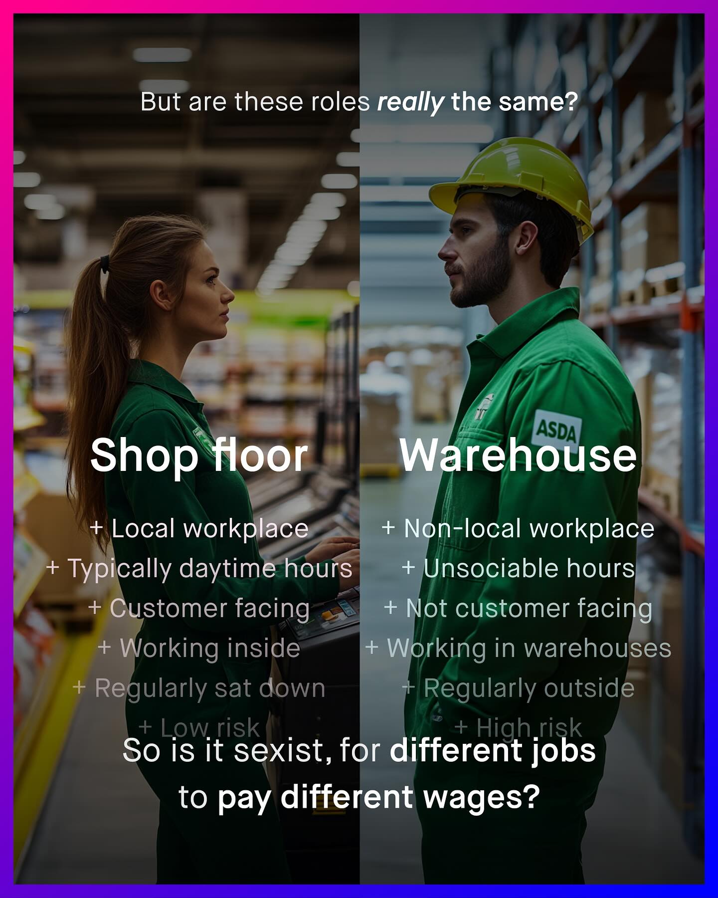 Take the average man and average woman; or if you prefer, the average of all men as a group, versus the average of all women as a group, and…. Men are paid more. Whether it’s 77cts, 80ct, or 90cts to the dollar; we call this the infamous ‘gender pay gap’. Sadly, for so many, the conversation ends there, without ever asking: does the average women get paid less than the average man, because, on average, she makes different decisions to him? Does she, on average, have different interests or priorities? And if the sexes choose, on average, differently, would that not also explain the pay gap too? Well, according to the largest pay gap report in the world; comparing women in the same job, in the same industry, for the same hours, at the same experience level, and function, they are paid the same (well, 99.5 cts to the dollar). So what happens, as it quietly has been within the walls of supermarket giant ASDA; when mostly female employees, working female dominated jobs, want to get paid the same as male employees, working entirely different, ‘male dominated’ jobs? That’s what happening now, as the plaintiffs take one final step closer to a potentially billion dollar lawsuit, and the biggest in private sector history… The question at the centre - Should ASDA shop store workers, get paid the same as ASDA warehouse workers? And more broadly, do we really undervalue women’s areas of work? What do you think? ASDA tribunal documents Korn Perry Pay gap study