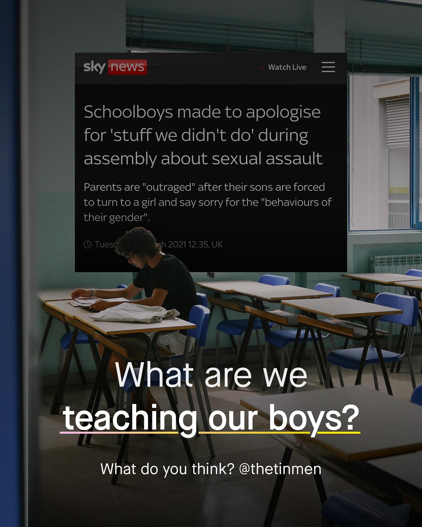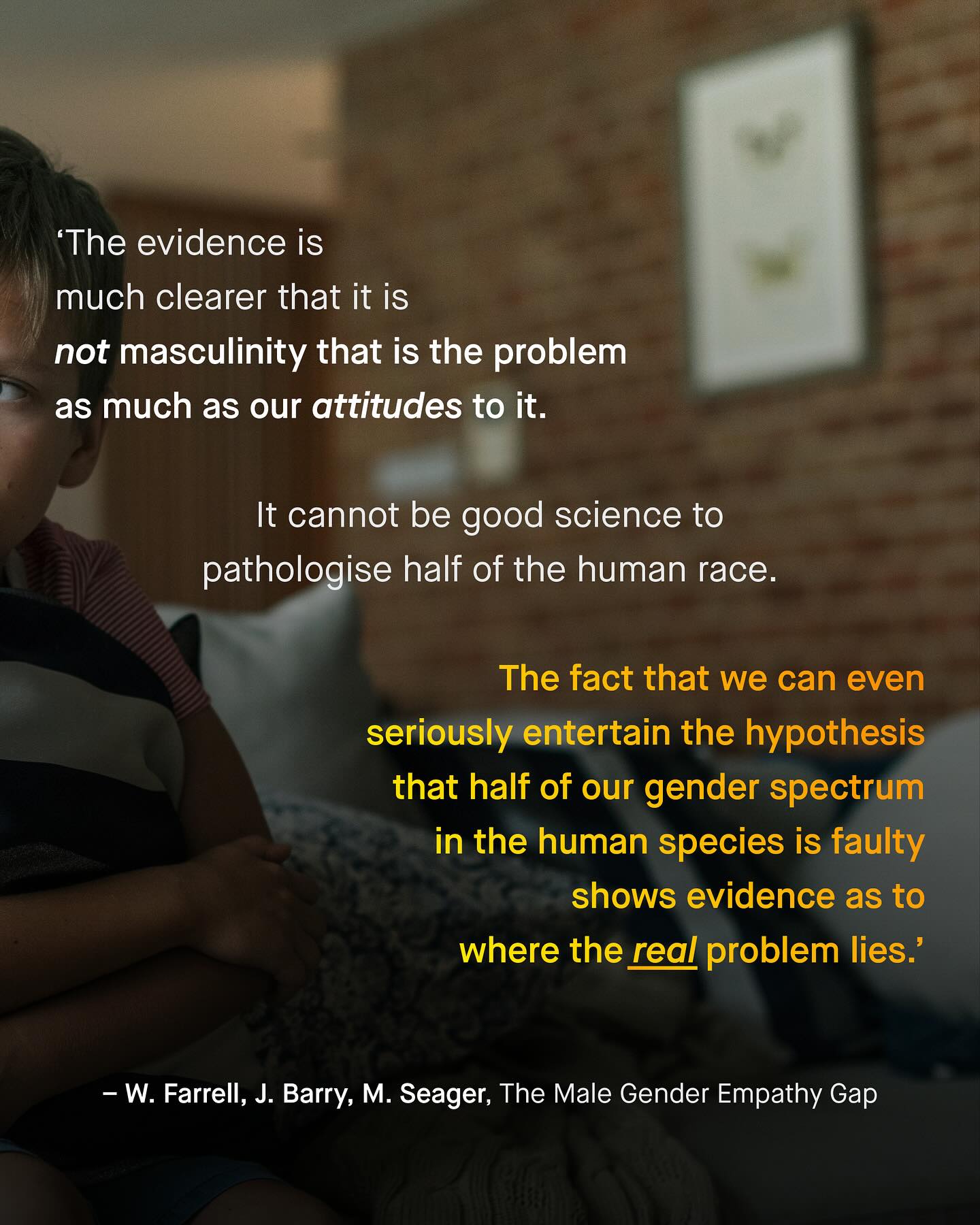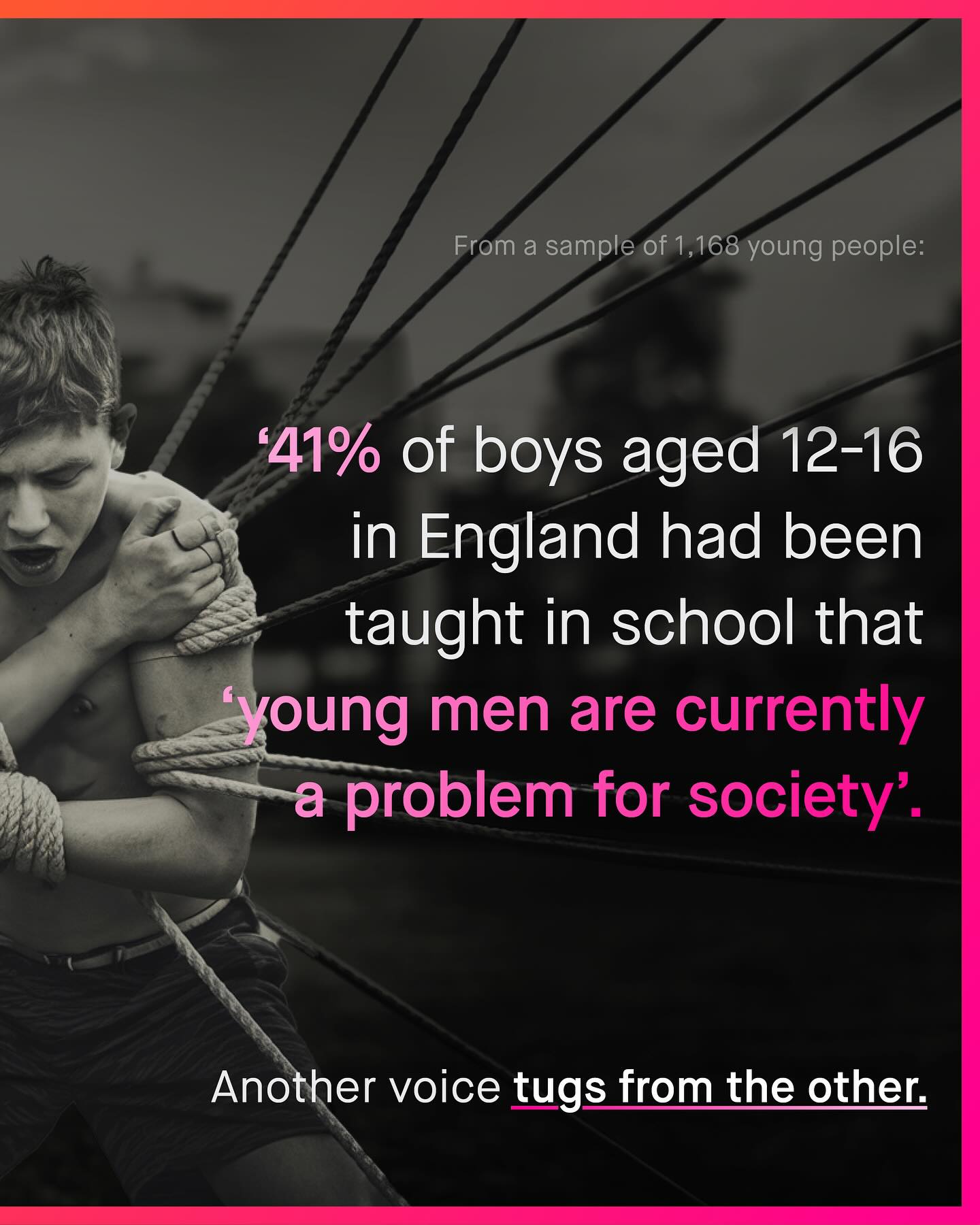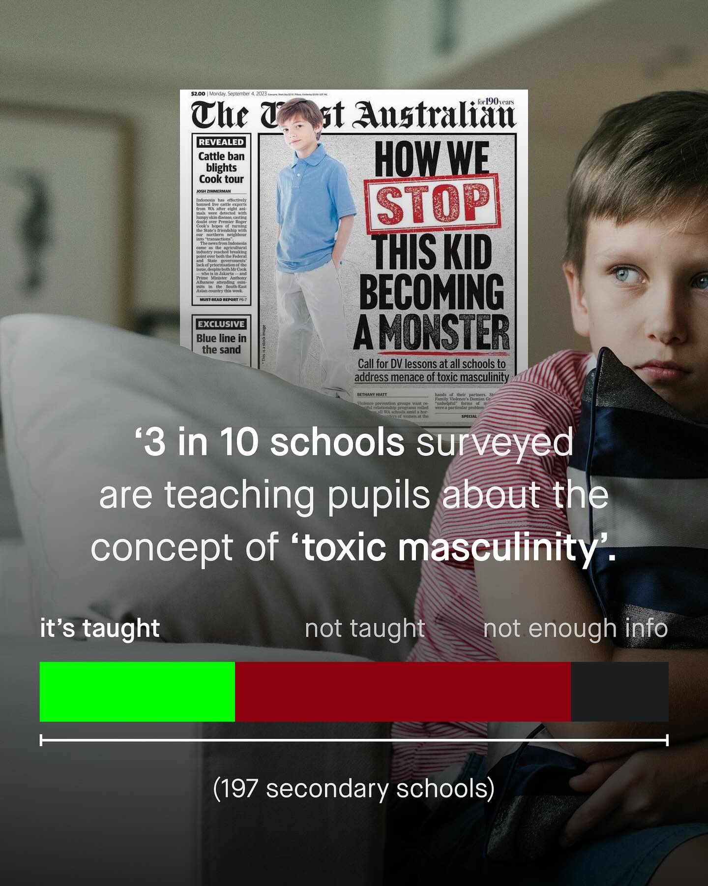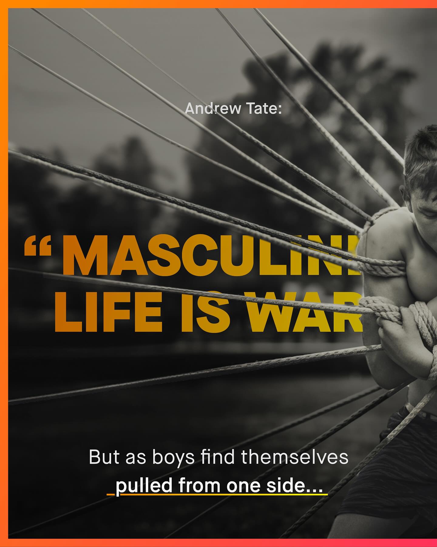 Boys of today are stuck in an ideological tug of war. On one side are those like Andrew Tate, who present narrow, rigid and often harmful archetypes of masculinity. One that values masculinity purely on what it provides, or in how it protects women. To many, it is a disposable, materialistic, and dehumanising view of masculinity; that ought to be consigned to the history books, rather than remixed and repackaged within the bombast of charismatic alpha male influencers. Such a topic has understandably become the latest “hot button” issue in political discourse. But Andrew Tate, and those like him, are not the only forces at play here. For another set of clambering hands has gotten hold of our boys, and yanks them in the opposite direction. This voice fills boys’ heads with a different kind of rhetoric; one that calls him a violent oppressor, a threat to women, “toxic”, problematic, and r*pist in waiting. To them, masculinity is something to be apologised for – and quite literally so. Something to be expunged. Or masculinity is ‘a prison’, I hear. This, and other gibberish, espoused by equally harmful, and no less narrow minded propagandists like @MattXIV. To me, whilst this second set of hands may boast a more fabulous manicure and set of nails; they are no less harmful than Tate’s. No less intent on turning boys into political footballs, to be kicked about for social media currency and clout. And so boys are pulled apart, used as pawns to sell expensive intervention strategies to schools, or as soapboxes, for annoying SJW acolytes. Boys – a group spoken about, but never too. A group told to be everything, other than themselves. So why is this happening? Who’s doing it? And why can’t boys… just be boys? What do you think? ~ 41% of boys Teaching tax masc Images by Vadim Bogulov, Guillia Squillace