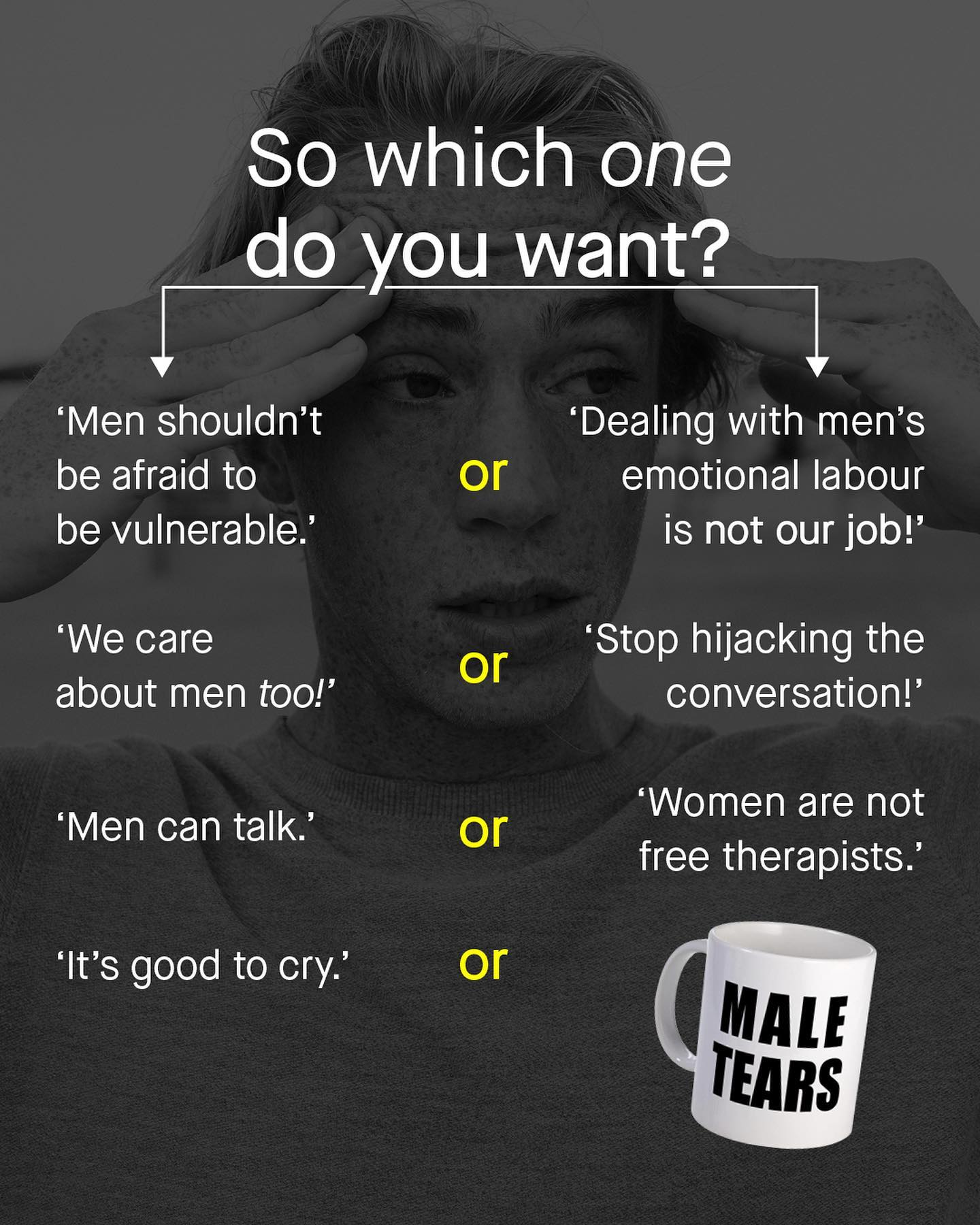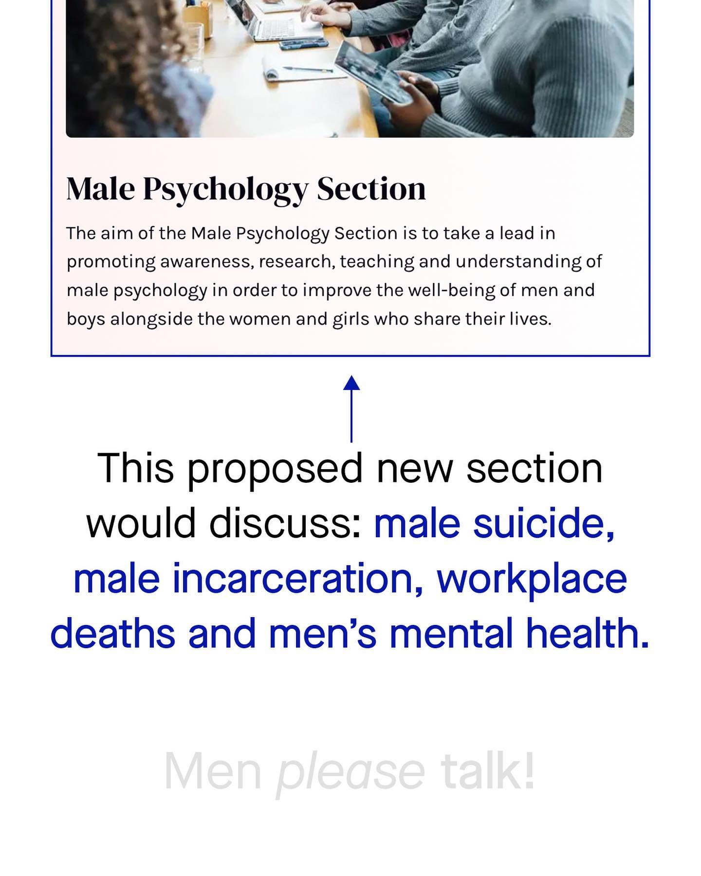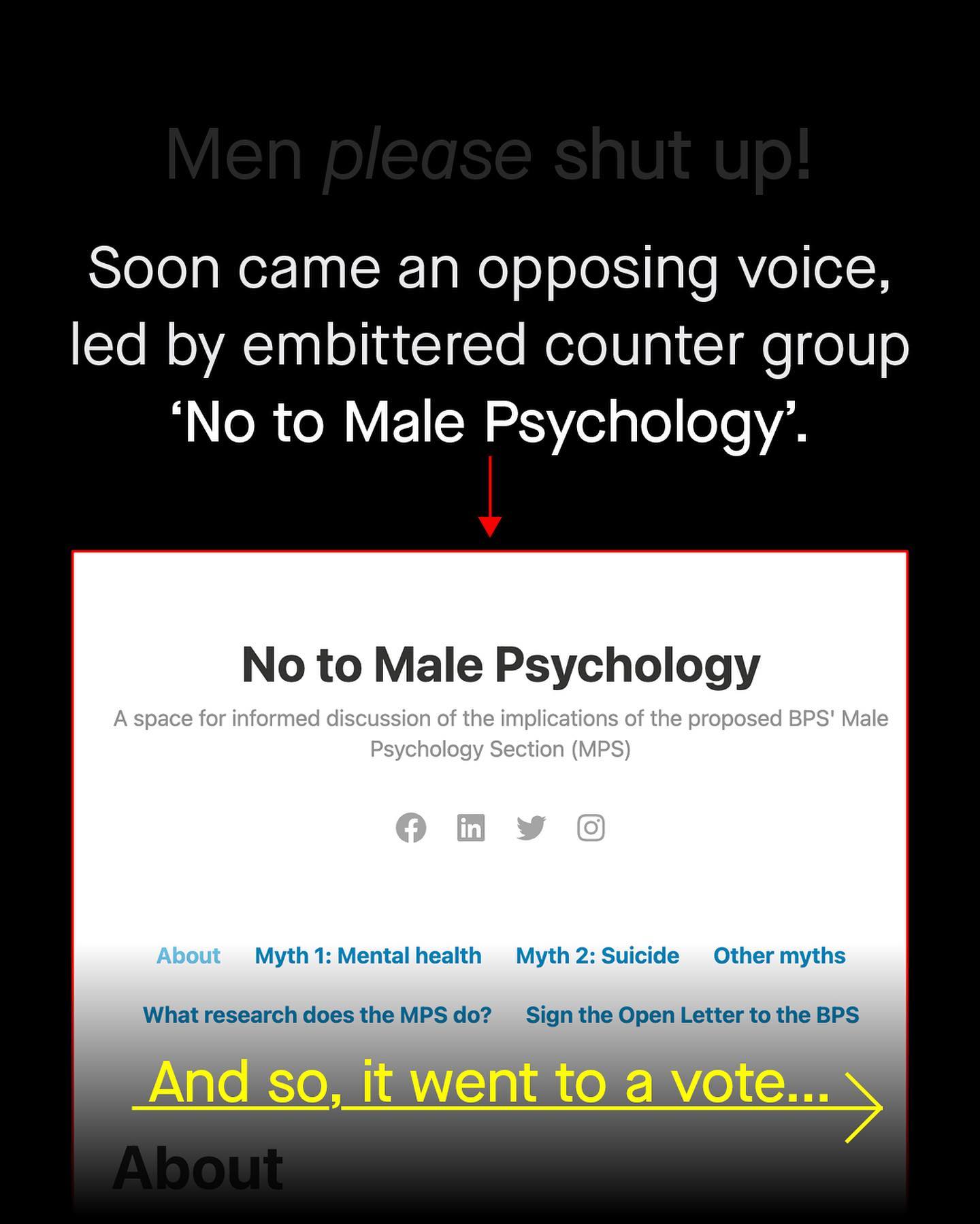 Being a guy in the modern age of gender advocacy, can make your head spin. Some people tell us to speak, others tell us to shut up. I hear men can be vulnerable, but so too I’m told that ‘women are not free therapists’ and men’s emotional labour is not their job. Men crying is encouraged, whilst derogatory ‘Male Tears’ mugs fly off the shelves. But we care about men! But also, this isn’t about you! One hand beckons me in, the other points a finger and accuses me of ‘hijacking the conversation’. Honestly, it’s confusing. And it was in 2017 that these two warring sides finally locked horns in the British Psychological Society, arguing whether the creation of a ‘Men’s section’ to compliment the women’s section was a good idea It was a war of words where unsurprisingly the membership were divided, so it went down to a vote… Let’s see what happened next. ~ Psychology Today article #mensmentalhealth