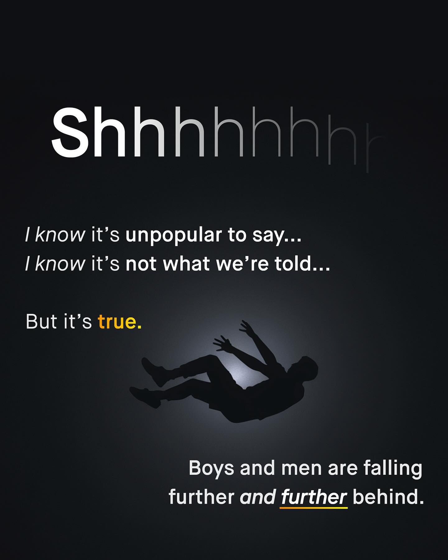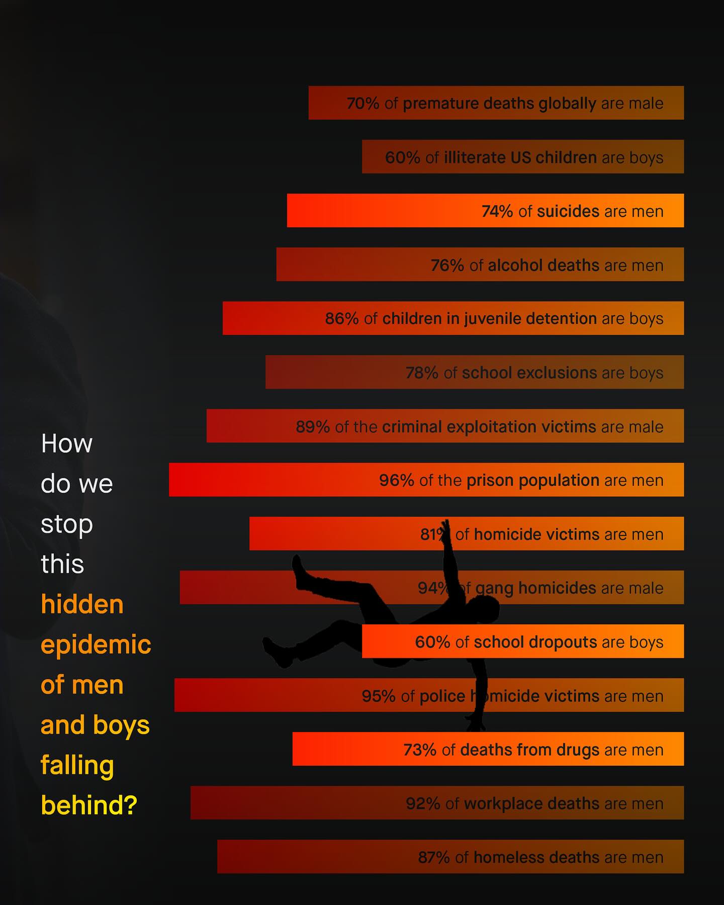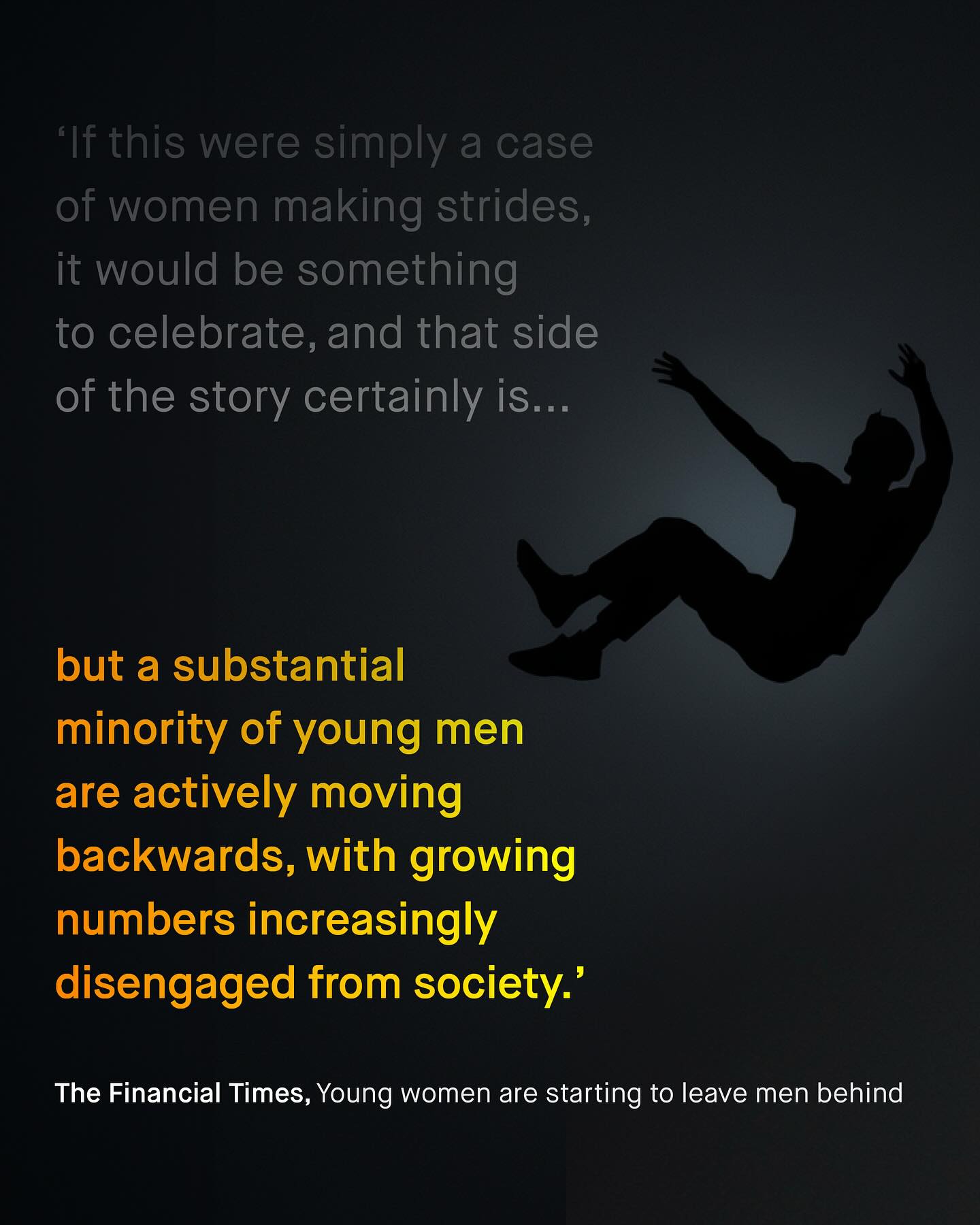 Men and boys fall behind, drop out, give up, and die in darkness; falling into the abyss of public ignorance, political cowardice, and betrayal. They are more likely to die at every age, in every country, and have worse health outcomes than women, in every group. They are behind at every stage of education, and across every demographic group. They are more likely to suffer from addiction, alcoholism, and homelessness; to die at work, and from suicide. More likely to join a gang, to be killed, stabbed, criminally exploited, arrested, or shot by police, More likely to be suspended, held back, or excluded from school; more likely to be illiterate, more likely to be diagnosed with behavioural problems, more likely to be the target of sextortion. More likely to be lonely. More likely to be unemployed, or burdened by long term health problems. To be male is now the single largest demographic factor predicting early death. Any one of these is deserving of a public emergency, and yet the bang of the drum from our noble advocates, falls silent. The kind and brave words for women, that told the world “no more”, is now replaced with brittle vitriol, entitlement, and sneering arrogance. “They did it to themselves” “Who built the system?” “They had their turn!” “Men’s issues don’t exist!” Says the social media brat, whose privileged life and online whines, are made possible by the very men they now lament. There is no excuse good enough to absolve society of how we’ve allowed this to happen. And the misandry and anti-male rhetoric splattered onto the faces of those who have tried to help, will soon become one of our greatest shames. So ask not, ‘why are men and boys behind?’ And instead question, ‘why does nobody care’? What do you think? ~ Wall Street Journal  The Financial Times