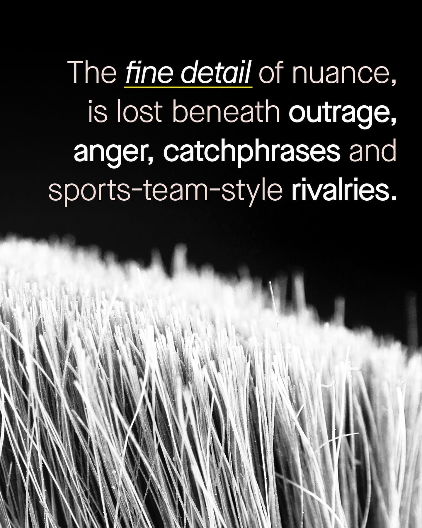 Social media is something we do at bus stops, during ad breaks or whilst we’re sitting on the the toilet. It’s quick, easy and accessible, it penalises long form ideas, does not promote trustworthiness and often rewards provocative, inflammatory statements. These are all bad things, when it comes to political discussion; which needs calmness, complexity and cohesive, transparent ideas. This fall out is felt most of all in the highly emotive issues of domestic and sexual violence, of mental health, and pay gaps; where the already complex discussion, get mixed with painful personal experiences to become both narrowed and super-heated. The result we all know. Discourse without nuance, of bitter personal rivalries and who-has-it-worse arguments. It hurts all people. And at the centre I feel are the all-too-familiar one word answers, to complex issues; that don’t enlighten, but only divide and confuse and distract. So how do we have better discussion, how do we find better words and more useful answers? ~ Images by Luce Nicoletti, Joshua Coleman, Sam Moqadam and Jonathan Borba.