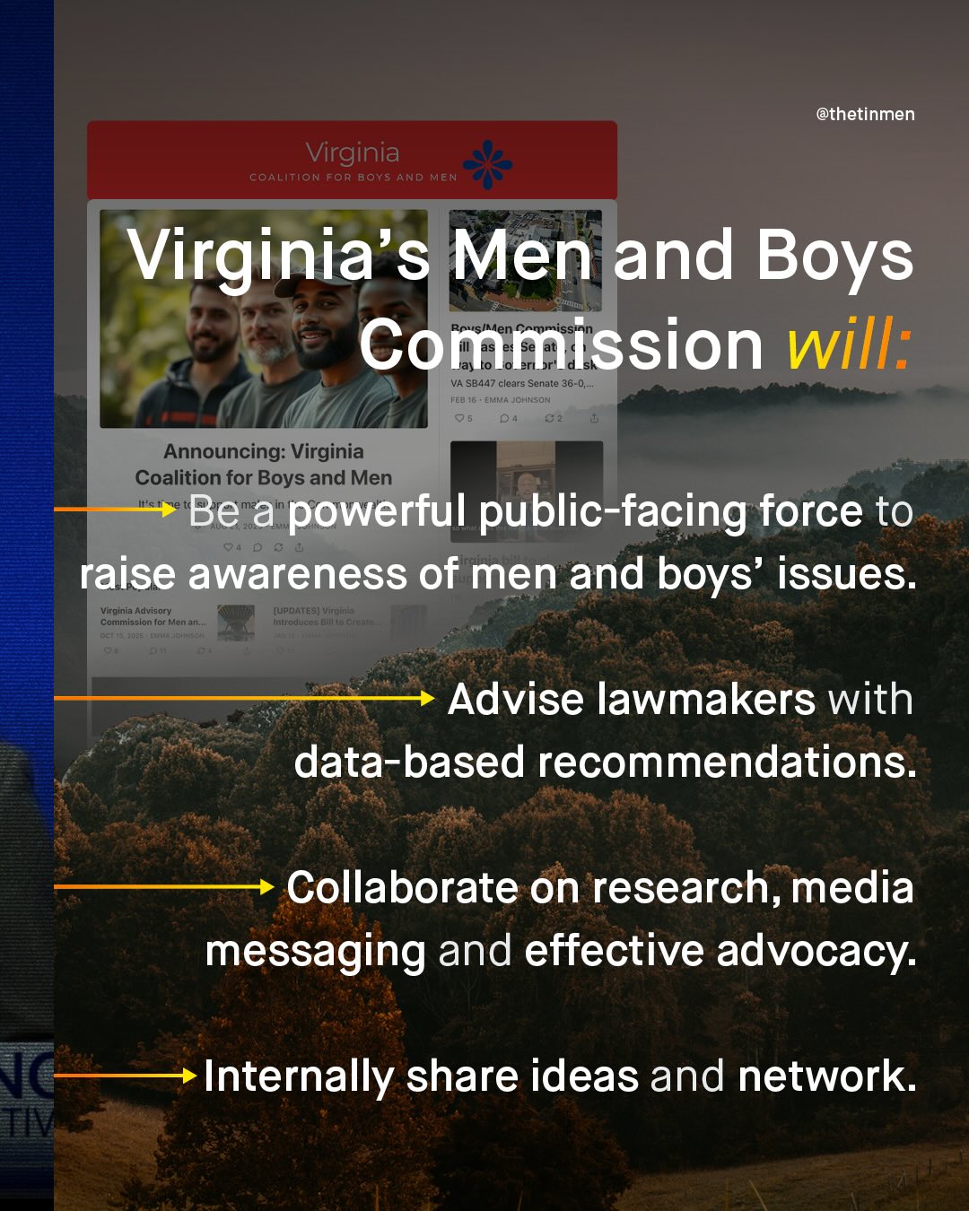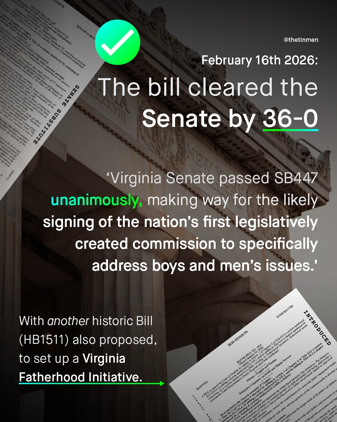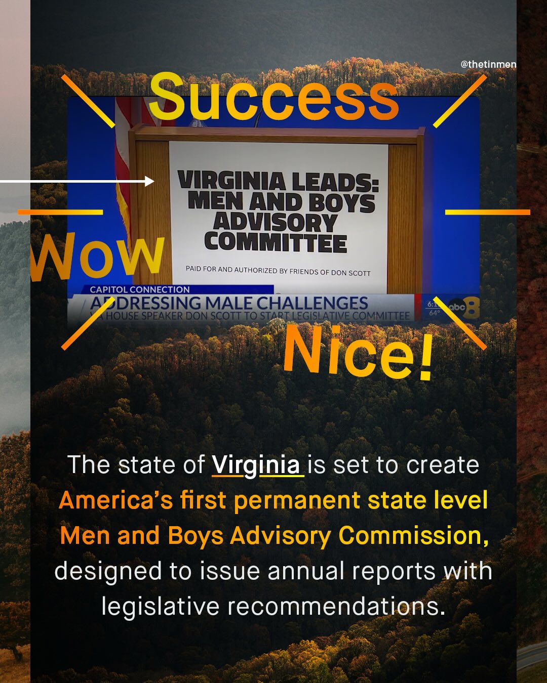 For years now, various groups of brave advocates have been working tirelessly to set up state level commissions for boys and men, to tackle some of the dire issues those across America are facing. Watching from across the pond, it is clear that the struggle has been incredibly difficult, and so often beleaguered by heartache and disappointment. Quite rightly, around 37 states have commissions for women and girls, which is a welcome thing. However not one state has a commission for boys and men; to address male suicide, mens mental health, boys failing education, poor literacy rates, homelessness, addiction, incarceration, fatherlessness, and a whole litany of problems and tragic outcomes, that have been swept under the rug for generations. But this could be about to change… With Virginia turning the final corner, and heading down the final straight, to likely create America’s first, permanent state level commissions for boys and men. And so arrives a piece of unexpected, and long overdue good news; that promises to save, transform and enrich lives across the great state of Virginia. Which will leave 49 states to go. Washington is another notable state that has been working FOR YEARS to do the same, a heroic struggle that too often has failed, even as recently as yesterday, as their most recent bill collapsed. Undeterred, and learning from the success of Virginia, Washington state could soon become the next, followed perhaps by Maryland, California, and who knows who… One thing’s for sure – Times are changing, politicians and legislators are coming out the woodwork in full unapologetic support for men and boys. And Virginia is proof of it. Yes. Success can be achieved, and sooner than you might expect. What do you think? ~ Join the journey at vaboysandmen.org/ And lend your support for Washington State Initiative for Boys and Men at @waboysmen