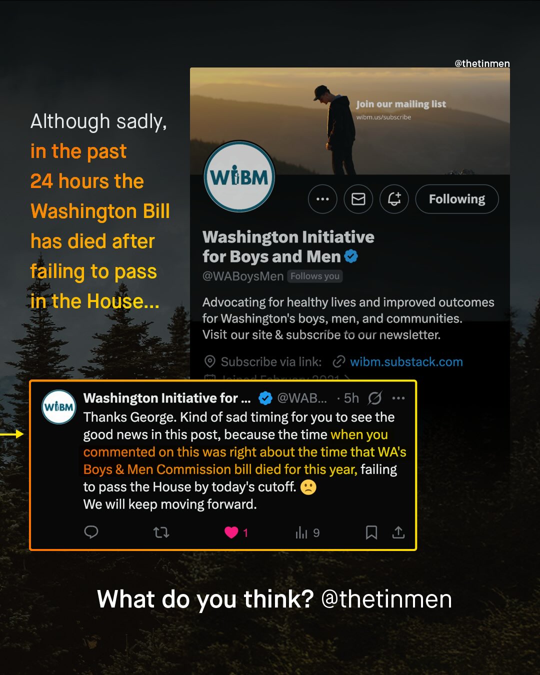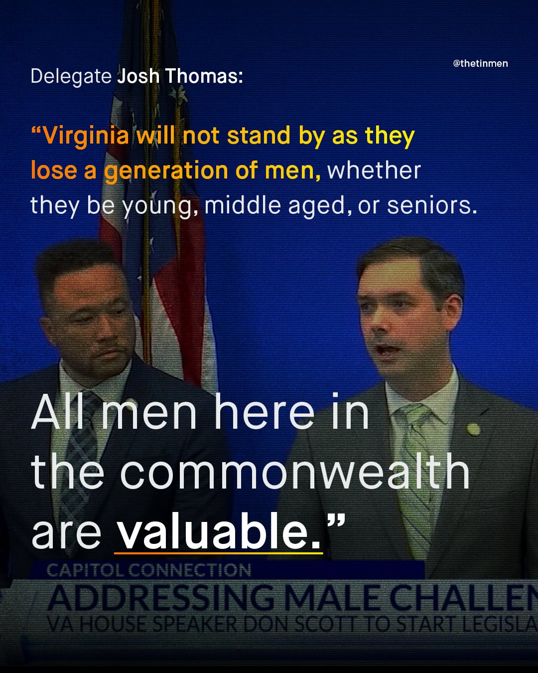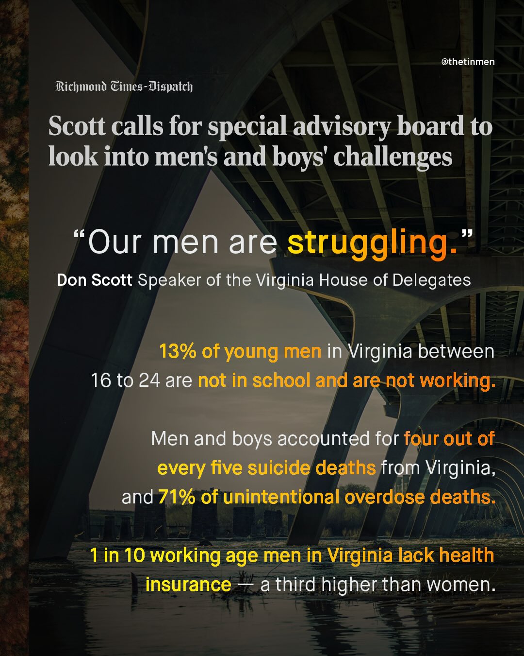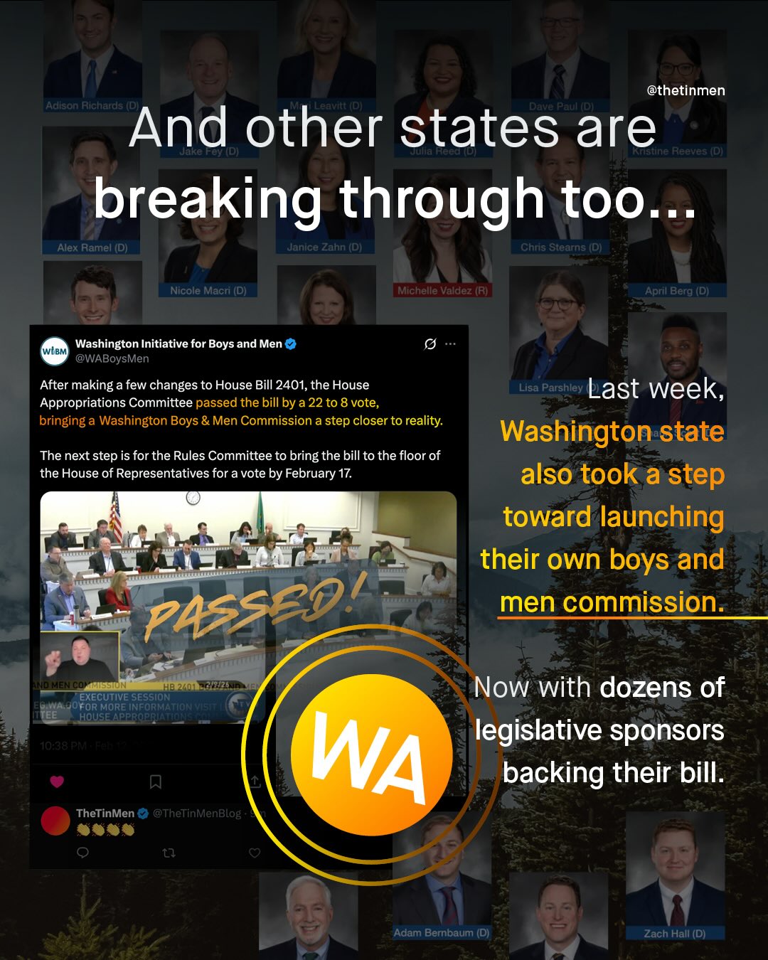 For years now, various groups of brave advocates have been working tirelessly to set up state level commissions for boys and men, to tackle some of the dire issues those across America are facing. Watching from across the pond, it is clear that the struggle has been incredibly difficult, and so often beleaguered by heartache and disappointment. Quite rightly, around 37 states have commissions for women and girls, which is a welcome thing. However not one state has a commission for boys and men; to address male suicide, mens mental health, boys failing education, poor literacy rates, homelessness, addiction, incarceration, fatherlessness, and a whole litany of problems and tragic outcomes, that have been swept under the rug for generations. But this could be about to change… With Virginia turning the final corner, and heading down the final straight, to likely create America’s first, permanent state level commissions for boys and men. And so arrives a piece of unexpected, and long overdue good news; that promises to save, transform and enrich lives across the great state of Virginia. Which will leave 49 states to go. Washington is another notable state that has been working FOR YEARS to do the same, a heroic struggle that too often has failed, even as recently as yesterday, as their most recent bill collapsed. Undeterred, and learning from the success of Virginia, Washington state could soon become the next, followed perhaps by Maryland, California, and who knows who… One thing’s for sure – Times are changing, politicians and legislators are coming out the woodwork in full unapologetic support for men and boys. And Virginia is proof of it. Yes. Success can be achieved, and sooner than you might expect. What do you think? ~ Join the journey at vaboysandmen.org/ And lend your support for Washington State Initiative for Boys and Men at @waboysmen