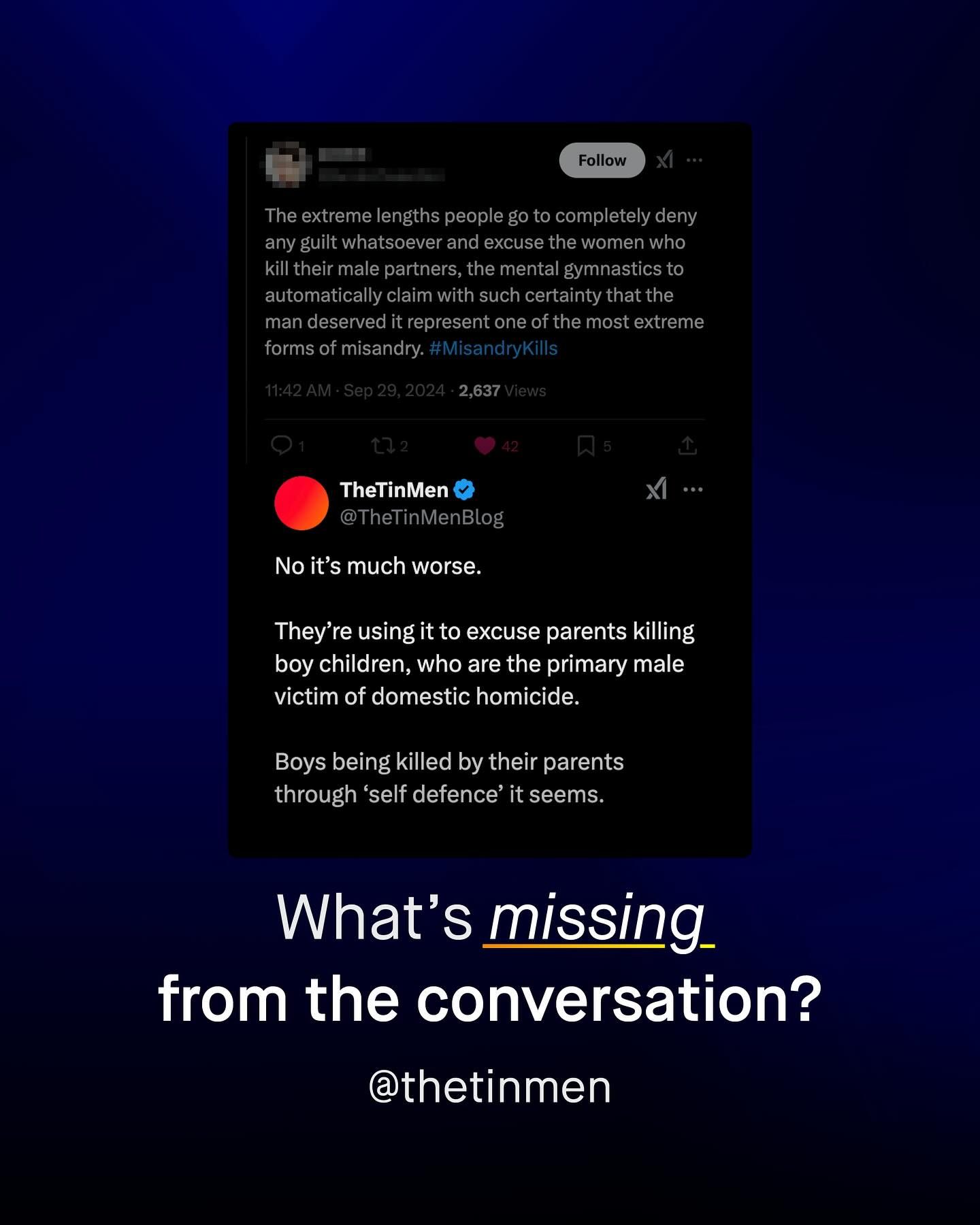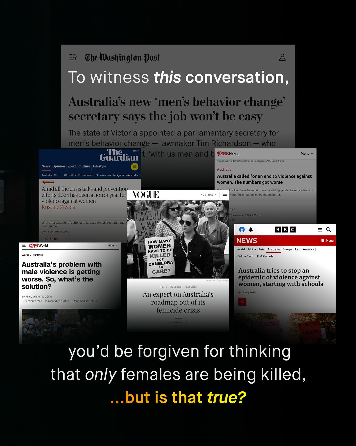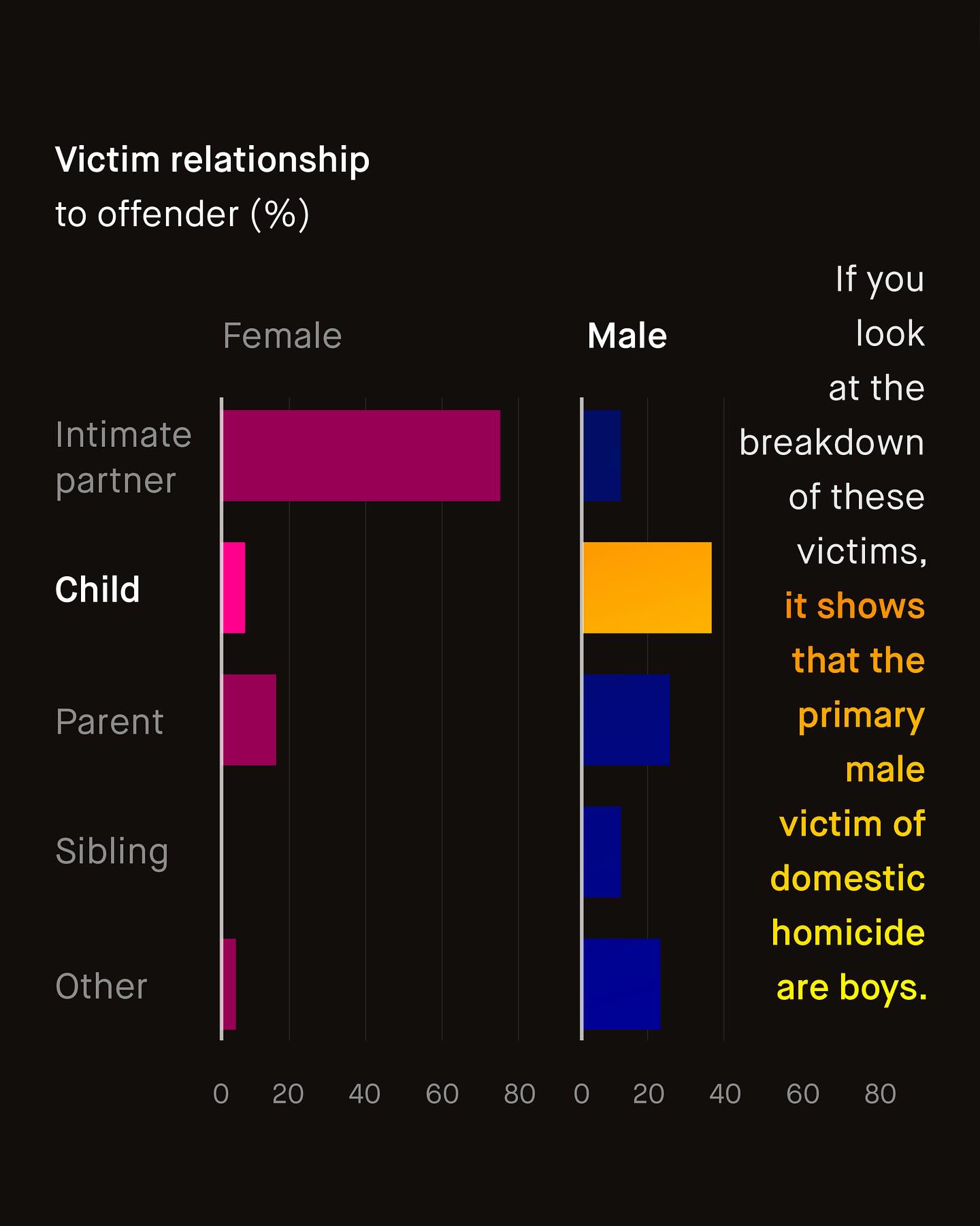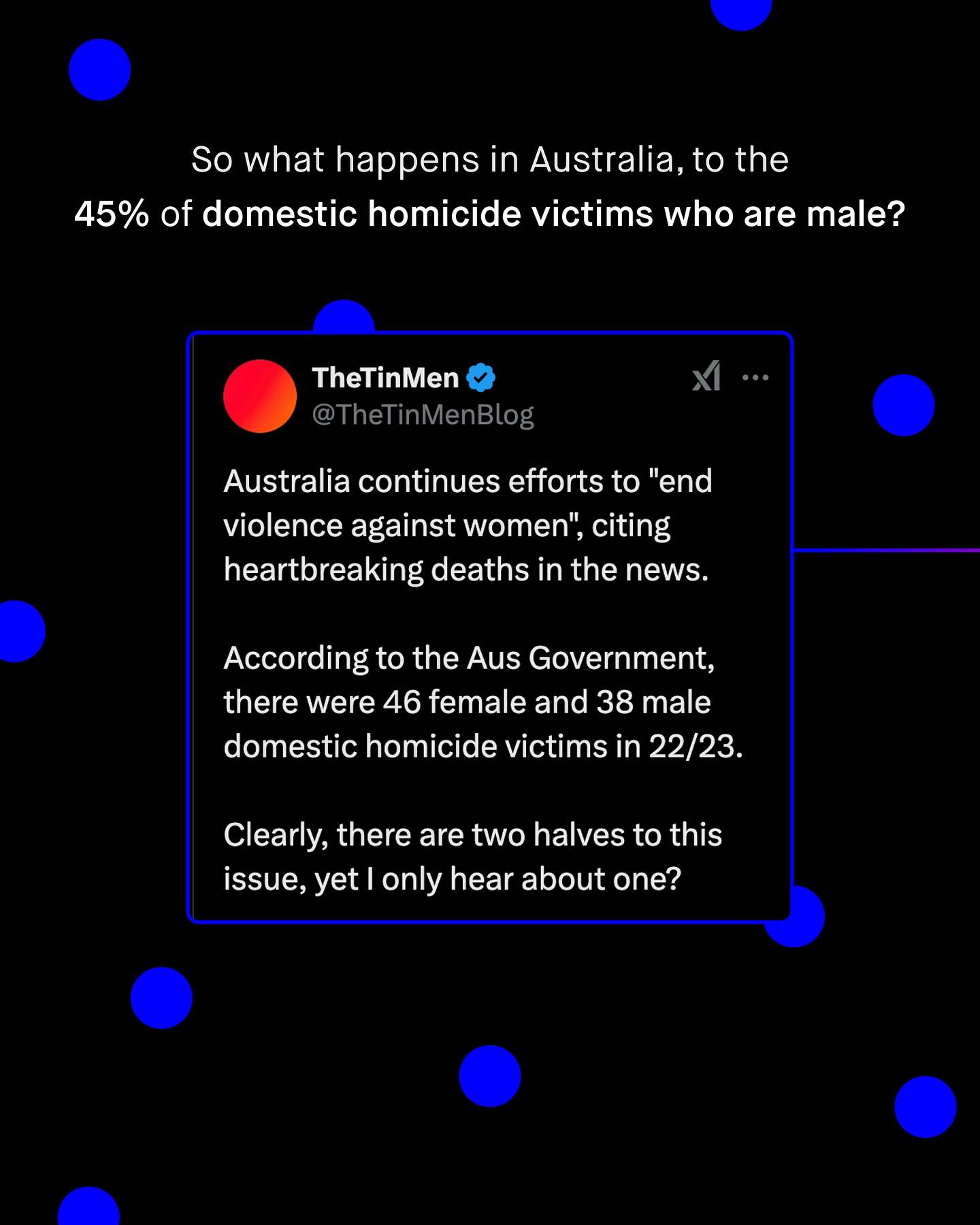 People seem to think blaming a child for his own murder, is somehow progressive ‘advocacy’. Or at least, that is the final destination we usually arrive at, when we follow them down the topsy-turvy road of ‘gendered violence’ to its inevitable clumsy conclusion. Australia is alight with talk of “an epidemic of violence against women”, with new, and ever more alarming headlines of the dozens of women and girls needlessly, and tragically killed by family members, and overwhelmingly by men. Of course, this one-sided narrative, and the ensuing headlines that are spun from it, would lead you to believe males are not killed in the same way; and any such talk of an ‘epidemic of violence against men and boys’, will win you the tiresome tirade of all-too-familiar insults. But to look at the data will reveal a huge slice of the pie missing, and one we’ve grown used to erasing from view. The complete data is as follows – In Australia, 46 females and 38 males were victim of domestic homicide in 22/23. There it is. But soon, another rebuke, again, no less familiar, arrives… “The men killed were the abusers, and they were killed in self defence!” Yes, intuitively, this makes sense. But again, to look closer, reveals a critical failure of reasoning, and even reading… I never said ’38 men’, I said ’38 male victims’—and that includes boys. In fact, if you look at those ‘males’ killed at home, you will see the number one sub-group are male children, killed by parents. And there we have it, we’ve arrived at the conclusion of – Boy children are killed by their parents… in “self defence”? What kind of world view is that? Either way, these lost men and boys, you will not see them spoken about. Not by Australian politicians, nor by advocates, or the public, the media, and not even @movember, the world’s largest charity for men, who are coincidentally headquartered in Australia too. So if not them – Then who will talk of the males killed, particularly children, and what is to be done with this blanket assertion of “self defence”? What do you think? ~ Source  Images by Tadeusz Lakota, Pj Gal Szabo, and Ylona Maria