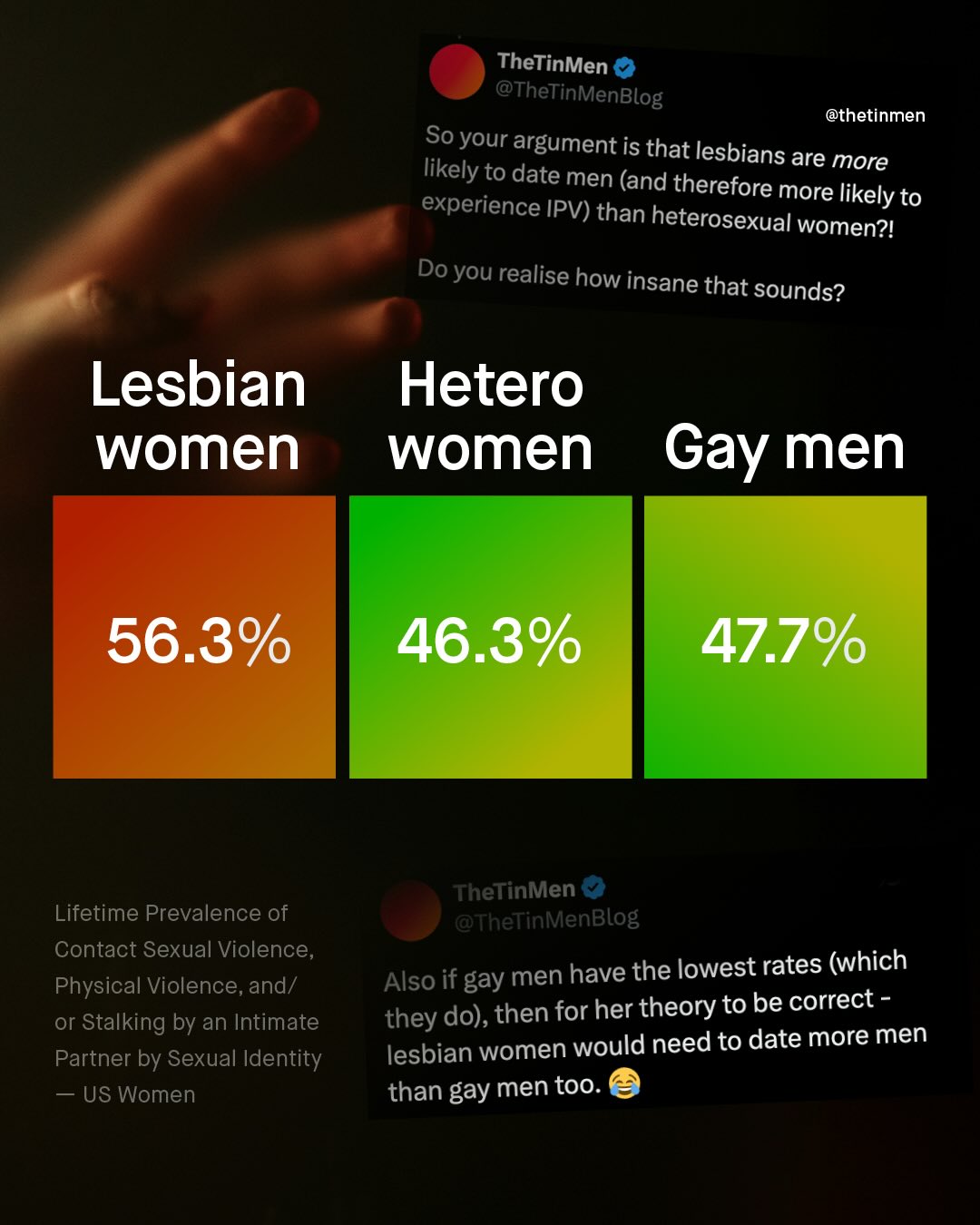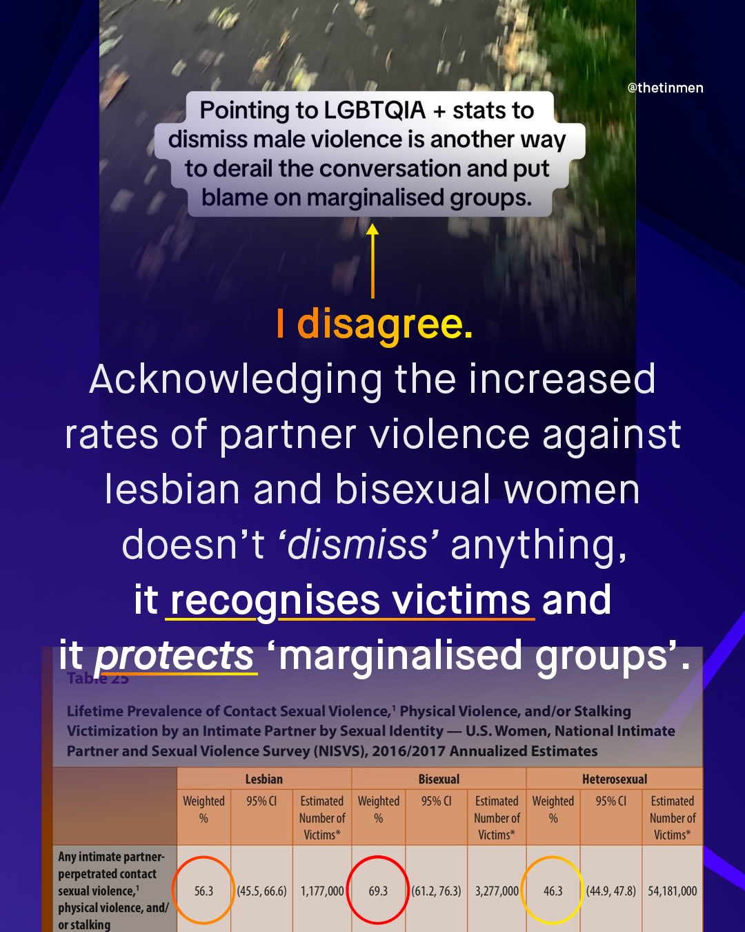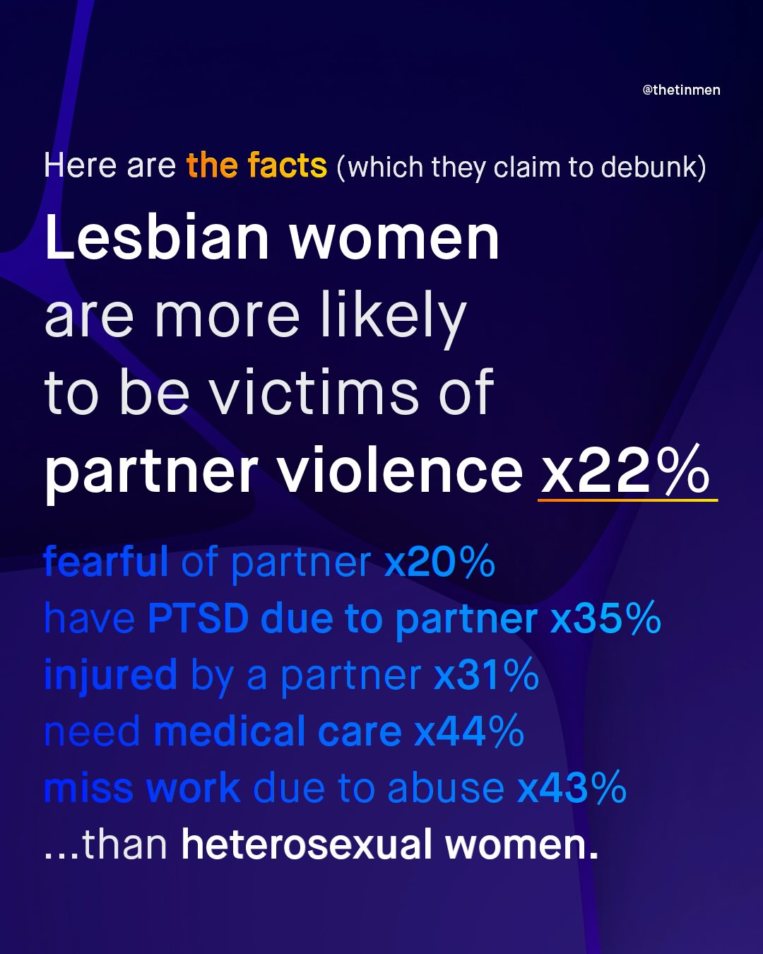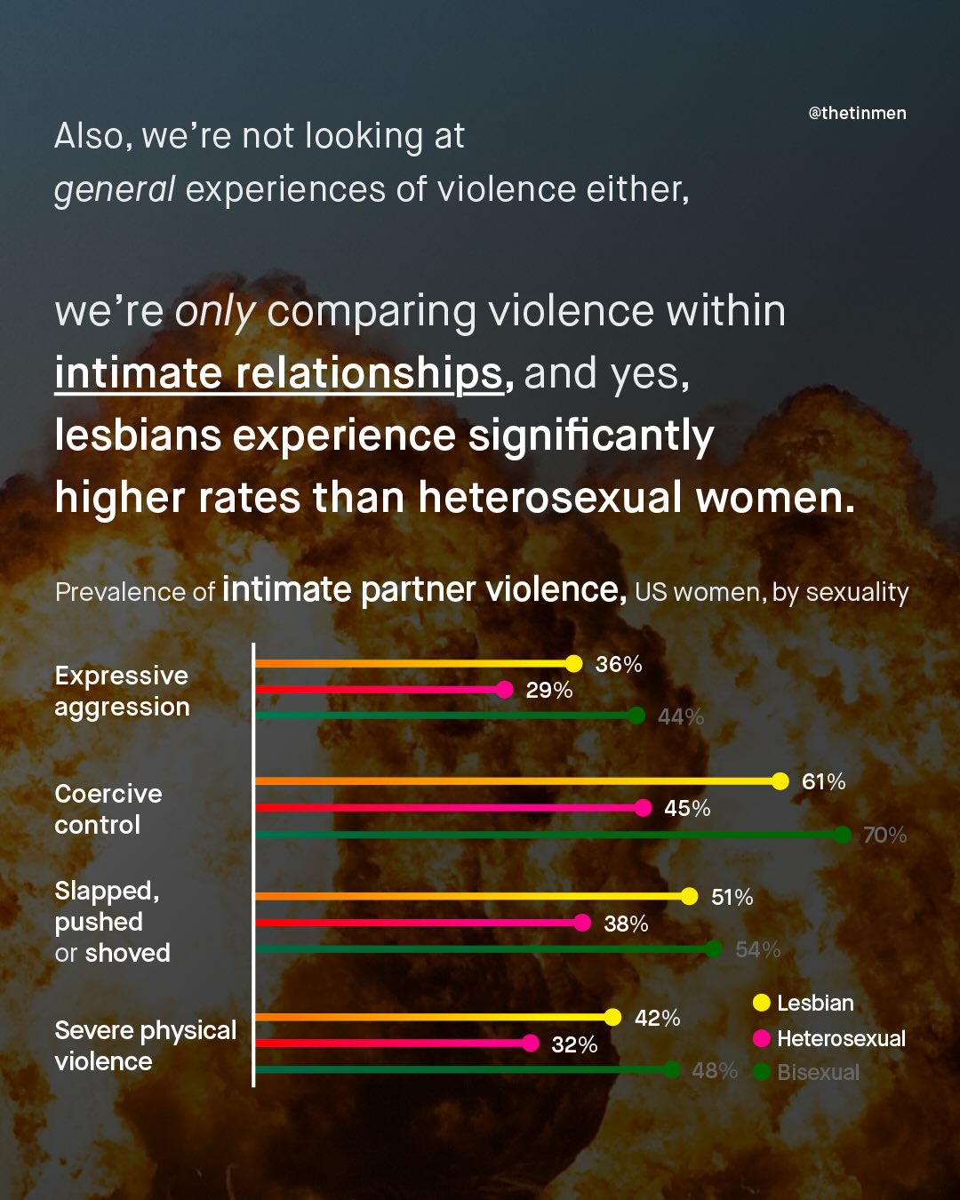 I am growing increasingly tired of various accounts, organizations, blogs, and advocates, who proclaim themselves to be ‘experts’ on abuse; proudly stating they are here to ‘protect women’, only to then roll women under the bus, when reality is at odds with their political agenda. I am talking about a voice that wholesale attempts to erase the prevalence of violence between women in lesbian relationships, because such a thing doesn’t fit their low-resolution, cookie-cutter world view, that sees women as eternally innocent victims, and never as autonomous perpetrators of violence themselves. Simply put – If you say you are ‘protecting women’, and then fail to acknowledge the increased rates of intimate partner violence in lesbian (and bisexual) relationships; then you are not ‘protecting women’ at all, you are protecting yourself, and a political ideology, and leaving *the most at risk group* of women vulnerable to IPV as a consequence. So no. I don’t want to hear these bizarre mental gymnastics, that make wild, unfounded and frankly, insane assertions around IPV against lesbians; that not only misleads the public, but more importantly, leaves lesbian and bisexual women vulnerable to abuse, and violent women without treatment. Yes – women can be violent too. There, I said it. I am sorry if you cannot reconcile that basic fact of life, within your rigid political worldview, but women shouldn’t be paying the price of your ignorance. And if you cannot see that, then maybe you should step out of the conversation, and re-evaluate your priorities? Women are autonomous adults. Lesbian women consistently have higher rates of intimate partner violence than heterosexual women. And yes, this violence is mostly by other women, and not by men. So ask yourself: what are you protecting? Is it women, or is it something else? What do you think? ~ Source https://tinyurl.com/4489jrac