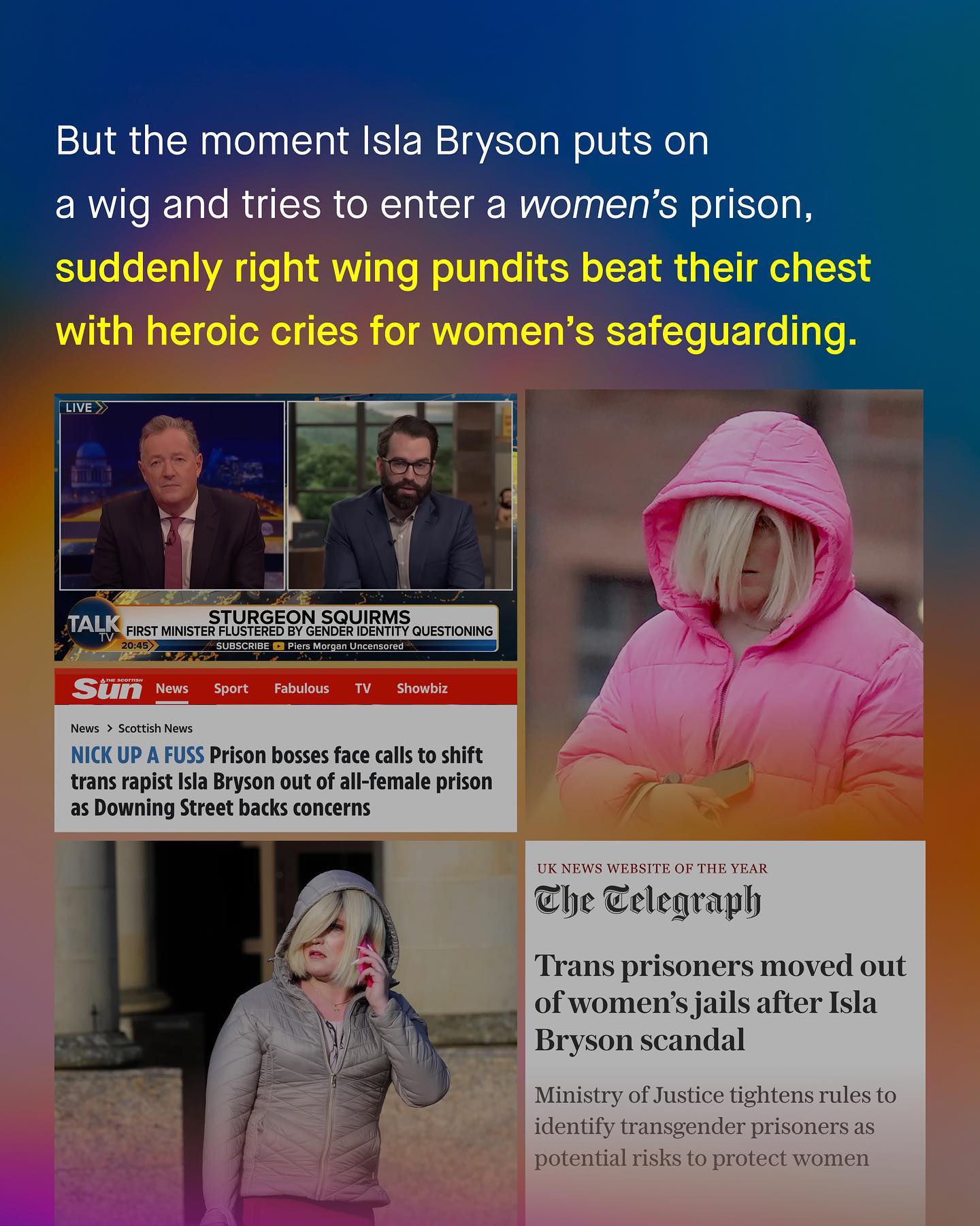 It’s strange how so many stood by as hundreds of thousands of men were sexually abused in American prisons, and then the moment a predator tries to ‘identify’ as a woman to gain access to a women’s prison, suddenly safeguarding for sexual assault in the prison system is top of the political agenda. I don’t get it. There are literally gangs who want to kill each other sharing prisons in America, but one dangerous inmate might make it into a women’s prison, and its global headline news? Isla Bryson has rightfully been barred from entering women’s prisons, and so marks what I hope is the end of yet another tiresome pantomime of canned outrage, and faux sympathy for prisoner safety. So many pointed and laughed at the radical left during the saga, but for me, the story exposes a similar shortsightedness in the right. And that is, prisoner safety does not start and stop with Isla Bryson. Physical and sexual violence within the prison system is an endemic problem that has been wilfully ignored, but throw in a blonde wig, and suddenly here they come… Preachy, performative high IQ political commentators, each smugly pointing at how a failure of safeguarding could happen, without realising that such failures have been happening to hundreds of thousands of prisoners across America, and the world, right under their own noses for decades. Hundreds of thousands of cases of sexual assault, ignored, or at best joked about. Each met with silence by the very people who now scoff about how ‘hilarious’ and ‘absurd’ the left is. But Isla Bryson is just a drop in the ocean of a much larger problem, ignored by all of us, and the brush of hypocrisy should be painting both political sides with blame. So can this story of Isla Bryson become a vector for a wider conversation, one desperately needed, for the safety of all those in the prison system? Images by: Diego Gonzales, Matthew Ansley, Ravi Avaala, Zhang Kelly, and Amir Seilsepour. Video by @triggerpod Sources Contagion of Violence Prison Policy Initiative The Sexual Victimization of Men in America Raise the Crime Rate