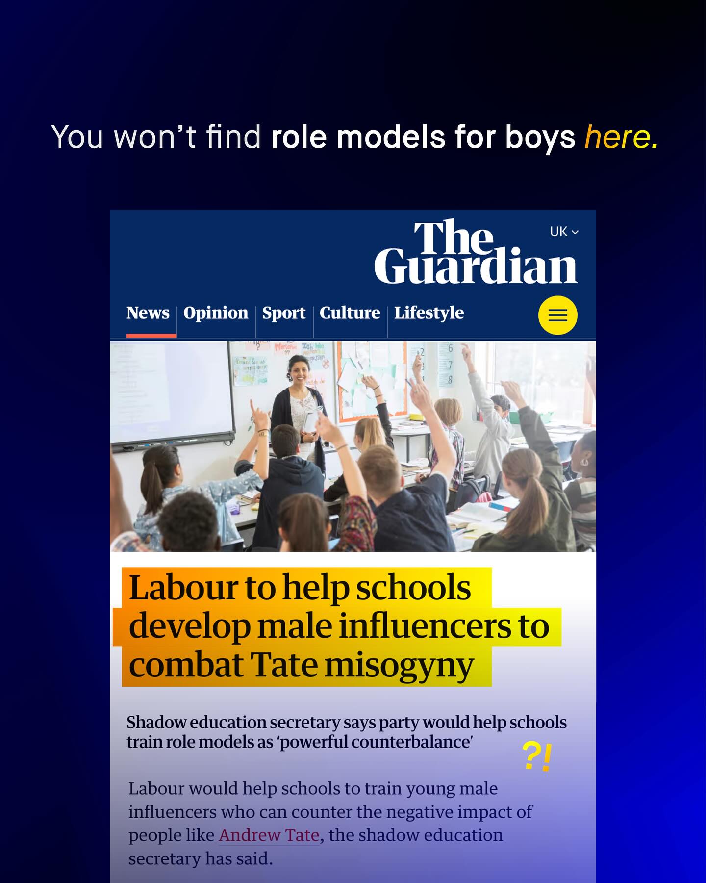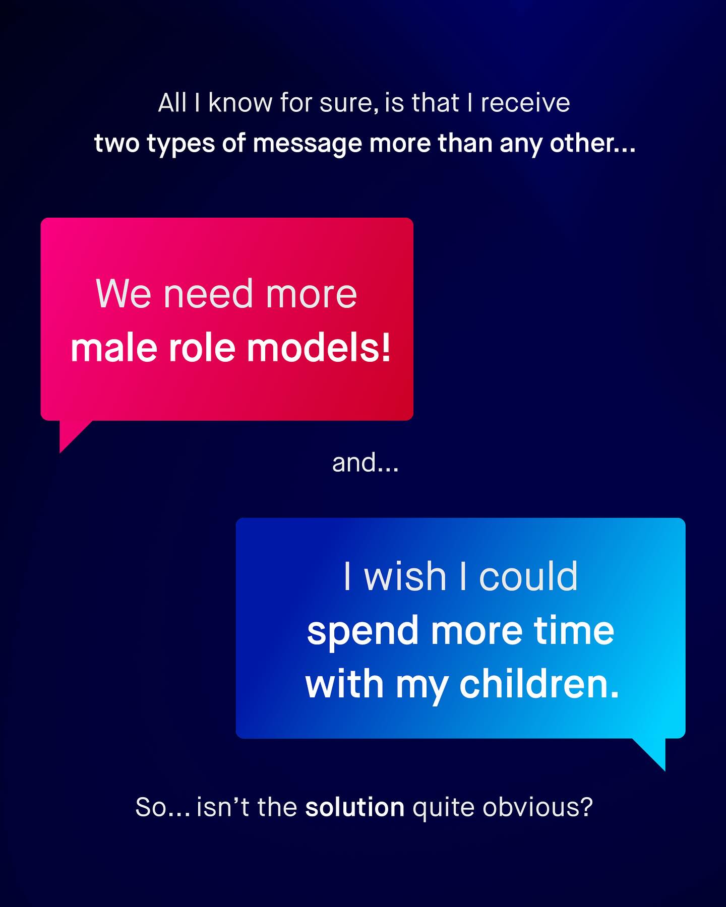 A few months ago, I sat on a panel discussing male suicide. At the end, a man, near the front row, shot up his hand to tell me a story. Sadly, it was one I hear far too often. He told me he was a father of a young child, who after a divorce, he hadn’t seen in over a year. Not through lack of trying, in fact, quite the opposite. Finding his child seemed like his greatest mission in life, but one he was failing at. He didn’t know where the mother had taken him, or even what school his child was at. Getting in touch was impossible, and finding them, even less likely than that. He seemed like a good man, and a loving father, broken, yearning for a missing part of himself he could never find. We talked a little, but there’s not much you can say to console a parent who’s lost their child, as much as I wish I could. A few questions later, another hand shot up. This time belonging to a younger woman, who I could say, seemed little more skeptical of what she had listened to that afternoon. Her question was one I so often hear too – Her arms were crossed tightly in front of her: “Well who are these male role models for boys, you keep talking about? Can you recommend books, or some celebrity, or, someone on social media?” Usually people scratch their head for a while over this. But to me, the answer seemed simple; in fact, it was sat in the seat right next to her. “That man just told you about how he is searching for his missing boy, do you think he’d make a good role model?” She didn’t answer. So I asked another – “Why don’t you ask him that question instead?” I see and hear a lot of things running @thetinmen. And perhaps most of all, I hear stories from broken fathers, and puzzled questions about “male role models for boys”. Well, one surely solves the other, if only we could bring them together. So, where are our male role models? And how do we bring them back to their families? What do you think?