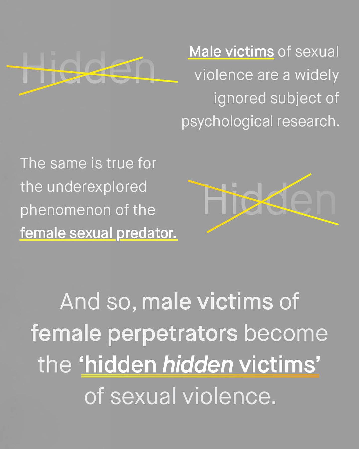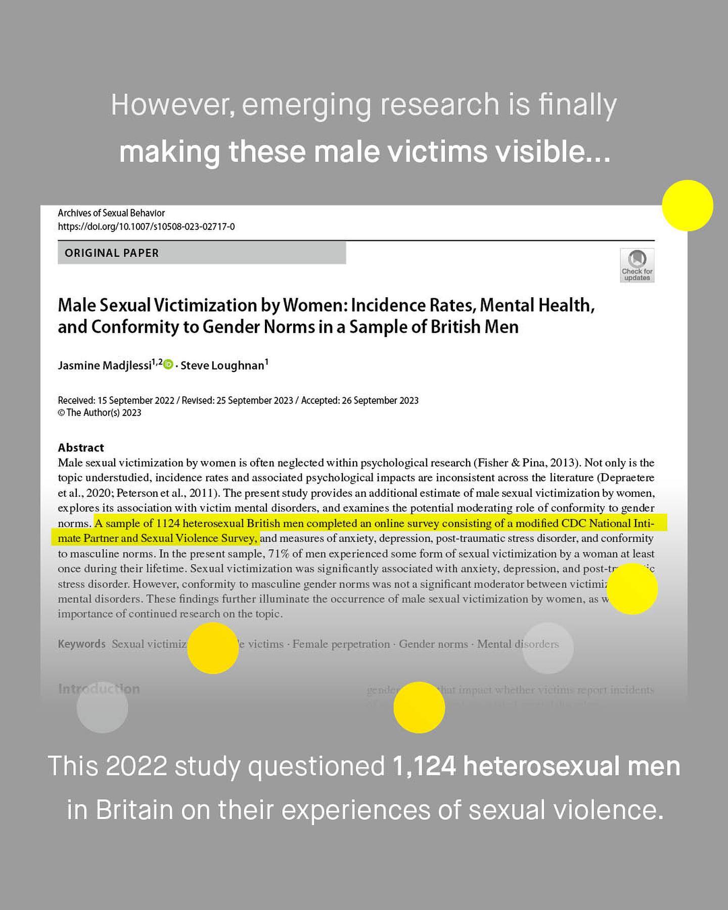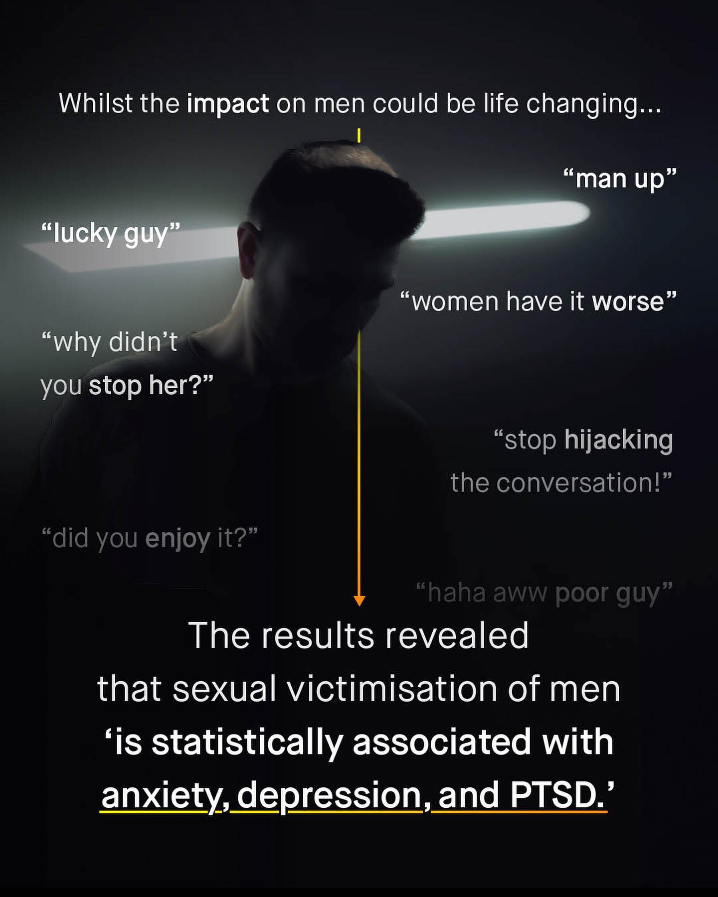 There was so little light between her index finger and thumb. Just a tiny slither. ‘Yes George, but the number of abused men is infinitesimally small!!’ I had never heard that word before. But her podgy, quivering fingers clamped together in a ‘this small’ gesture 🤏, mere inches from my face, taught me what I needed to know. I was stunned. During my adult life, I had learnt that it was not the place of men to lead the conversation, nor speak for female victims of sexual violence. It was our time to listen, as I dutifully did. And yet, right now, having the experiences of vulnerable men being scoffed at, spat upon, and minimised by a group of tipsy women, I realised the opposite arrangement had become perfectly acceptable. At the time, I was not as familiar with the shocking numbers around which she was boasting knowledge. But I was confident the true amount of men who are sexually abused, was certainly not ‘Infinitesimally small’. I wondered, if this same women who spoke so confidently and hatefully of abused men, would dare to look in the mirror, to see the face of the men who have historically done the same to abused women, looking back at her? For if she looks closely, I’m sure she’ll see the reflection of her own worst enemy. And I agree - it can easily be argued that all victims of sexual violence have been failed by the system. A failure of protection, a failure of justice, and a failure of awareness. Right across the board, ‘the work’ has been lacklustre, underfunded, and performative. But whilst female victims face their own betrayals; male victims of female sexual violence have been left in the shadows of advocacy, of understanding, and deep in the doldrums of psychological literature. So let’s fix that. Let’s talk and listen to male victims of female predators, the hidden hidden victims of sexual violence. ~ Study Images by Florian Crumb, Brooke Caggle, Andrew Staple, Luke Thornton, and Gradienta. #malesuicideawareness #malesurvivors #sexualviolenceawareness #sexualviolence