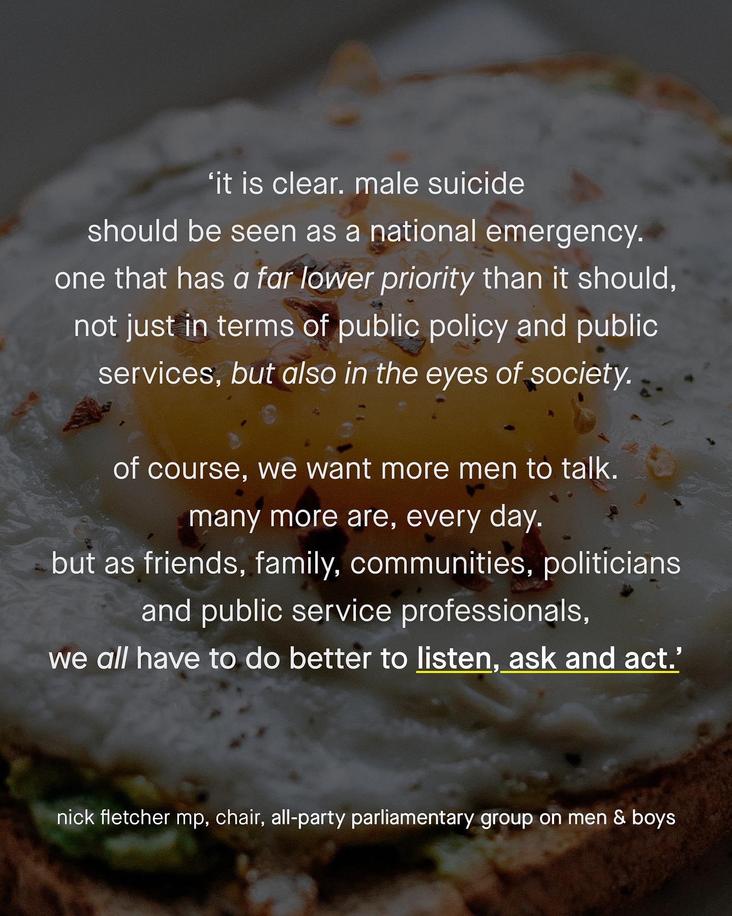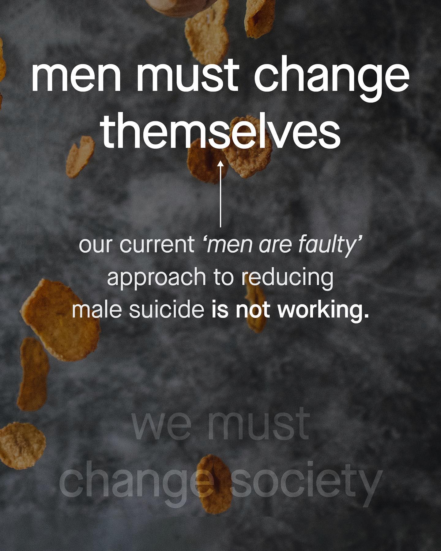 Politicians are asking suicidal men to talk, advocates urging them to cry, psychologists telling them to be less toxic. Never in my life have I seen an issue so roundly blamed on those experiencing it. Men. This is your mess and therefore yours to solve. Cry. Talk. Toxic. That is your tool set, now get to work. We don’t tell anyone else to go cry about their problems. We don’t label anyone else ‘toxic’. Such an idea would be unthinkable if applied to other groups; and yet here we are, treating suicide, which remains the biggest threat to a young man’s life, with this exact approach. And then we scratch our heads as to why the problem isn’t getting any better. “Keep talking! Can you get both eyes welling up? Are you sure the toxicity is all gone?” I am certain we will look back at these darks days, with hands over our face, and through parted fingers. I am sure we’ll be embarrassed by the language we used, and how we failed to address an epidemic that claims thousands of British men’s lives, and devastates countless others each year. You know that photo of that god awful hairstyle you had twenty years ago, or those tragic flared jeans you once wore? Yeah. Well that’s how we’ll feel about our similarly tragic political opinions of today. “How did we get it so wrong?” We’ll ask. I think I have a better approach to reducing male suicide. Instead of placing the primary responsibility for the problem on men’s shoulders; can we not apportion part of finding the solution to each of us? For men are our friends, family and colleagues, this is an issue that hurts all of us, and it is all our problem to solve. So don’t tell men to talk, cry, or be less toxic. Ask yourself, your friends, family and society – to listen, ask and act. How can we all do better? ~ Images by Calum Lewis, Tijana Drndarski, Anita Jankovic, Sincerely Media, Ben Kolde, Yukiko Kanada. Suicides UK Suicides USA Suicides India #malesuicideawareness #mensmentalhealth #suicideprevention #mensissues
