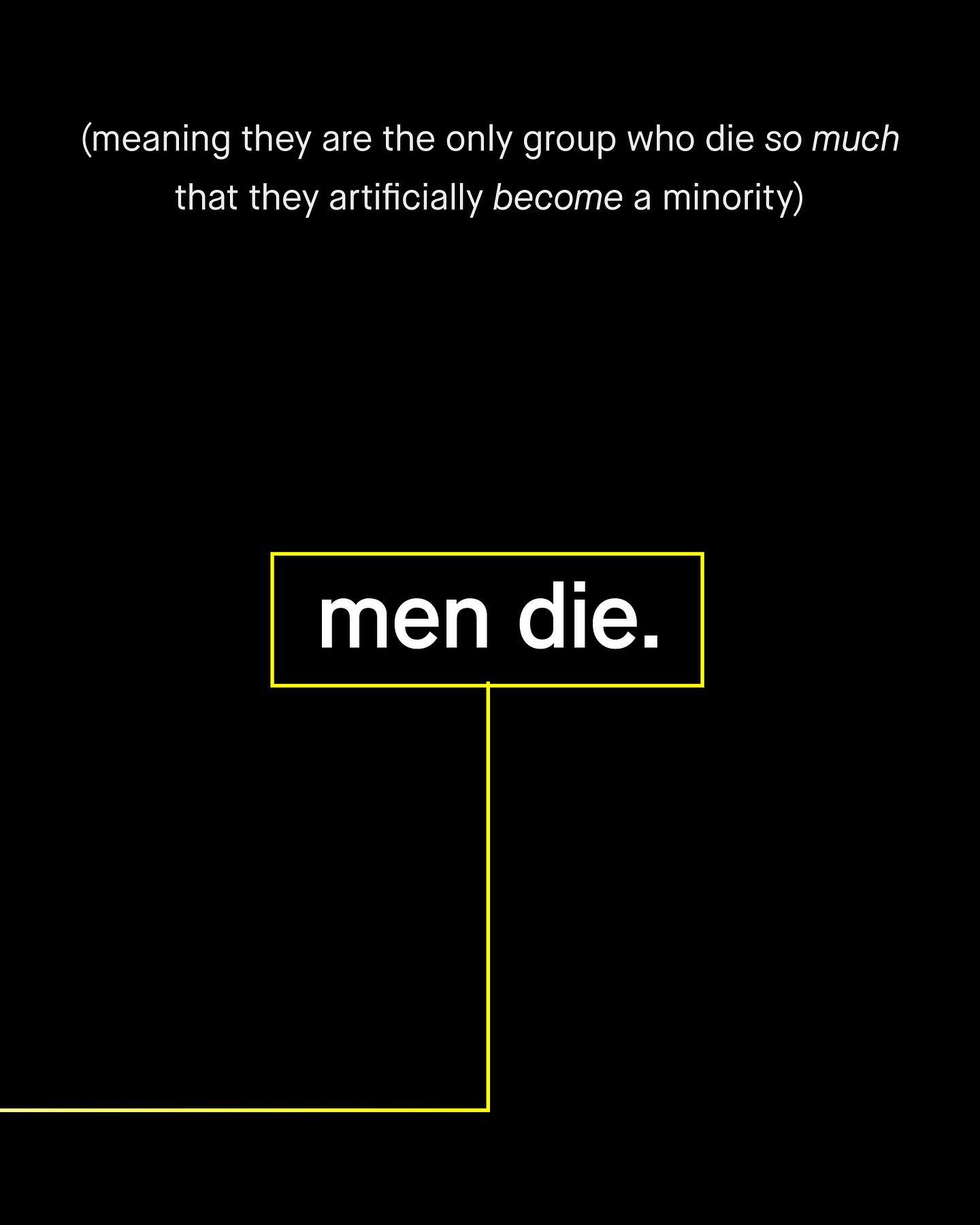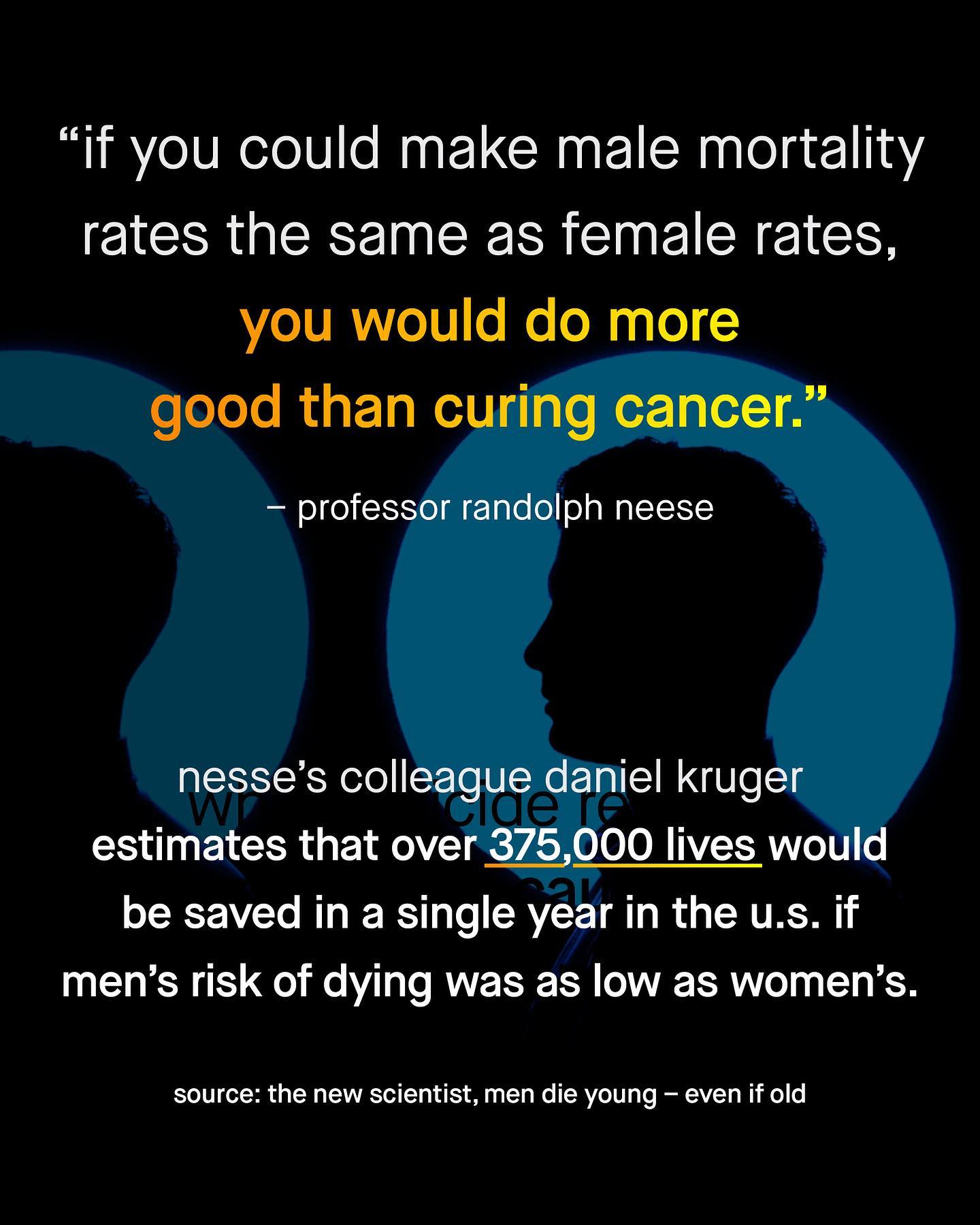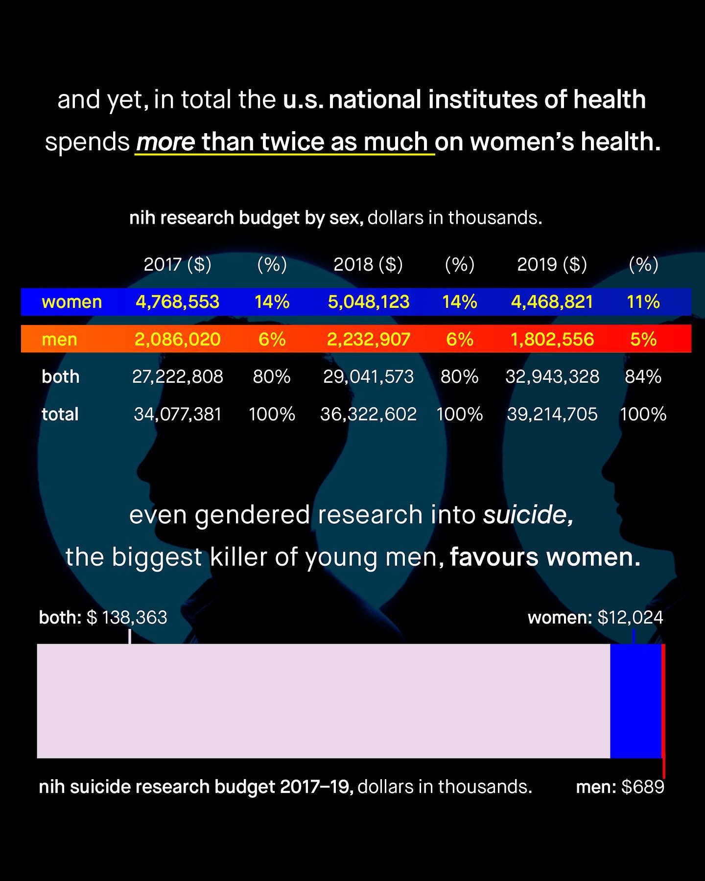 People say women are a minority; but in fact, it is men who are the smaller group. More interestingly, men are not born as a minority – as for every 100 female births there are actually 105 male births. But this male surplus doesn’t stay for long, as over the course of a life time, the number of men is slowly eroded away until the sex ratio shifts. Yup, in adulthood there are only 97 American men for every 100 women. So what happened? Why do men experience higher mortality rates in every age group, and have an overall death rate 1.4 times higher than women? Why has a problem, so large it literally alters the tectonics of a nation’s population, been so readily ignored? Why are men’s higher mortality rates so often waved of with, “well that’s just the way it is!” Perhaps… men are not the ubiquitously privileged gender you’ll hear described, but the disposable one? I mean isn’t early death a bit more deserving of advocacy and investigation than women having too few pockets, or Babie’s super cool day out? Are the solutions to men’s issues more serious and complex than social media coddling, and meagre calls for “talk” and male tears? What about men’s early death? How do we save our men and boys? ~ US Death Rate Population reference bureau NIH Funding  The New Scientist  Images by Hu Chen, Ben Sweet, MT Elglasseur #menshealth #mensmentalhealth #malesuicideawareness