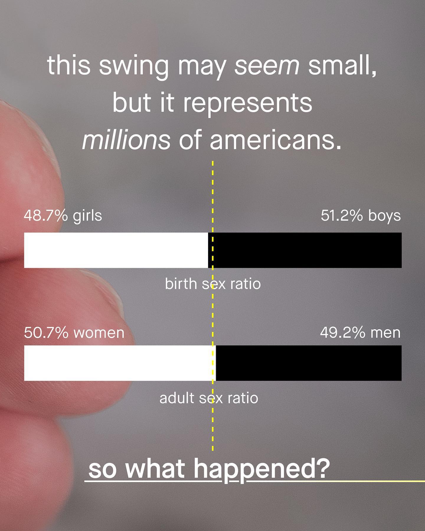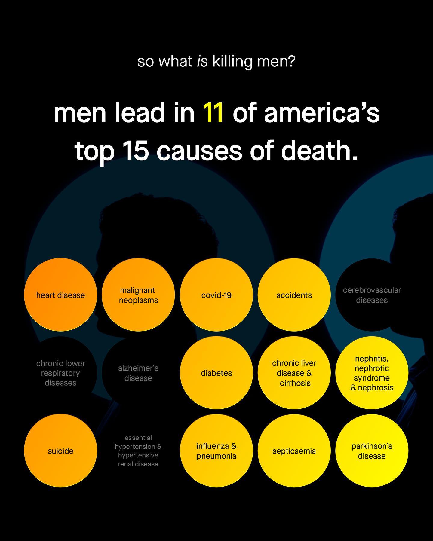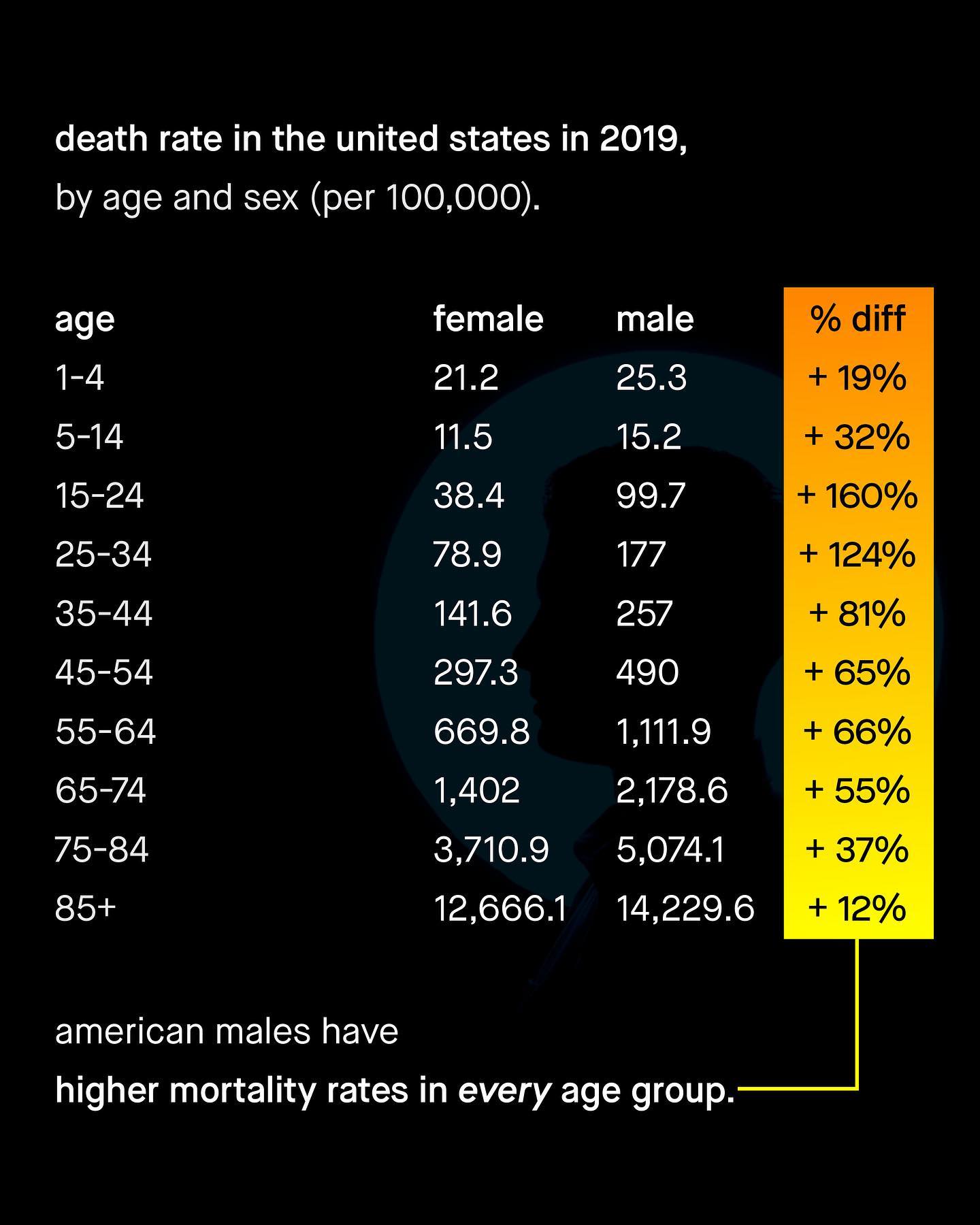 People say women are a minority; but in fact, it is men who are the smaller group. More interestingly, men are not born as a minority – as for every 100 female births there are actually 105 male births. But this male surplus doesn’t stay for long, as over the course of a life time, the number of men is slowly eroded away until the sex ratio shifts. Yup, in adulthood there are only 97 American men for every 100 women. So what happened? Why do men experience higher mortality rates in every age group, and have an overall death rate 1.4 times higher than women? Why has a problem, so large it literally alters the tectonics of a nation’s population, been so readily ignored? Why are men’s higher mortality rates so often waved of with, “well that’s just the way it is!” Perhaps… men are not the ubiquitously privileged gender you’ll hear described, but the disposable one? I mean isn’t early death a bit more deserving of advocacy and investigation than women having too few pockets, or Babie’s super cool day out? Are the solutions to men’s issues more serious and complex than social media coddling, and meagre calls for “talk” and male tears? What about men’s early death? How do we save our men and boys? ~ US Death Rate Population reference bureau NIH Funding  The New Scientist  Images by Hu Chen, Ben Sweet, MT Elglasseur #menshealth #mensmentalhealth #malesuicideawareness
