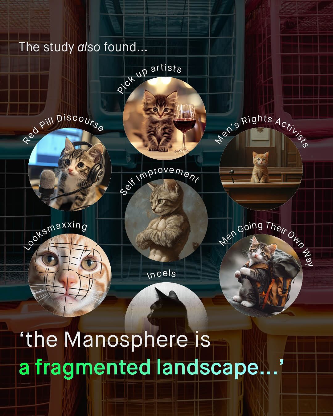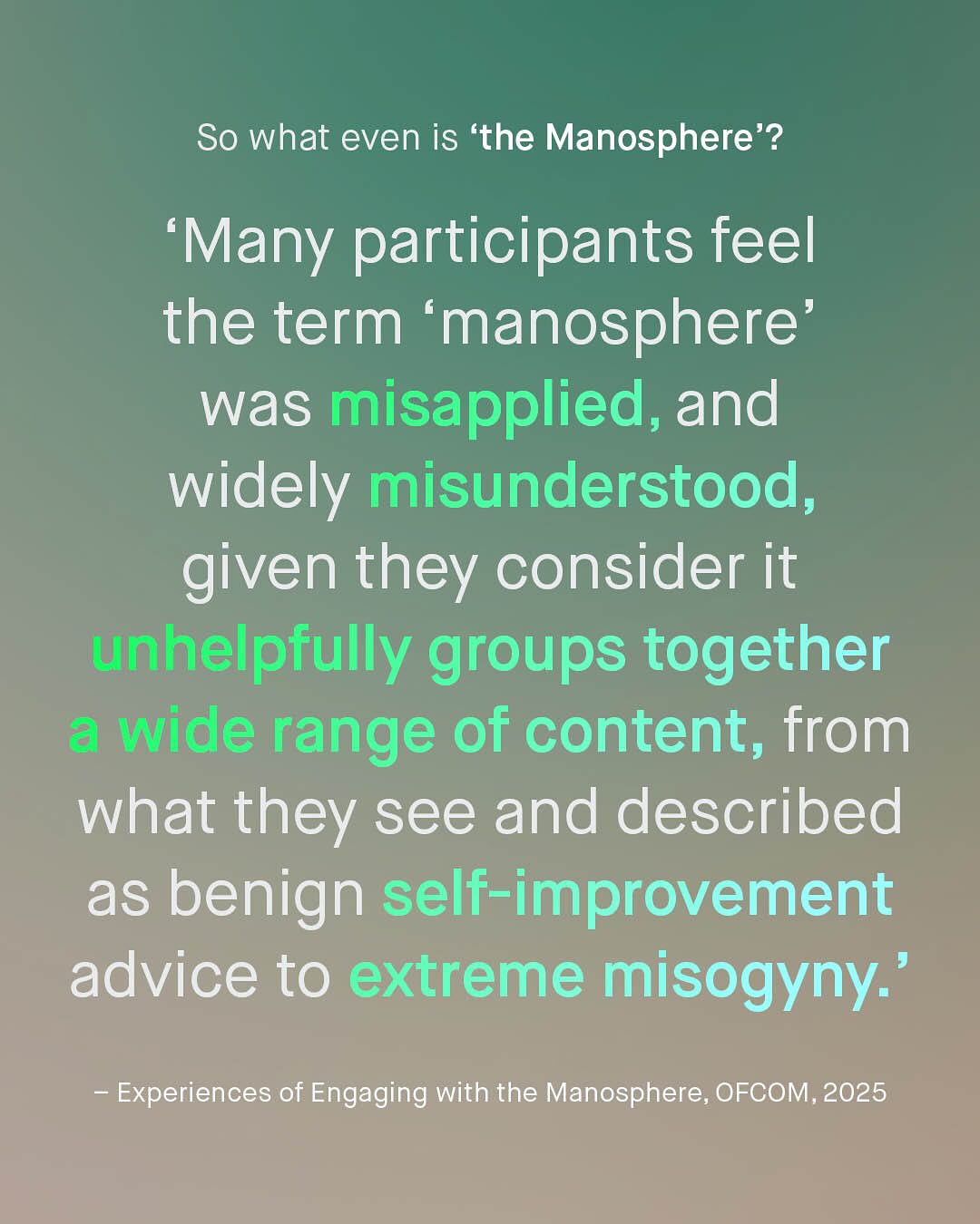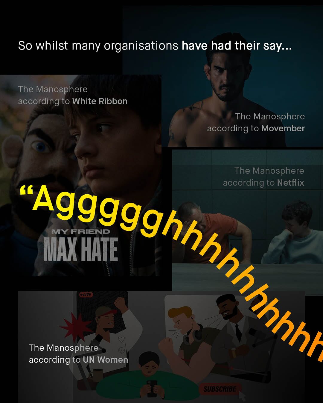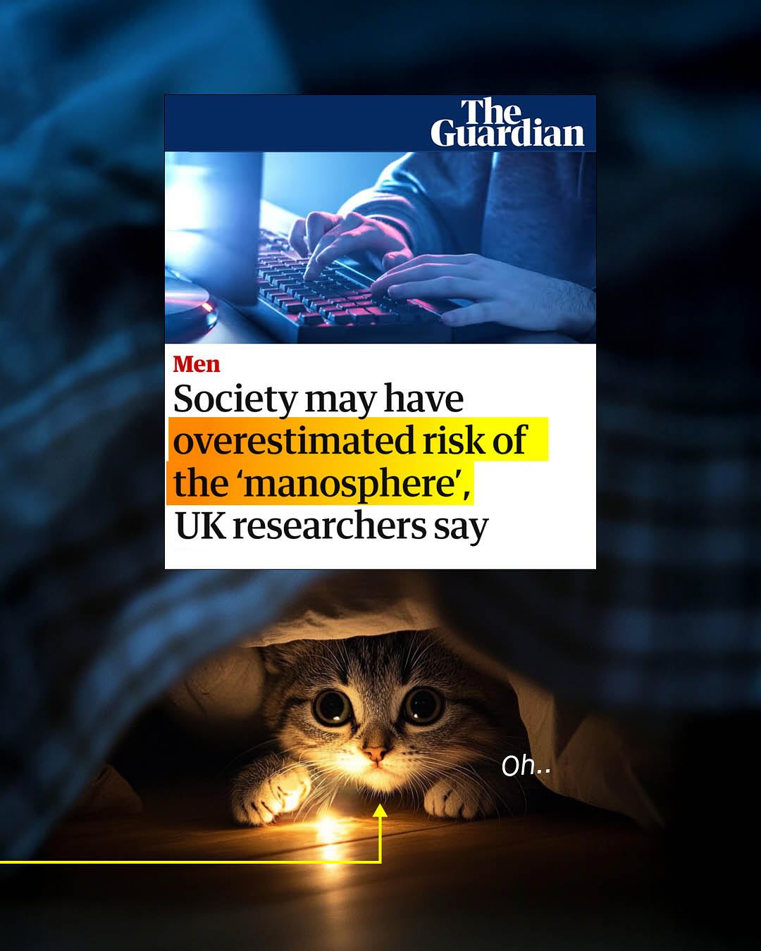The Manosphere, the new supervillain valiantly being fought by feminist acolytes, noble researchers and virtuous politicians alike. A spectre, that hangs eerily over the heads of our boys; its shadowy tentacles, eminating from their phones and penetrating their soft, impressionable psyche, with the loud, crass, misogynistic rambling of ex-kickboxing champs, pseudo intellectuals, and outrage merchants. And that certainly exists – and remains an annoying problem, that buzzes around our heads like an unswattable fly. But that’s not all that’s found within the vaguely formulated ‘manosphere’, which appears to be a concept of rhetoric, not reason, to smear any and all voices for men and boys, well intentioned or not, with the unwashable tar of virulent misogyny and fear. A word for society to clutch its pearls over, like we did over ‘Reefer Madness’ of the 1930s, the ‘Satanic Panic’ of the 80s, ‘Super Predators’ of the 90’s, and now this… tHe MaNoSpHEre!! I am sure I’m considered part of it, whatever it is, and you probably are too. But anyone who knows anything about the groups that are placed within it; MRAs, pick up artists, Red Pillers, Incels, and MGTOWs, know they have so little in common, to unite them under a universal banner, is a betrayal of reality. Do people realise that Andrew Tate represents, quite literally, everything incels hate? Do people care that MRAs feel constantly embarrassed by the childish rhetoric of Red Pillers? So… what is the Mansophere? Where is it? Who is it? And why is everyone so infatuated? It feels more like a terrifying lovecraftian monster, trying to gobble up your boys, than it does anything scientifically legitimate, or serious. Well, good news – OFCOM, the UK’s official regulator for online safety have waded in to find out; trawling through Manosphere spaces, reading the literature, analyzing the posts, and talking to (a small sample) of 39 people within it. And here’s what they found… So, what do you think the manosphere is? ~ OFCOM Study Guardian Images by Tawskeem Hakak, Woliul Hasan, Amal S, Alan Labisch, and Frank Flores.