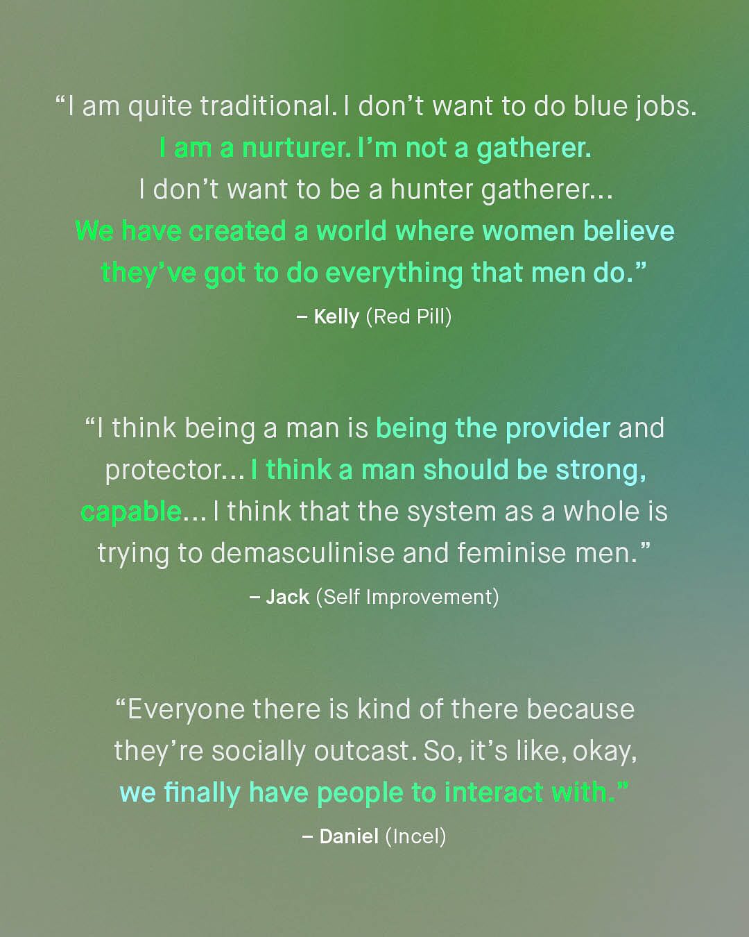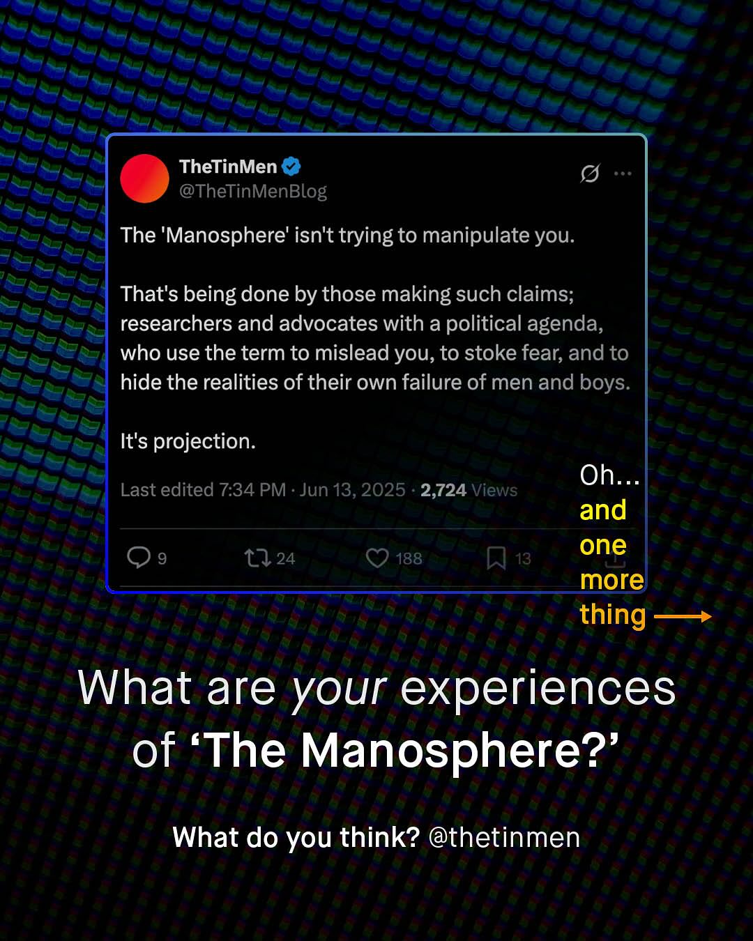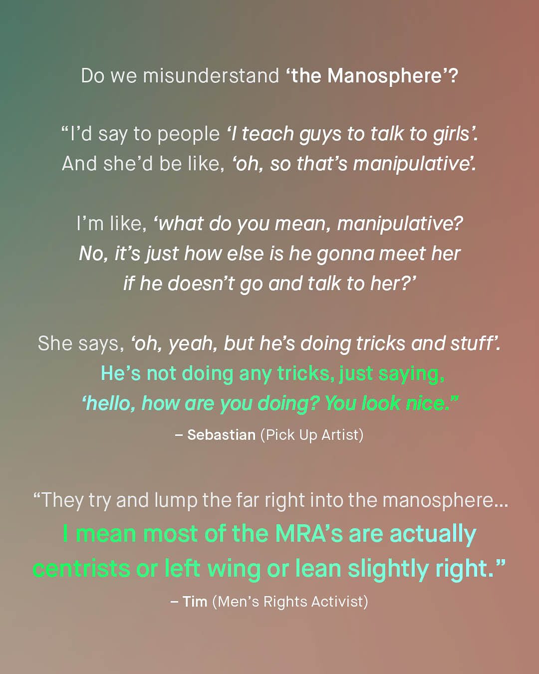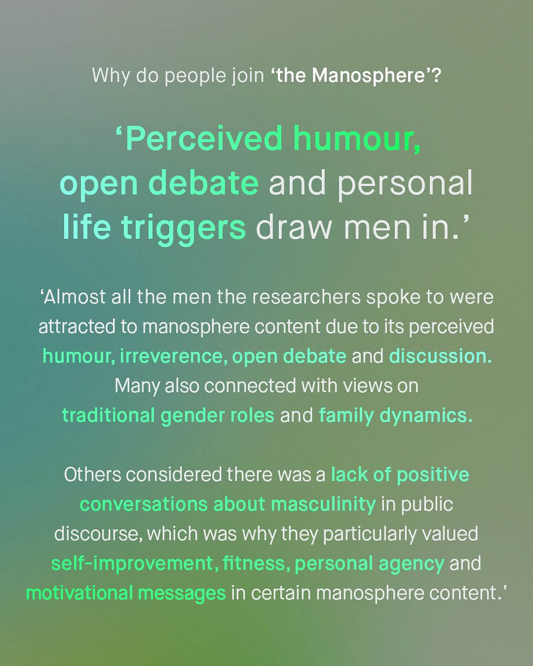 The Manosphere, the new supervillain valiantly being fought by feminist acolytes, noble researchers and virtuous politicians alike. A spectre, that hangs eerily over the heads of our boys; its shadowy tentacles, eminating from their phones and penetrating their soft, impressionable psyche, with the loud, crass, misogynistic rambling of ex-kickboxing champs, pseudo intellectuals, and outrage merchants. And that certainly exists – and remains an annoying problem, that buzzes around our heads like an unswattable fly. But that’s not all that’s found within the vaguely formulated ‘manosphere’, which appears to be a concept of rhetoric, not reason, to smear any and all voices for men and boys, well intentioned or not, with the unwashable tar of virulent misogyny and fear. A word for society to clutch its pearls over, like we did over ‘Reefer Madness’ of the 1930s, the ‘Satanic Panic’ of the 80s, ‘Super Predators’ of the 90’s, and now this… tHe MaNoSpHEre!! I am sure I’m considered part of it, whatever it is, and you probably are too. But anyone who knows anything about the groups that are placed within it; MRAs, pick up artists, Red Pillers, Incels, and MGTOWs, know they have so little in common, to unite them under a universal banner, is a betrayal of reality. Do people realise that Andrew Tate represents, quite literally, everything incels hate? Do people care that MRAs feel constantly embarrassed by the childish rhetoric of Red Pillers? So… what is the Mansophere? Where is it? Who is it? And why is everyone so infatuated? It feels more like a terrifying lovecraftian monster, trying to gobble up your boys, than it does anything scientifically legitimate, or serious. Well, good news – OFCOM, the UK’s official regulator for online safety have waded in to find out; trawling through Manosphere spaces, reading the literature, analyzing the posts, and talking to (a small sample) of 39 people within it. And here’s what they found… So, what do you think the manosphere is? ~ OFCOM Study Guardian Images by Tawskeem Hakak, Woliul Hasan, Amal S, Alan Labisch, and Frank Flores.