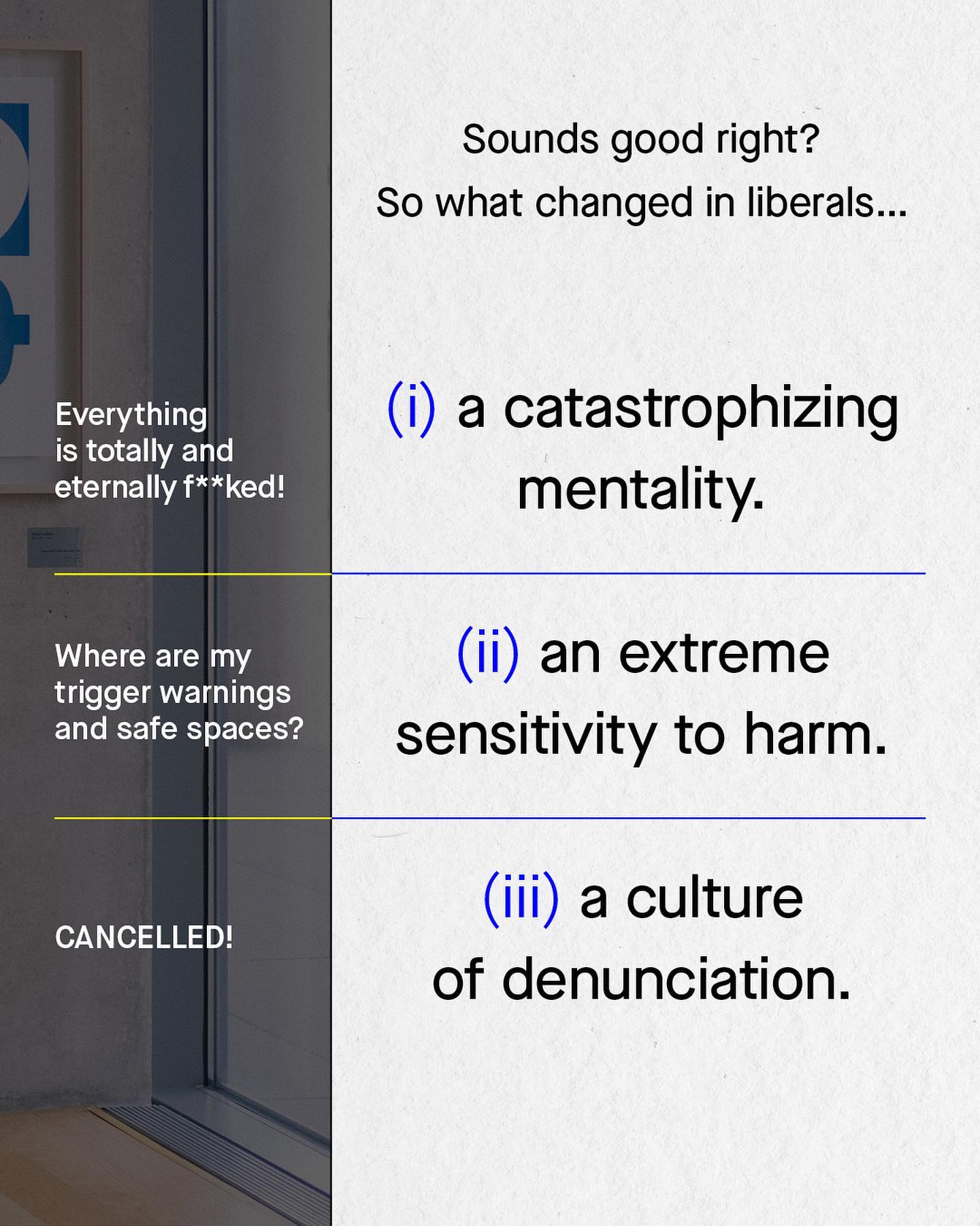 I for one am tired of the constant catastrophising of the liberal left. We have been, all of us, sat permanently in the brace position for years now; everything is f**ked, for everyone, everywhere, all the time. It’s exhausting. Nothing is good enough. Shit is going down left, right, and centre, and the world is ending in new and more profoundly excruciating ways. Silence is violence. Words are violence. The walls of acceptable behaviour are closing in, entombing us all onto a tight rope that doesn’t aim to make us better, it only tries to make us fall. Fall so others can laugh, and point, and feel good about themselves. Cry bullies, chirping on about ‘diversity’, but only diversity of gender, sexuality and race, and never of ideas, or opinion. Everything and everybody is institutionally racist. Misogyny is endemic, homophobia is rife; global society is falling apart, and dammit I’ve just burnt my toast. I do not mean to make light of these problems, I agree there is still important work to be done. But would it hurt anyone to acknowledge that our society, although imperfect; is the least racist, least sexist and least homophobic one to have ever existed? And if you don’t believe that’s true, can you at least accept that progress does not come from censoring any kind of dissenting opinion? We need to learn to welcome uncomfortable conversations, be willing to lay down upon the bed of nails, and bravely confront those with who we disagree. You cannot sanitise your life of the ideas you don’t like, as too much cleanliness will make you sick. And we are sick. We are sick, and we are weak. And we are sad. Something‘s changed – this is the era of the miserable liberal. Too many have become a bunch of spineless brats, cocooned within layers of bubble wrap, pasty, flabby and incapable; unwilling to fight with dignity, strength or grace. “YES WE CAN”, is long gone. Replaced by a bunch of shrill shrieks, cries, whines, and tears. Where did it all go wrong for #liberalism ? ~ Images by Kawai So, Angshu Pursuit, Kiwi Hug, Dev Asangbam, and Codioful from Unsplash. Liberals less happy (ATUS) Study