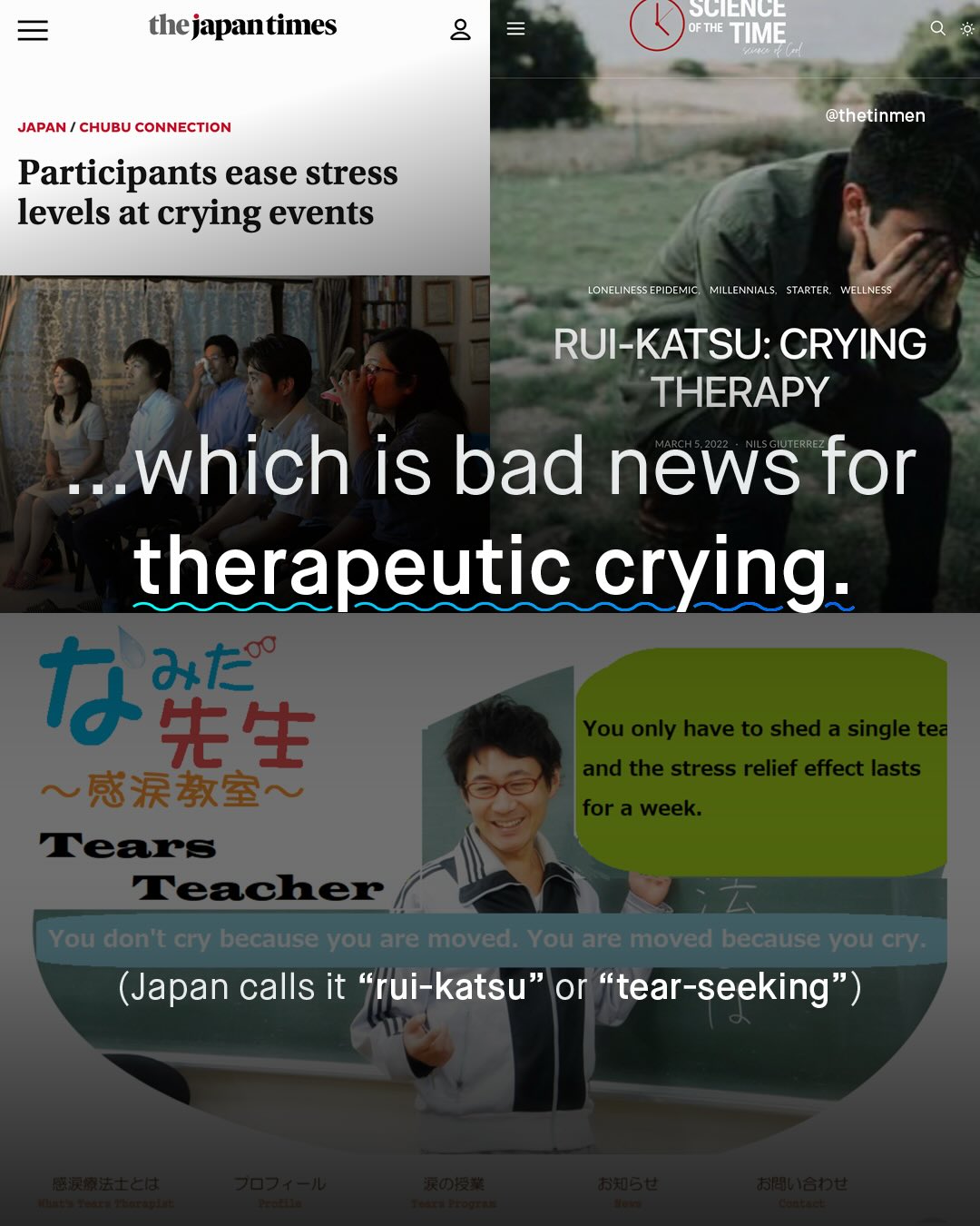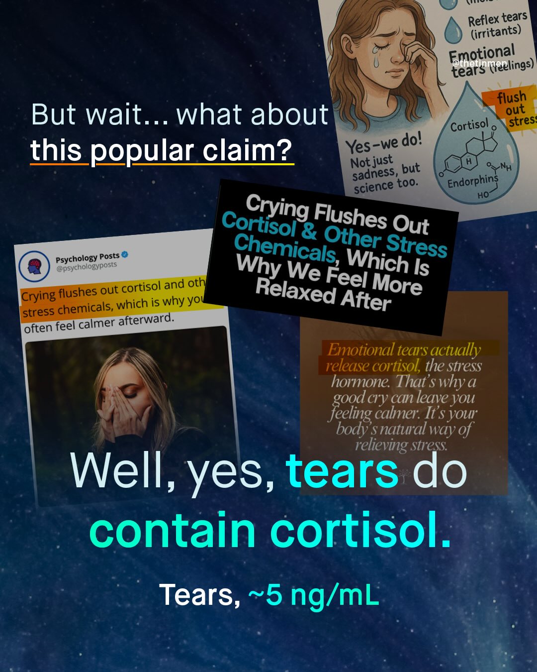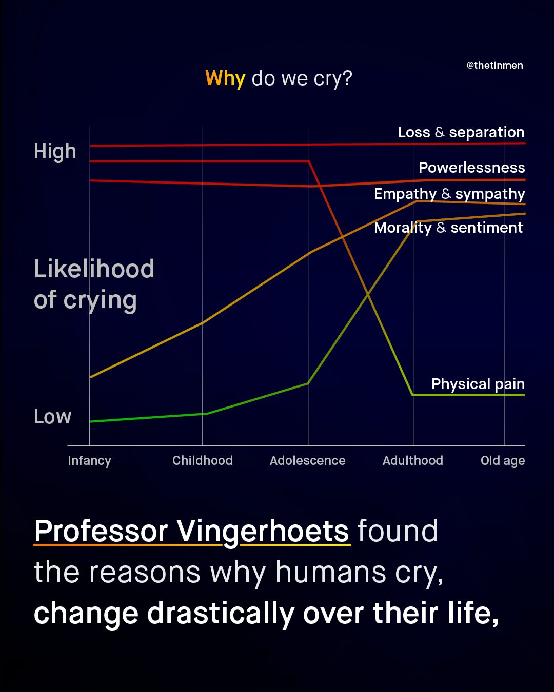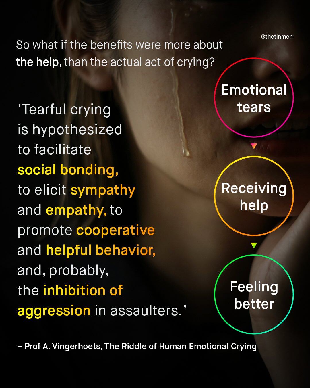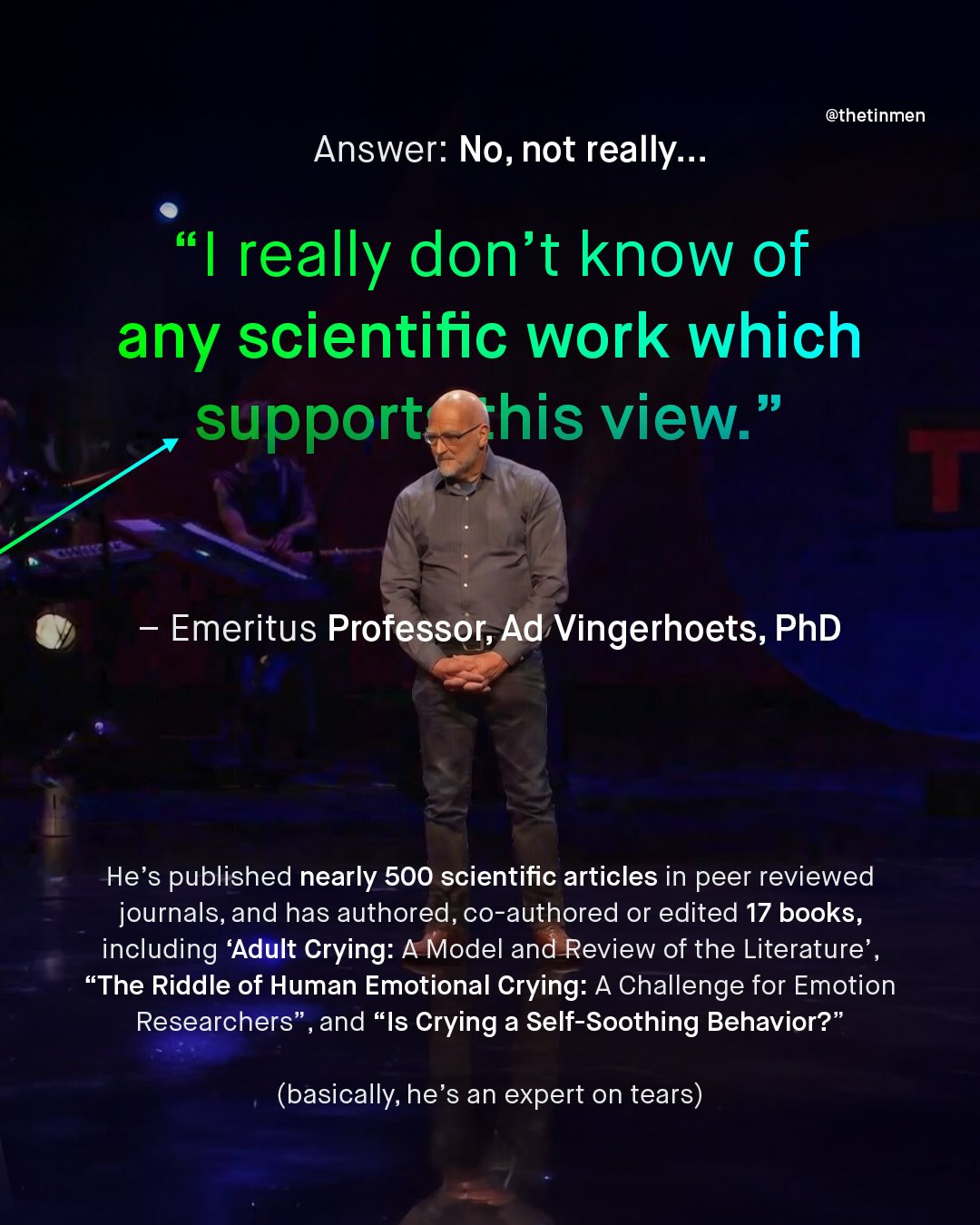 There are no medicinal properties to tears—there, I said it. There are no mystical powers, or mental health catharsis that comes with crying. It’s a fact. Yes. I know. “There is cortisol in tears!” And it’s true. But that doesn’t mean you are “flushing stress out your system” by crying. First of all, the amount of cortisol is tiny, and the volume of water that is excreted by crying, is miniscule. And second, there is cortisol in many things body related – hair, fingernails, ear wax, saliva, fat, muscle, teeth, blood, sweat, even piss and s**t has cortisol in it (and at a higher concentration than tears), and yet I’ve never heard of the same medicinal properties ascribed to taking a dump, have you? However – Emotional tears DO indirectly bring positive mental health benefits. Namely through their ability to signal distress to our peers, and increase the chances that sympathy or support will arrive. Yes. There are many secrets hidden in tears, and many benefits too – just not the ones we’re so often told about. So let’s learn from the world’s leading expert on emotional crying, Emeritus Professor Ad Vingerhoets... What do you think?