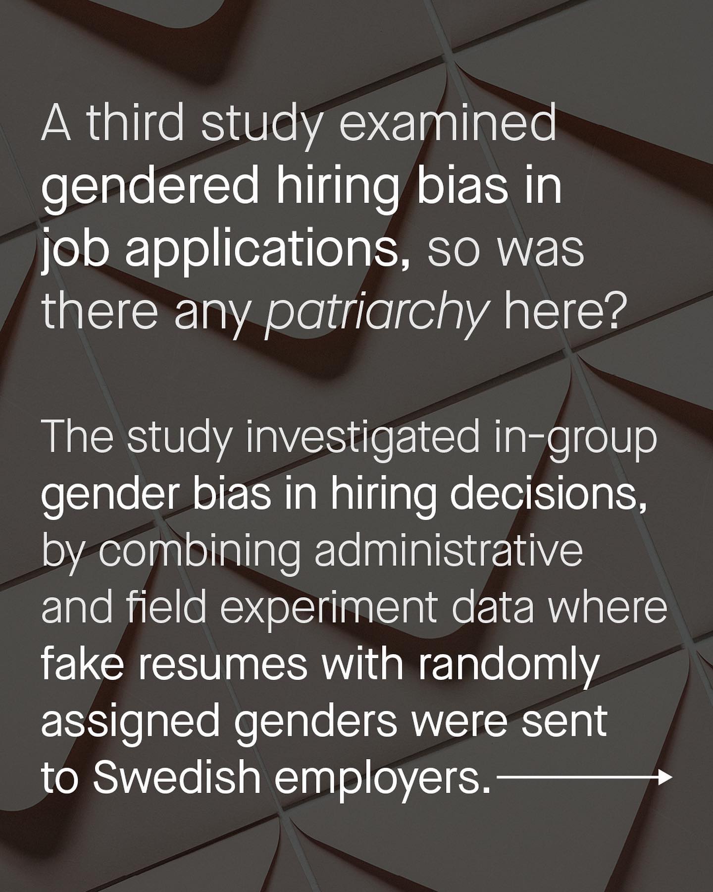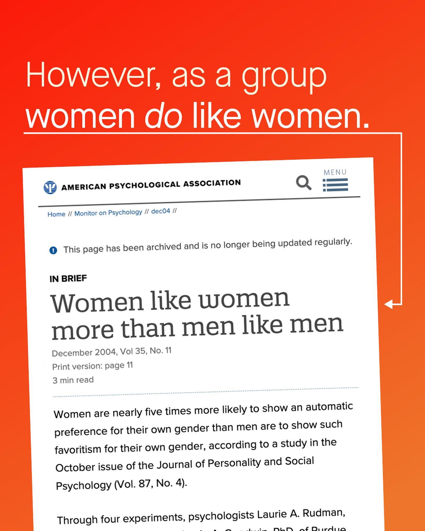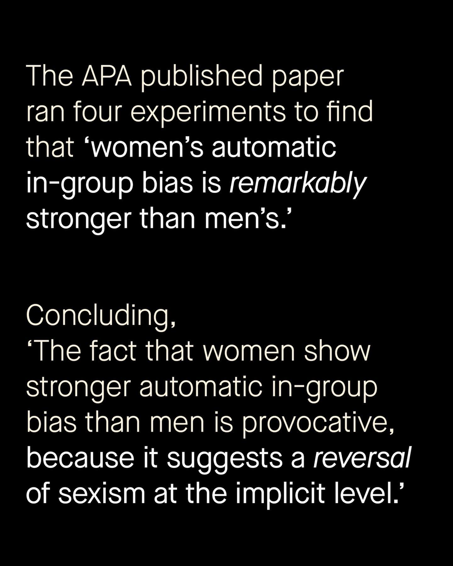 At a fundamental level, for a patriarchy to exist, men will have to value other men, above women. We know the story by now. Laws, policies, jobs, departments, societal structures and social strategies, are designed for the advancement of men – aka male privilege. But whilst it’s undeniable that the laws are written by men (mostly), this in no way means that the laws are written *for* men. Because they aren’t. I’ve never heard of the Office for Mens Health, or seen the Minister for Men. I must have missed the Violence Against Men Act, or lost the Biden Agenda For Men. I for one am looking forward to @UNWomen (and the dozens of other handles the UN has for women) making their first account for men, so too I’m excited to see the Department of Labor launch their Men’s Bureau too. I mean, have you *ever* seen a political leader advocate for men’s issues, or call themselves a men’s advocate? It’s certainly a strange kind of patriarchy. I joke, but beneath this is an obvious truth, for which there is lots of scientific evidence: as a group, men don’t actually value other men above women. And even more uncomfortable, this in-group bias is far more pronounced in women. So let’s take a look.. ~ Source: Study, In Group Bias Fake Gendered Articles APA In Group Bias Hiring Bias Images by Natalie Hua, Diana Light, Monika Kozub, from Unsplash. Illustrations by Kareemov 1000 from the Noun Project