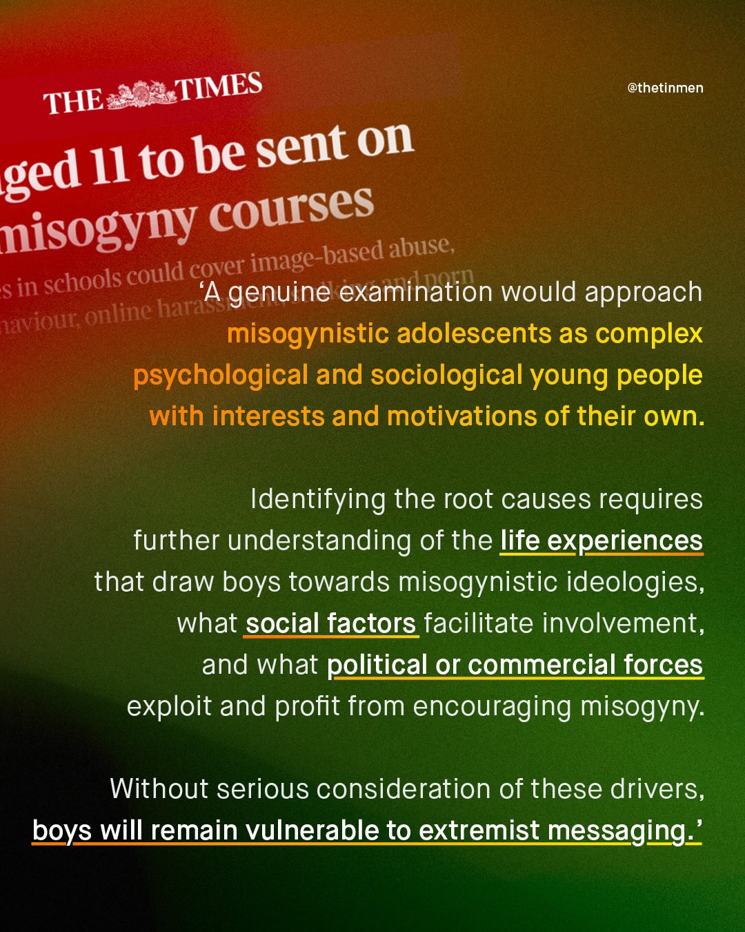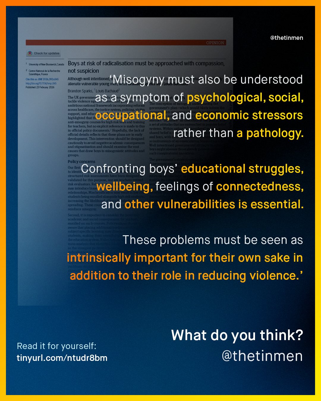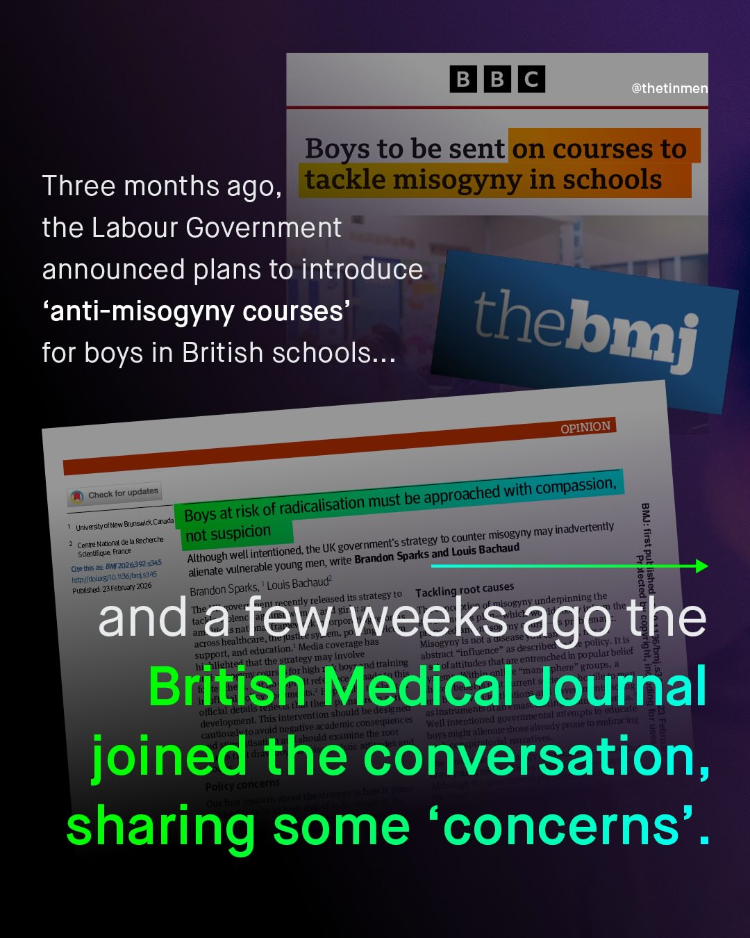 Misogyny is, once again, the talk of the town. And as ever, everyone is worlds apart. One side clutches their pearls, playing the damsel in distress, as if society is about to implode; and the other rolls its eyes, waving away the latest social phenomenon as merely “woke nonsense”. Boys, of course, are in their usual position at the centre. One arm is held firmly by the red team, and the other arm, clutched by team blue, is yanked in the opposite direction. Boys in the middle; are bored, bemused, and betrayed, tired of the squabbling, off being used a political pawns, with their voice drowned out by the explosions and angry yells that echo all around them. The boys, always spoken about, and never too, in an endless cacophony of outrage, and moral panic. What we so desperately need is an expert to talk to us, in real terms, about misogyny. Not the ideological or political kind of ‘expert’, but a medical and scientific one, who can provide a pragmatic, evidence based, and objective view, of just what the hell is going on. The good news is, now we have one. With the British Medical Journal publishing a wonderful opinion piece that dissects, with ease, the culture war, throws a bucket of water onto the moral panic, and gives a long over-due listening ear to the boys in the middle. The title of said piece says it all: ‘Boys at risk of radicalisation must be approached with compassion, not suspicion.’ Let’s take a read. ~ Full BMJ Opinion Piece bmj.com/content/392/bmj.s345
