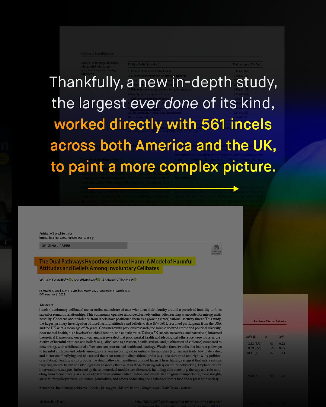 Finally, the anger around “incels”, in the wake of the #Adolescence phenomenon, has subsided; and the outrage merchants who once so valiantly swung sword and shield, now rub their bleary eyes, and in a drunken, bewildered stupor, toddle off to find the next dragon to vanquish. Those of us who carefully mapped out the ‘Incel crisis’ before their (unwelcome) arrival, having had our work stomped upon, are once again left to pick up the pieces, and start again. And so, it is with great hope, that the experts are already back on the horse, leading the charge; doing the real research, to offer real solutions, based on real lived expeirences, to yet again move the needle of progress. A new study, once again, the biggest of its kind – now working with more than 500 incels – has turned up the resolution a few more notches; presenting complex, intersected, and challenging new perspectives on the so-called “Incel pipeline”. Far more complex than the “let’s ban phones” approach suggested by the Adolescence creative team; which is of no surprise, as Jack Thorne and others of his ilk, have zero experience whatsoever, and no right to make knee-jerk, scientifically bankrupt suggestions, and certainly not in the halls of Westminster. So, what does this new study show us about how some boys turn to harmful inceldom? How does it break down incels from being a monolithic, deeply misunderstood group, to being a heterodoxical one, deserving of delineated, careful, and idiosyncratic solutions? And, as it has been so widely suggested – will banning phones, even if it were possible, have any significant impact on the problem at all? What do you think? ~ The Dual Pathways Hypothesis of Incel Harm: A Model of Harmful Attitudes and Beliefs Among Involuntary Celibates Images by Andrej Lisakov, Szabo Viktor and Ben Sweet.