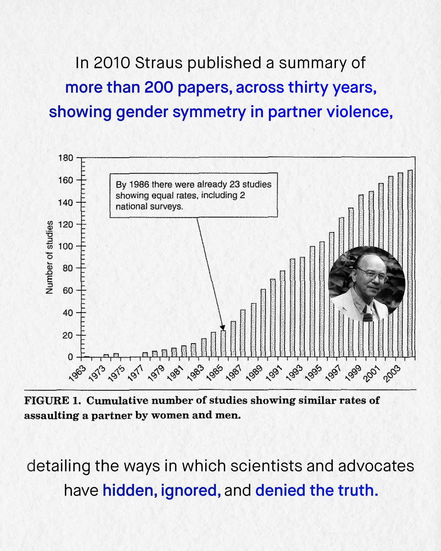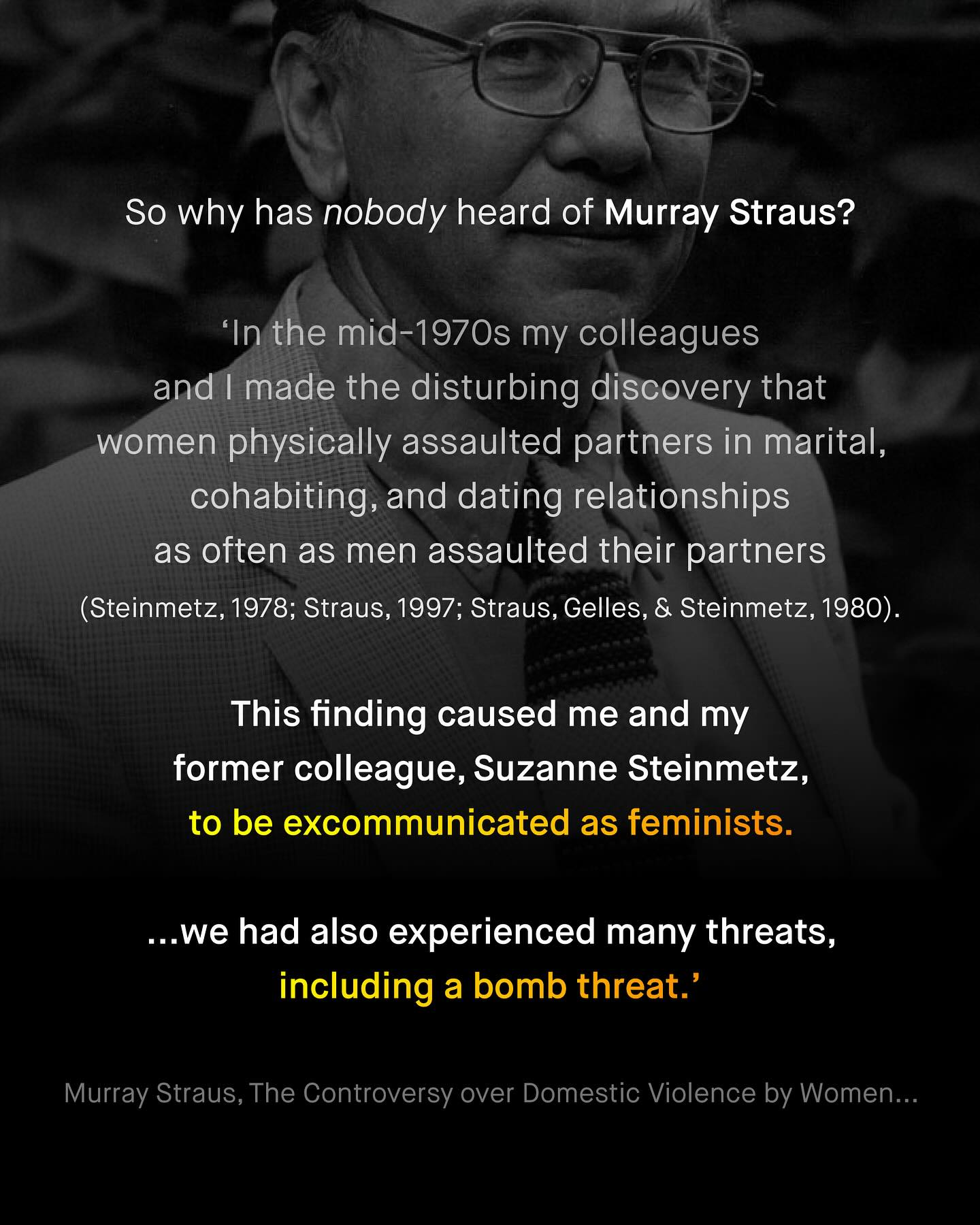 “TheTinMen is a liar!” It’s a familiar sight. But what people don’t realise about TheTinMen, is that I don’t do the research. I just gather the best of it, and present it back to you. Sorry to burst your bubble – But I am not a prestigious professor, whose pioneering work gave birth to an entire field of research, I am not building consortia of scholars, travelling the world, gathering life’s greatest insights. I am not founding journals, research labs, or accepting life time achievement awards. But those whose research I share with you… are. So, to those accusing me of misleading people, of hyperbole, or of flat out lying… Understand you’re not actually accusing me of lying at all, but the giants of whose shoulders I so meekly stand. I suppose, my biggest ‘lie’ – of which I stand accused by even the most noble of advocates – is my insistence of ‘gender parity in partner violence rates’. It’s the one that really gets steam blowing out of peoples’ ears. But, again, it’s not me who’s making that claim, but someone more experienced and knowledgeable than either of us, and likely, anyone else that’s ever lived. For partner violence, that person is the late Professor Murray Straus. The literal founding father of the field of family violence research, whose work provided the bedrock we stand upon, and whose research ranks him alongside other godlike scientific minds like Hawking, Einstein and Friedman. And yes, “gender parity” is the claim he spent a lifetime proving to the world. So put down whatever BuzzFeed article you’re waving around, forget about whatever that sassy finger snapin’ influencer told you, and answer me this… Is Straus ‘lying’ too? Or do you know better than him as well? In my view, to deny the true scale of male victimisation, as so many do, is not only to deny the lived experiences, immiseration and desperate need of millions of men; it is to deny a mountain of compelling data, akin to that of a flat earther waving away NASA photography. So yes, understand what I say is unpopular, of course it is… But does that make me wrong? Well, for that, you must make up your own mind… ~ Straus Study