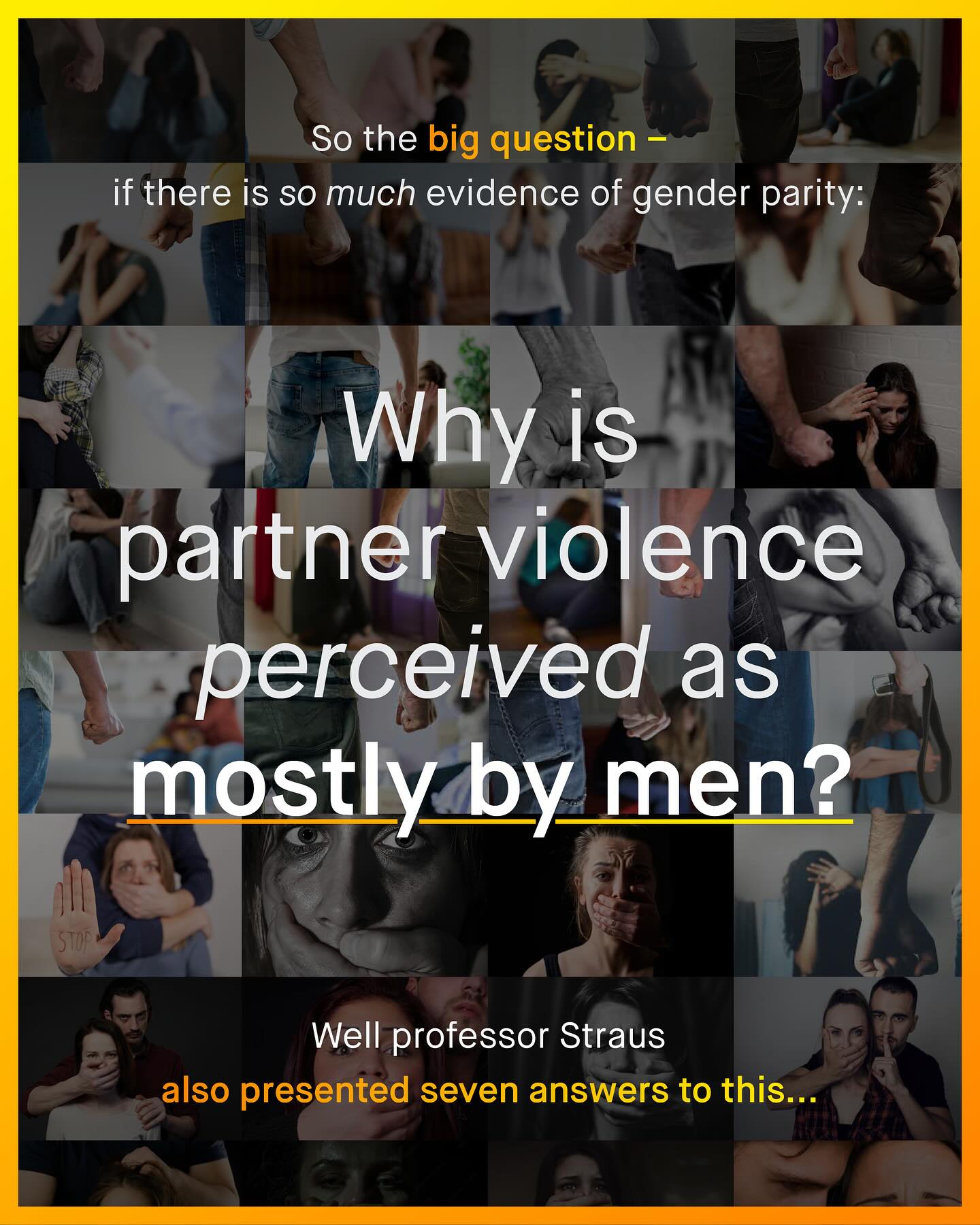 There are few subjects more controversial than male victims of abuse, particularly those at the hands of women. Similarly, there are few subjects more riddled with mistruths, misleading catch phrases, exclusionary language, propaganda, and downright lies, than domestic violence, and few industries more corrupted by ideological dogma too. It is, in my view, an area we will look back at in ten years time, with utter shame, as we realise the scope and scale of our failure, and at the lives, both male and female, destroyed and lost as a consequence. Despite our best efforts to deny the truth, there are quite literally hundreds, if not thousands of studies and surveys that reveal the reality – the ugly reality – that women in relationships are no less violent than men, and that abused men are equally deserving of support, shelter, and a voice too. Murray Straus, the founder of the field of family violence research compiled more than 200 papers showing this gender parity in partner abuse. Sarah Desmarais provided hundreds more. Martin Fibert added 270 to the pile, with an aggregate sample of 440,000 people. Erin Pizzey, who pioneered the movement; opening the first shelter for abused women in the world, and writing the first book on domestic violence; has spent half a century insisting women are just as violent in relationships as men. The PASK, the world’s largest database of domestic violence research, compiled 1,700 papers, and found the same. So you cannot accuse those like me of ‘cherry picking’, as I’ve given you the entire damn orchard, and it all says the same – that women can indeed do anything a man can, and yes, that includes partner violence too. The issue is not about finding the truth, as we clearly have it; the issue is, how and why has it been hidden from us for so long? Well, Straus and his colleagues have given us answers to this too – showing how data is manipulated, erased, and obfuscated; and researchers defunded, harassed, and threatened, so we can maintain the ugly lie that has destroyed the lives of so many. So what is the truth; why is it hidden, and for how much longer will we allow it? What do you think?