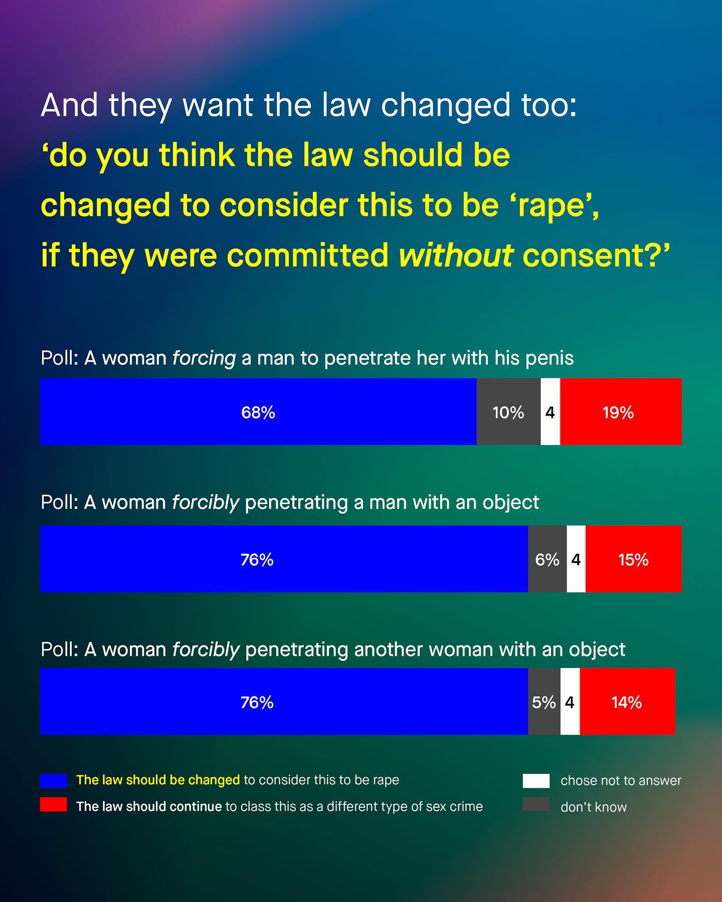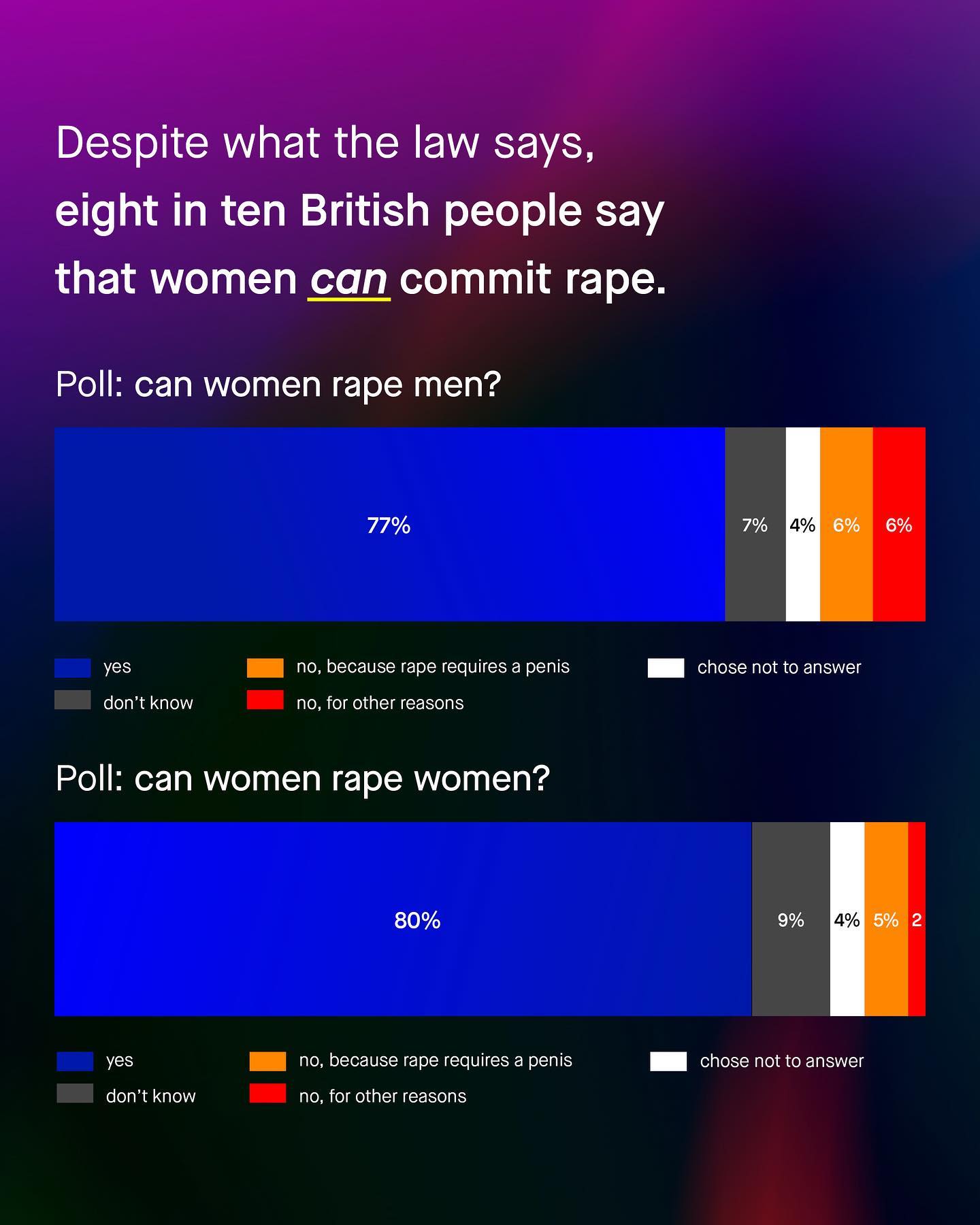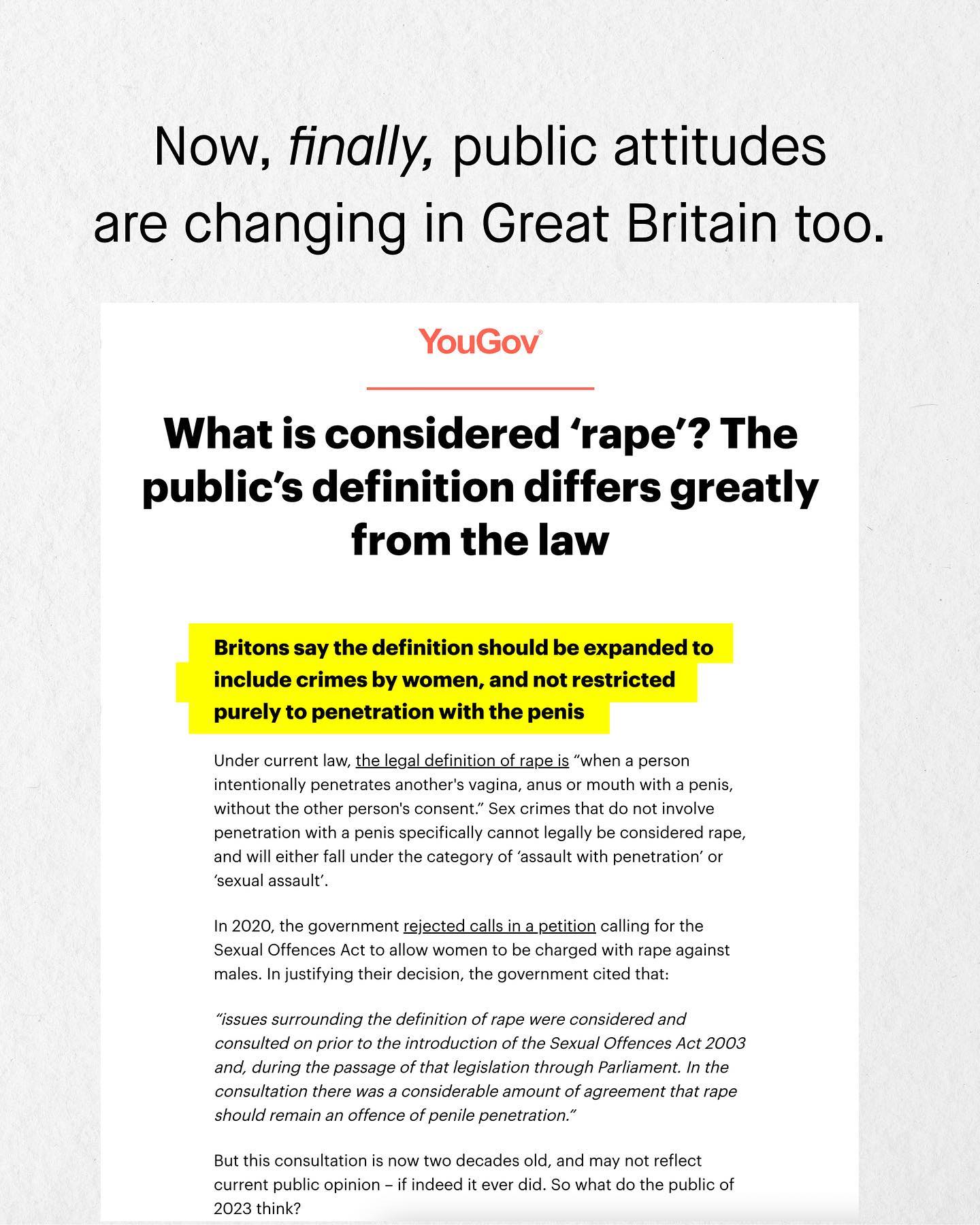 Amongst the scoffs, eye rolls and yells of social media, it’s easy to feel alone in this space. So too it’s easy to feel hopeless. To feel that nobody cares about men and boys; to think that the tantrums and whines of a few brittle social media brats, represent the words of the many. But this is not true. You are not alone. Not in the least. People do care about men and boys, they just don’t know what’s going on. And people do agree with us, they are just never asked. Recently however, they were asked, and they turned out for boys and men in staggering numbers. If you follow me, you’ll know that by British law, a woman cannot be charged for ‘rape’ against a man or boy, or anyone else. Quite literally no such crime exists, and changing this legislation to recognise all survivors of rape, has been at the centre of campaigning for men and boys for many years. Now, finally, the public have been asked to weigh in too, and nearly 80% believe a woman *can* rape a man. Whilst those in support of changing the law to recognise this, outnumber those who don’t by nearly four to one. So don’t be fooled, you are not alone, they are. And they will become more and more alone as support for their ideas wanes, and understanding and compassion of men and boys continues to grow. So hold old a little longer. And in the mean time, let’s ask – can women rape men? What do you think? ~ YouGov Poll Images by Gradienta and Mathias Reding from Unsplash Illustration by Alice Noir #sexualviolence #malesurvivors #mensissues