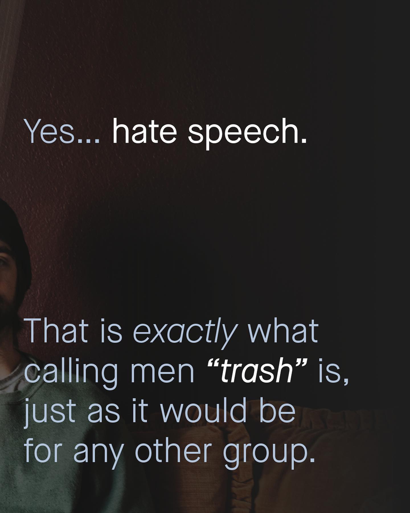 The back bending mental gymnastics of many feminist social media accounts will make you wince. Bizzare pretzel like contortions. Shrill semantic spluttering. False equivalences and down right stupidity. So let’s be clear. There is nothing - no ifs, buts, or howevers - that gives you the right to insult men as a group. Hate is hate. And there is no justifying it. We can all point to problematic individuals from our lifetime; but the past is to make you better, not bitter - and certainly not the same. So who are these people who continually berate, degrade and insult ‘men’, and when will they be held to account? Because men are not trash. Just like all people; the vast majority of them are wonderful, kind, caring and good… and they deserve better. So who are men to you?