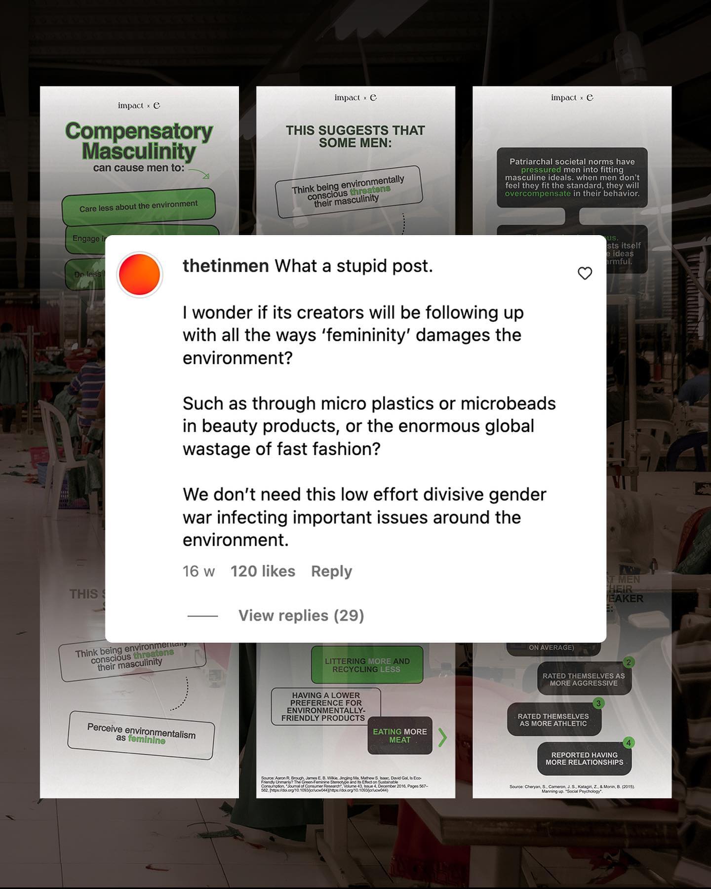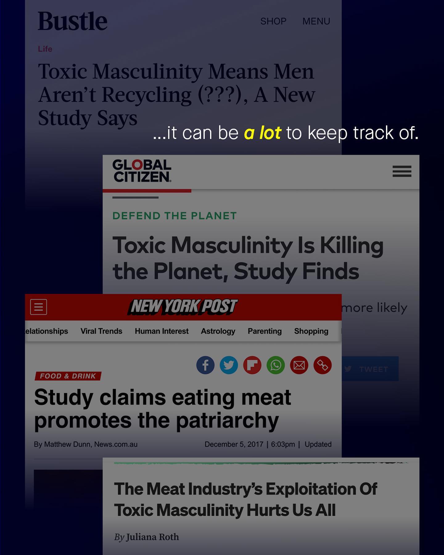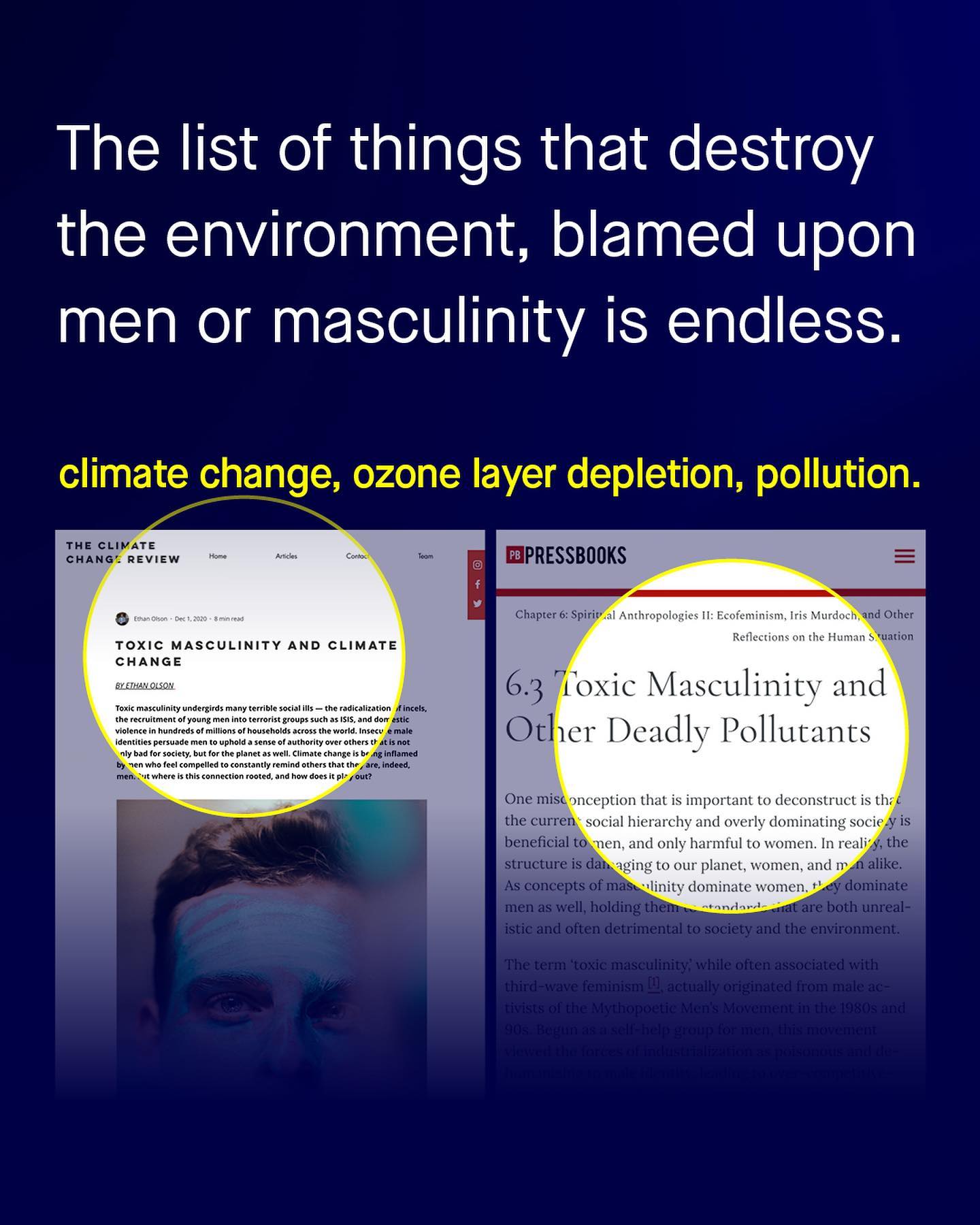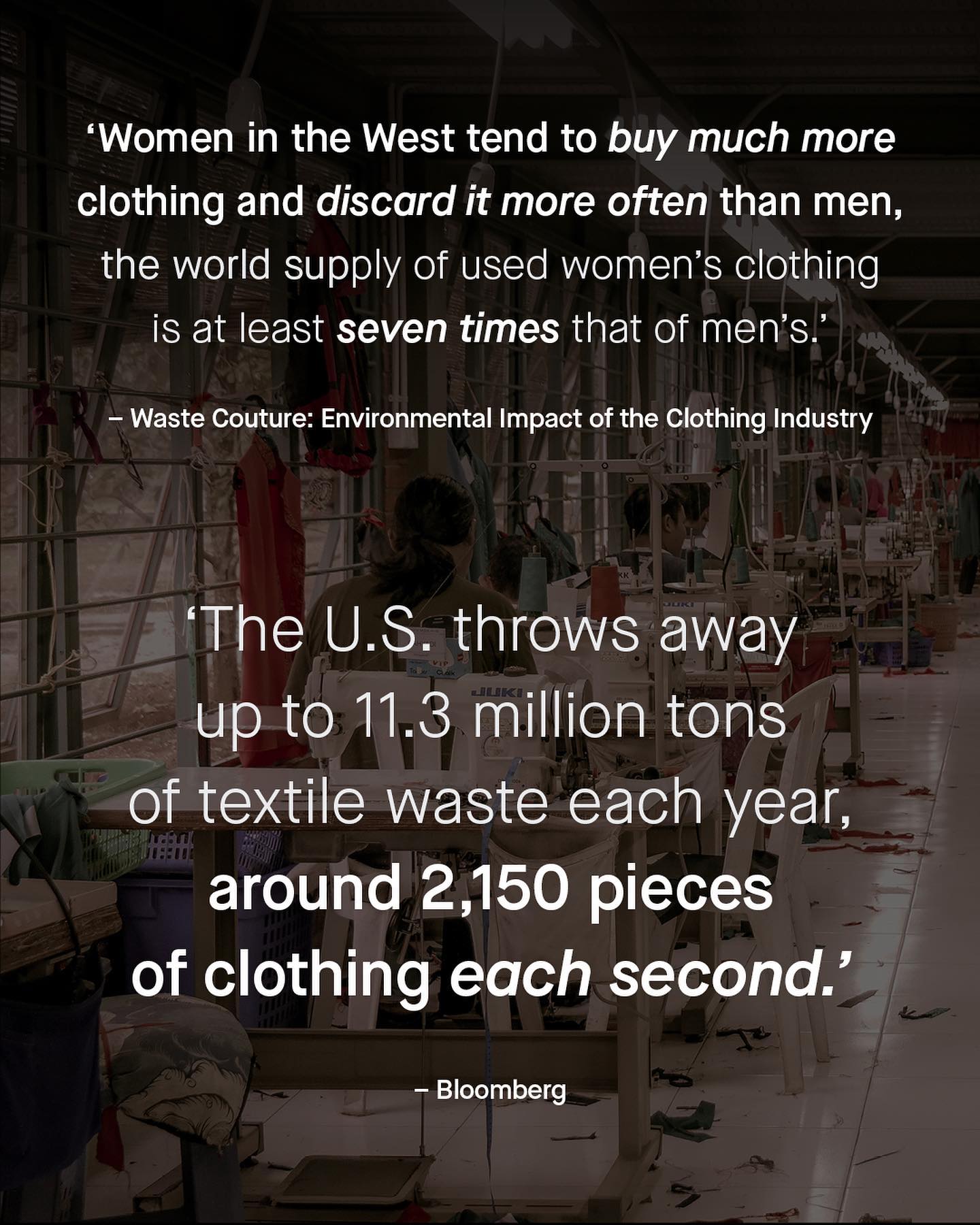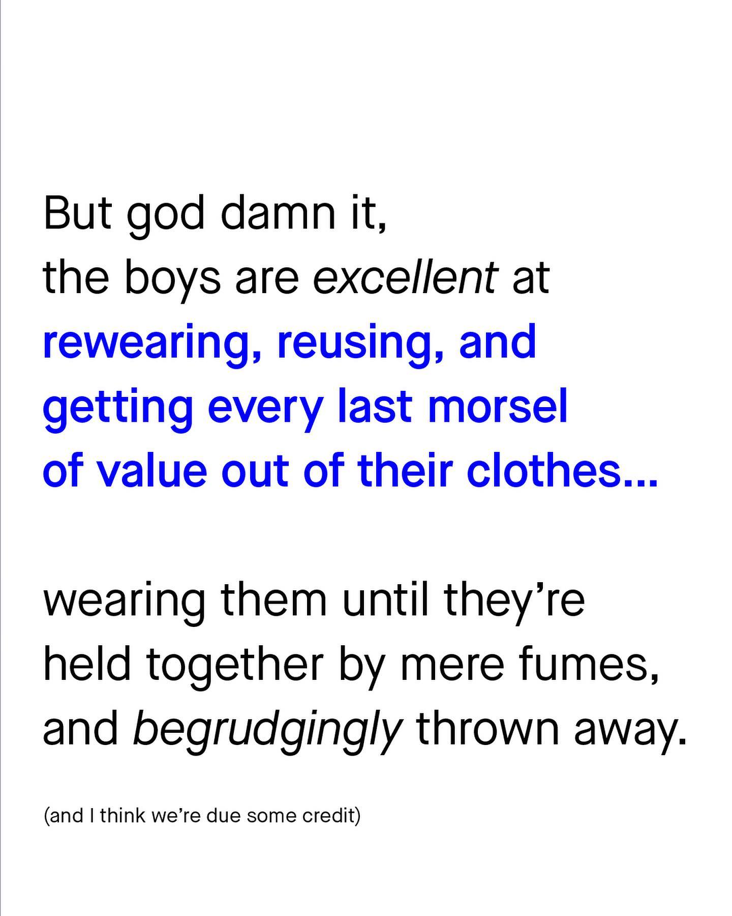 Not recycling. Littering. Pollution. The literal end of the world… Sometimes men can find themselves to blame for so many new and exciting things, simply by existing. ‘Man-made crisis: toxic masculinity drives climate change’, yells one headline. ‘Toxic Masculinity is killing the planet’, shouts another. ’Eating meat promotes the patriarchy’, says a particularly absurd third. Each performing Gold Medal winning performances of mental gymnastics, twisting and contorting, to tie more and more contrived issues to ‘masculinity’. Somehow not recycling is our fault. So is pollution. Ozone depletion. Meat eating, and climate change too. Yes the booming world of nonsense non-science is spitting out headlines and stirring political controversy like, well… it’s the end of the world. Who cares about science. Whatever it is, men are the problem - as the giant blob, continues to silently pull the strings of society. But amongst all the environmental carnage at their feet, one of the things I think we can credit men for, is how good we are at rewearing our clothes, holding onto them until they’re almost in bits, and hanging off our bodies. I mean I’ve seen my dad sew patches, onto the patches of his sweaters. And I’m sure he’s not the only one. Yes (in general) I’d say, as men, our tastes are frugal, and our commitment to our favourite jumper, jeans, or pair of shoes, right until their last days, is commendable. In fact, I’d go as far to call men the ‘role models’ of how to responsibility buy clothing. And in a world where fast fashion generates more waste, more pollution, and more micro plastics than ever – I’d say these are lessons worth listening to. So if we are to ‘gender’ pollution, littering, meat eating and not recycling to men; why not ‘gender’ fast fashion, wastage, and micro plastics to women? (By the way, I’m being satirical, the idea of gendering any environmental issue, is stupid) What do you think? ~ Study – Waste Couture Bloomberg Images by Rio Lectatompessy, and Gradienta. #fastfashion #environmentalism #climatechange #fastfashionsucks
