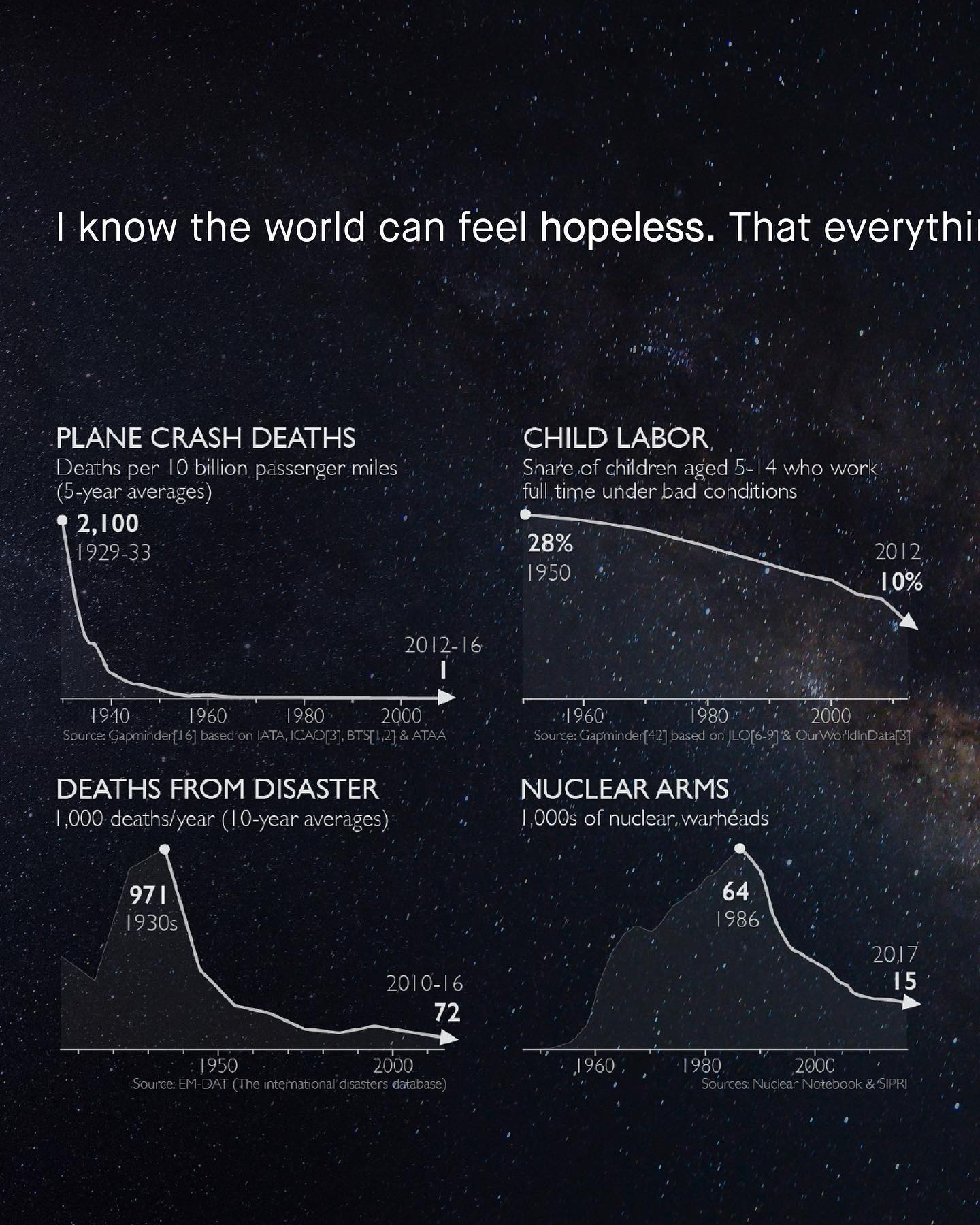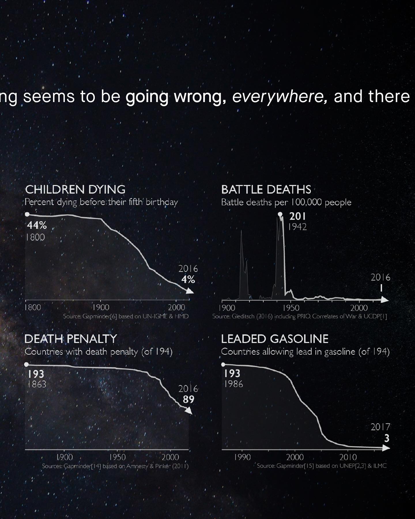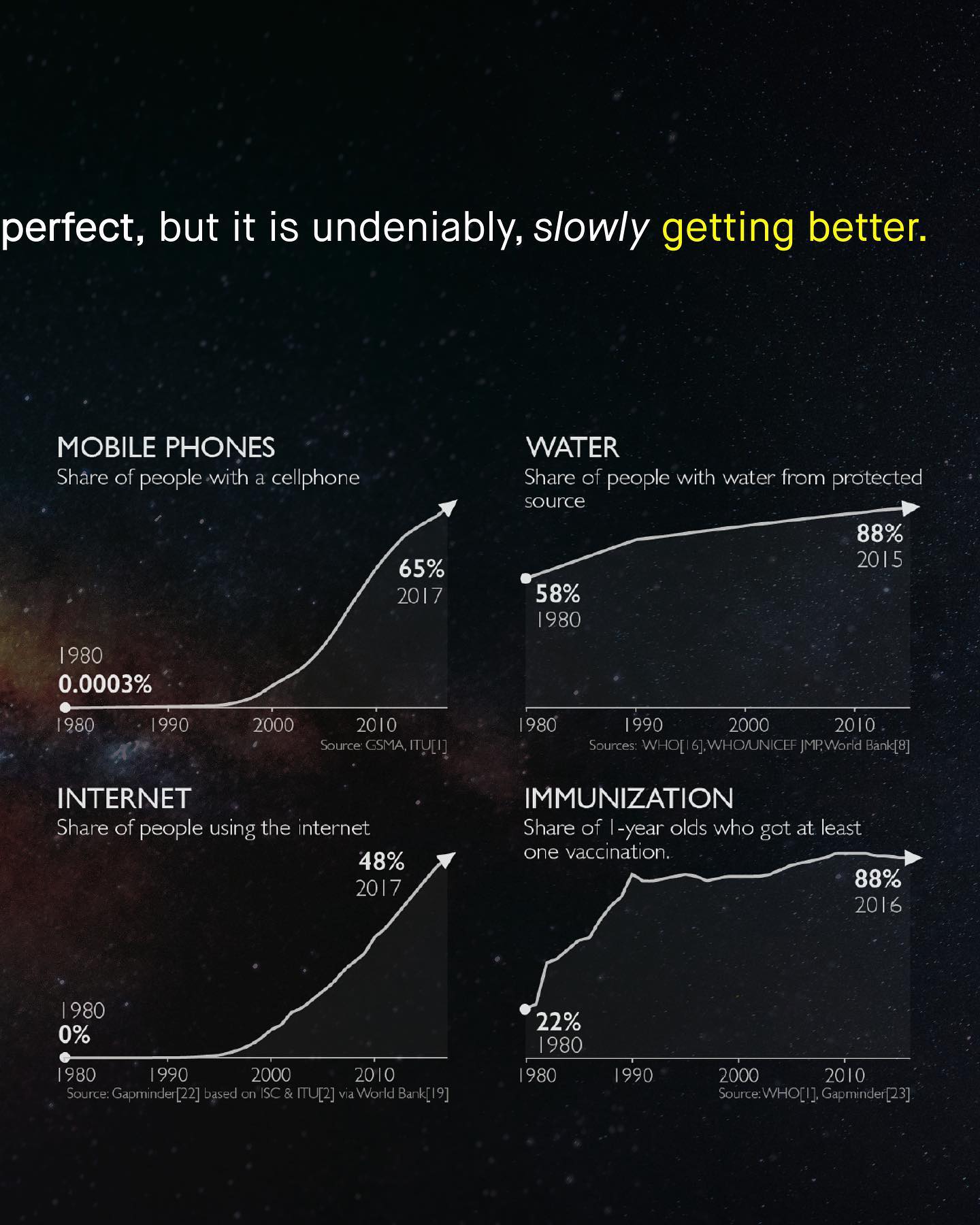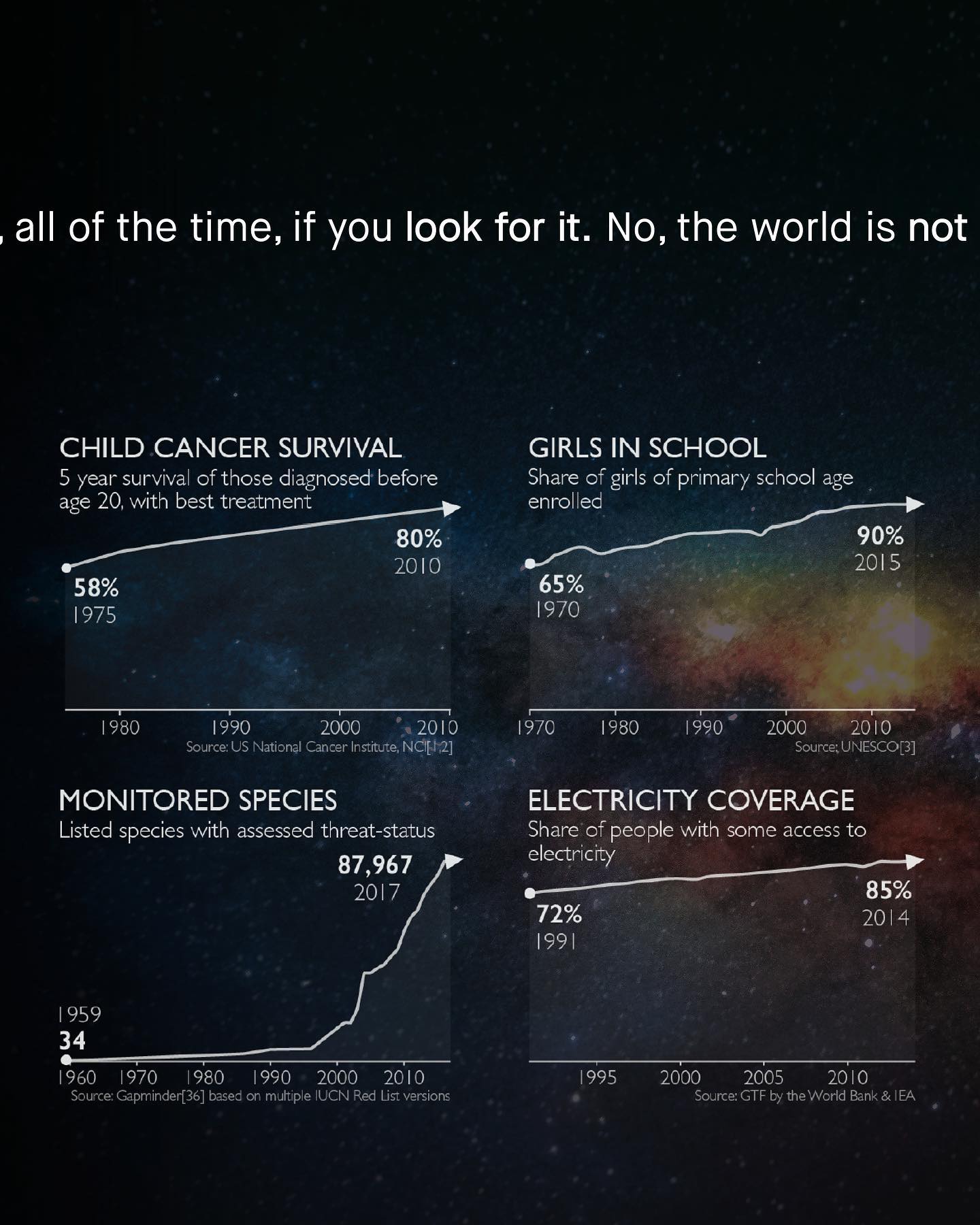 In 2016 40 million planes landed safely at their destination. Meanwhile, 10 ended in fatal accidents – which is 0.000025% of the total. Which of these flights do you think the journalists wrote about? “News at 10! Flight B0134 landed safely in London. Thanks for joining us! Good night.” I doubt it. In the past 70 years (when it actually was dangerous) flying has gotten 2,100 times safer. Yet as your plane zooms down its runway juttering to an awkward take off, this slow but unprecedented march of aeronautical progess will no doubt vanish from your mind. These remarkable (albeit slow) trends of human achievement and progress are by no means only found in planes; but in many, many areas, everywhere, in all corners of the world. Yes. The world is safer, smarter, healthier, more free, more protected, and more peaceful than ever in human history. But many will have you believe such wonderful news is not true. And would rather you live in terror; sat permanently in the brace position, clutching your life jacket, and awaiting the inevitable fireball ahead. But I refuse to live such a life. I want to look out the window and watch the sunset clouds cascade by. I want to recline my seat and drink from one of those tiny cans of coke. And for some of the time, so should you. That doesn’t mean there’s not still a lot of pain ongoing, or urgent problems to be solved, and many millions to be saved. But it is, as Professor Hans Rosling puts it, possible for things to be ‘both bad, and getting better.’ And they are. Things are getting better. Everywhere. Let’s take a look. ~ Data taken from ‘Factfulness’ by Professor Hans Rosling. ~ Images by Max McKinnon, Nasa, Gary Scott, Aldebaran, Shot by Cerqueira and anirudh from Unsplash #goodnews