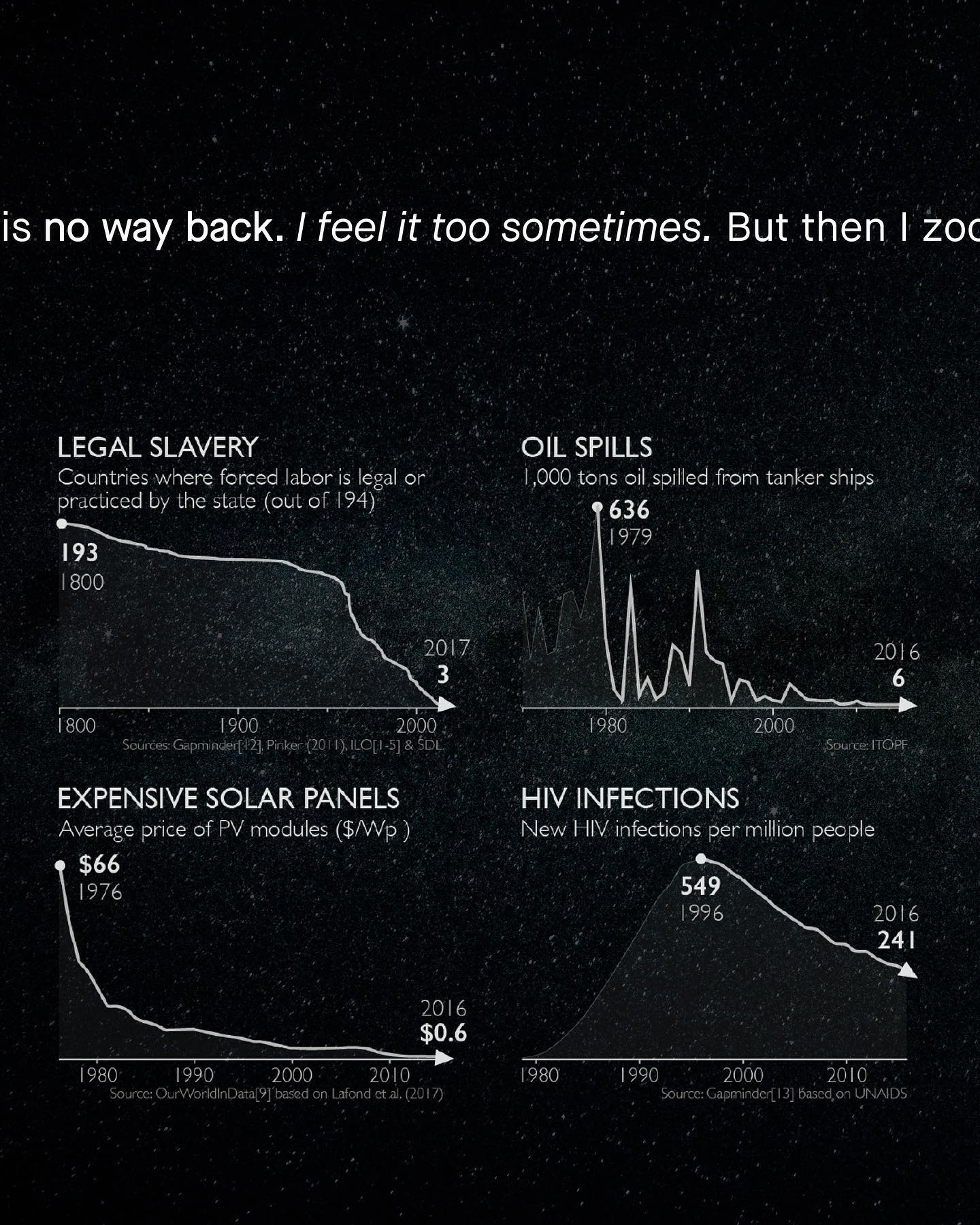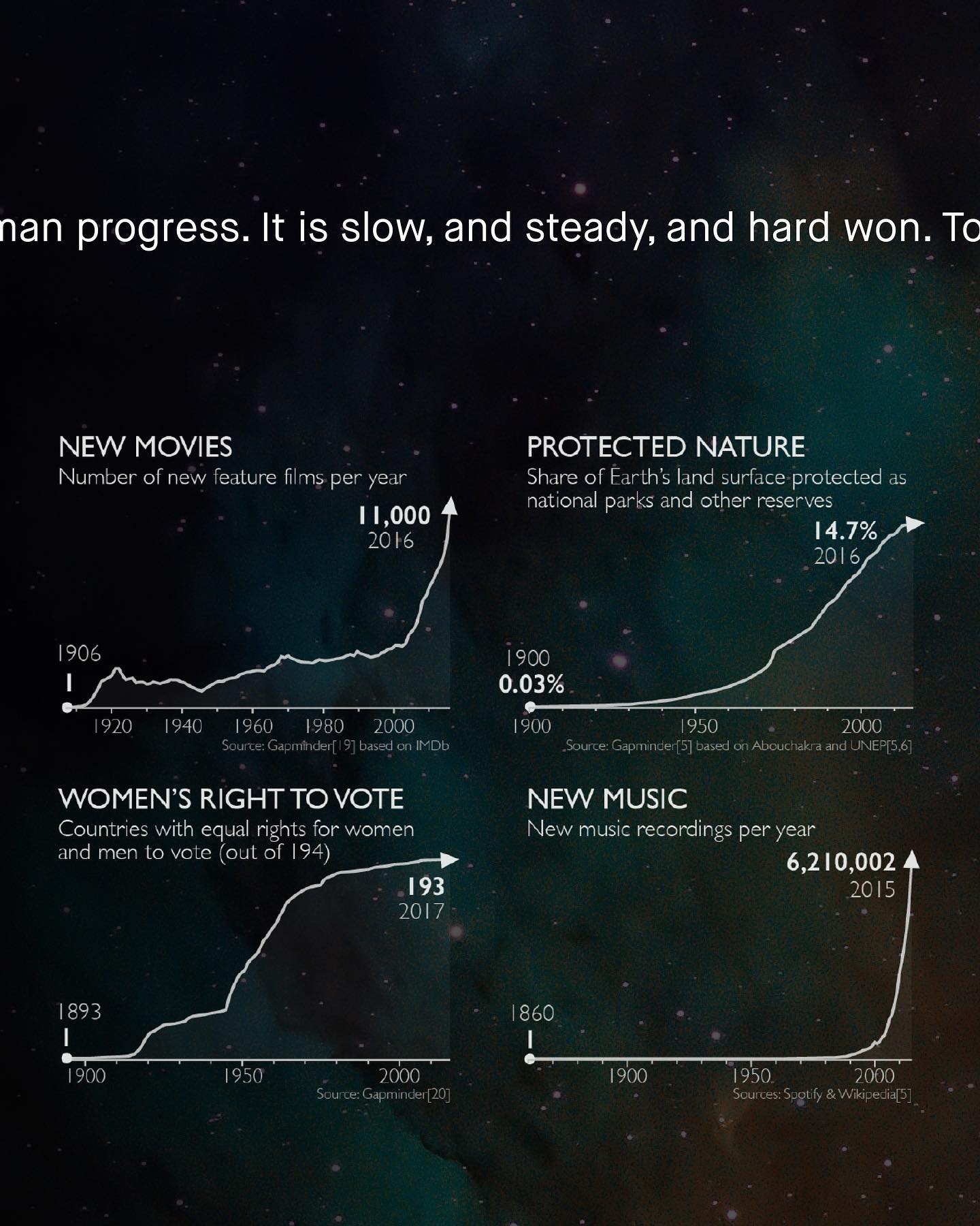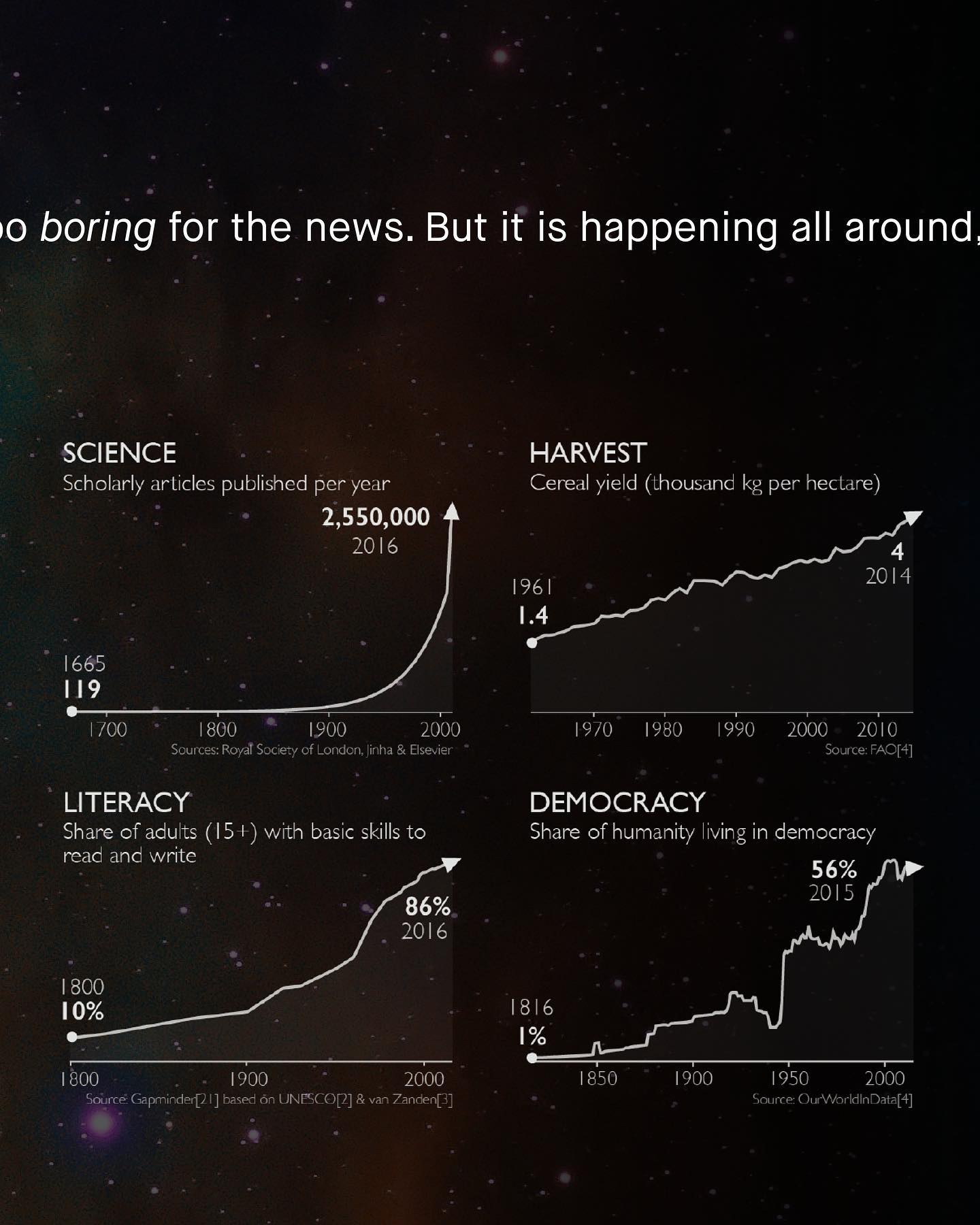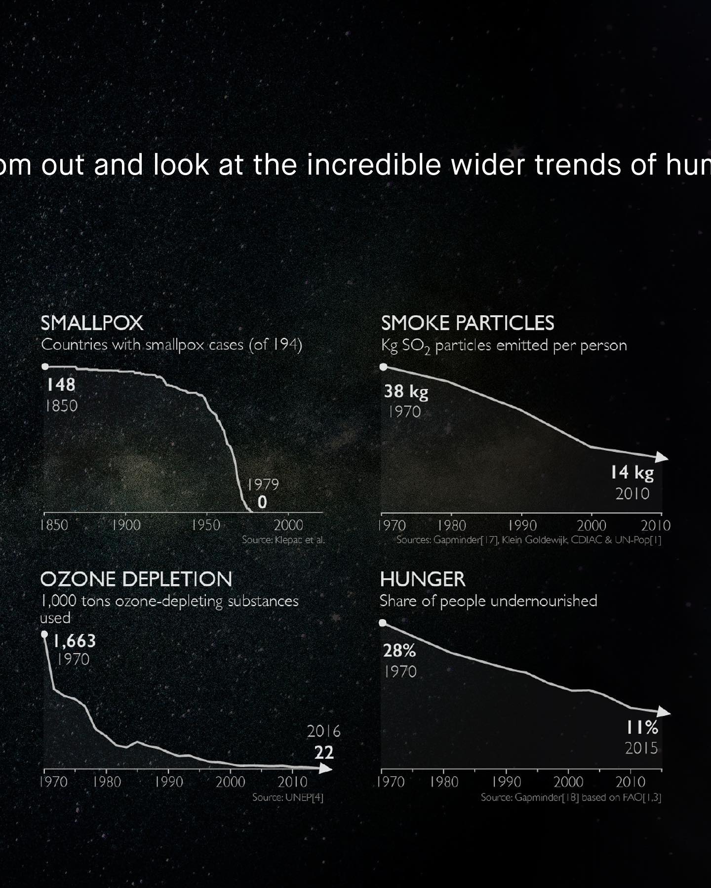 In 2016 40 million planes landed safely at their destination. Meanwhile, 10 ended in fatal accidents – which is 0.000025% of the total. Which of these flights do you think the journalists wrote about? “News at 10! Flight B0134 landed safely in London. Thanks for joining us! Good night.” I doubt it. In the past 70 years (when it actually was dangerous) flying has gotten 2,100 times safer. Yet as your plane zooms down its runway juttering to an awkward take off, this slow but unprecedented march of aeronautical progess will no doubt vanish from your mind. These remarkable (albeit slow) trends of human achievement and progress are by no means only found in planes; but in many, many areas, everywhere, in all corners of the world. Yes. The world is safer, smarter, healthier, more free, more protected, and more peaceful than ever in human history. But many will have you believe such wonderful news is not true. And would rather you live in terror; sat permanently in the brace position, clutching your life jacket, and awaiting the inevitable fireball ahead. But I refuse to live such a life. I want to look out the window and watch the sunset clouds cascade by. I want to recline my seat and drink from one of those tiny cans of coke. And for some of the time, so should you. That doesn’t mean there’s not still a lot of pain ongoing, or urgent problems to be solved, and many millions to be saved. But it is, as Professor Hans Rosling puts it, possible for things to be ‘both bad, and getting better.’ And they are. Things are getting better. Everywhere. Let’s take a look. ~ Data taken from ‘Factfulness’ by Professor Hans Rosling. ~ Images by Max McKinnon, Nasa, Gary Scott, Aldebaran, Shot by Cerqueira and anirudh from Unsplash #goodnews