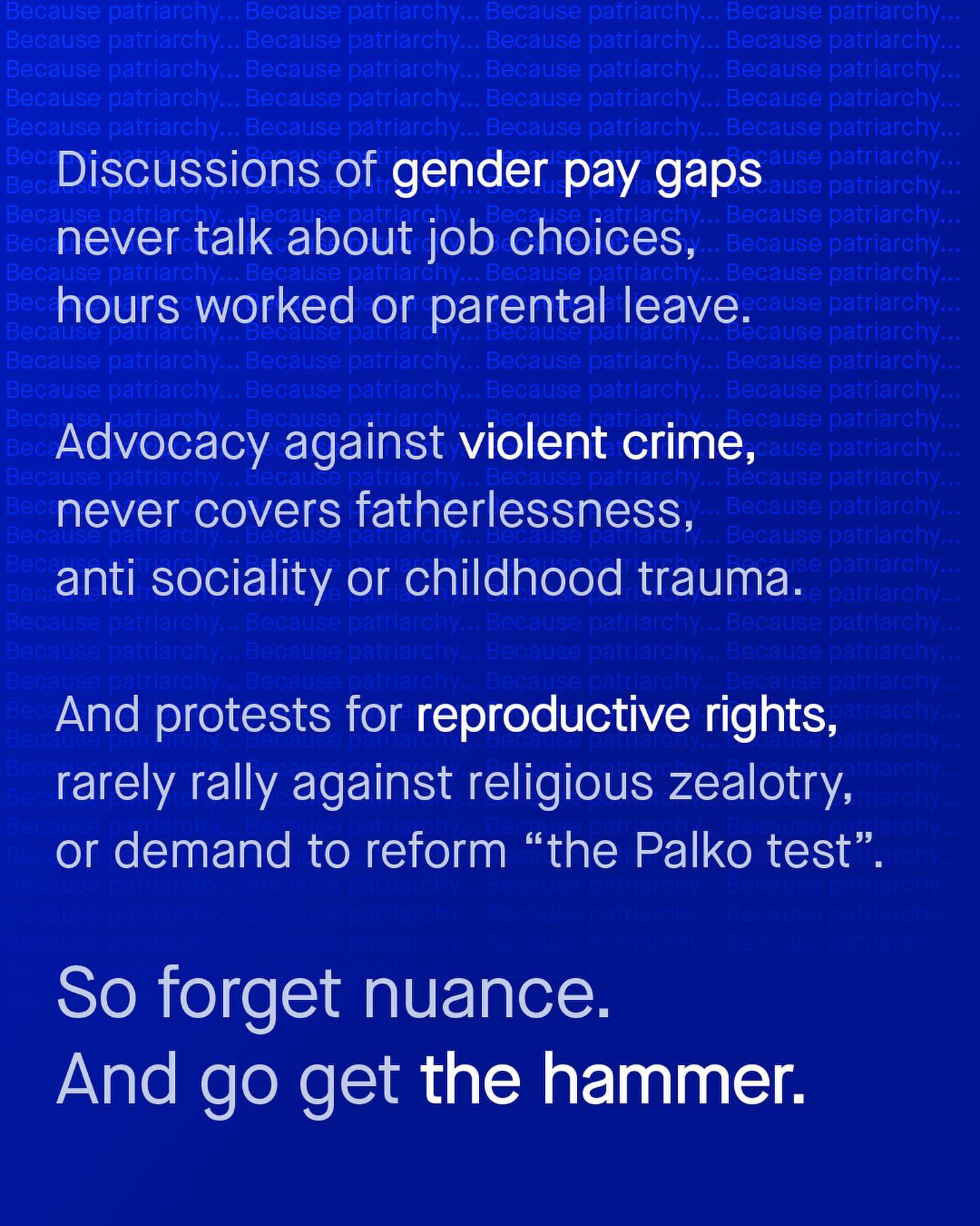 I think I’ve seen enough definitions of ‘patriarchy’ to fill a dictionary of its own. It’s the world’s ultimate super villain. It’s stigmatising body hair, it’s causing men to kill themselves, it’s removing rights from fathers and taking the pockets from women’s clothing. It’s a 20% wage cut on women’s payslip, and it’s stopping them from becoming engineers. It’s putting men in power, taking them out of it, and throwing them onto the streets. It does everything, everywhere, and fucks everything right up, for everybody. Global warming? Patriarchy. Wealth inequality? Patriarchy. Racism? Patriarchy. Male violence? Patriarchy. Female violence? Ah shit well the patriarchy made her do it. But words that mean so much, also mean nothing. It’s all fun and games really, buy into whatever world view you like – but the problem is ‘the patriarchy’ is being used to dissect and address incredibly complex societal problems, where it fixes nothing and only wastes time, money and resources. It’s at the centre of our politics, it's the ink that writes intervention strategies, and the boring bluster from our politicians. Perhaps most of all its the fraudulent lens through which we view domestic violence… So let’s have a look ~ Risk Factors Bates and Graham-Kevin Felson and Outlaw Straus Pence Illustration by Gan Khoon Lay from the Noun Project. Images by Gradienta and Cesar Carlevarino from Unsplash.