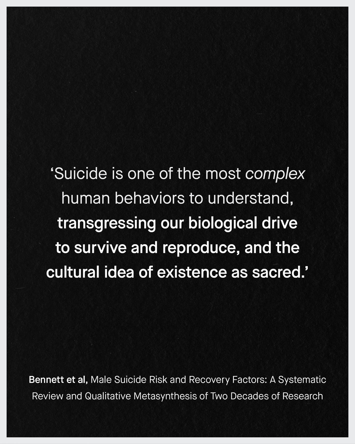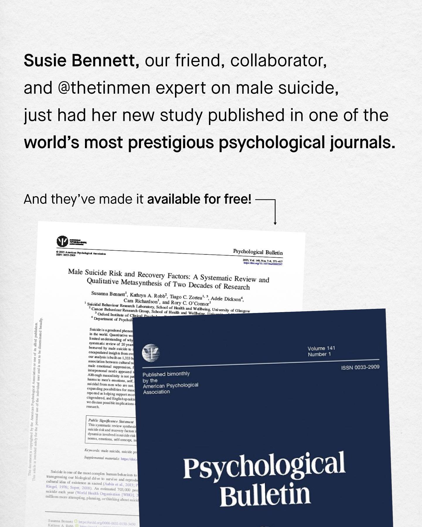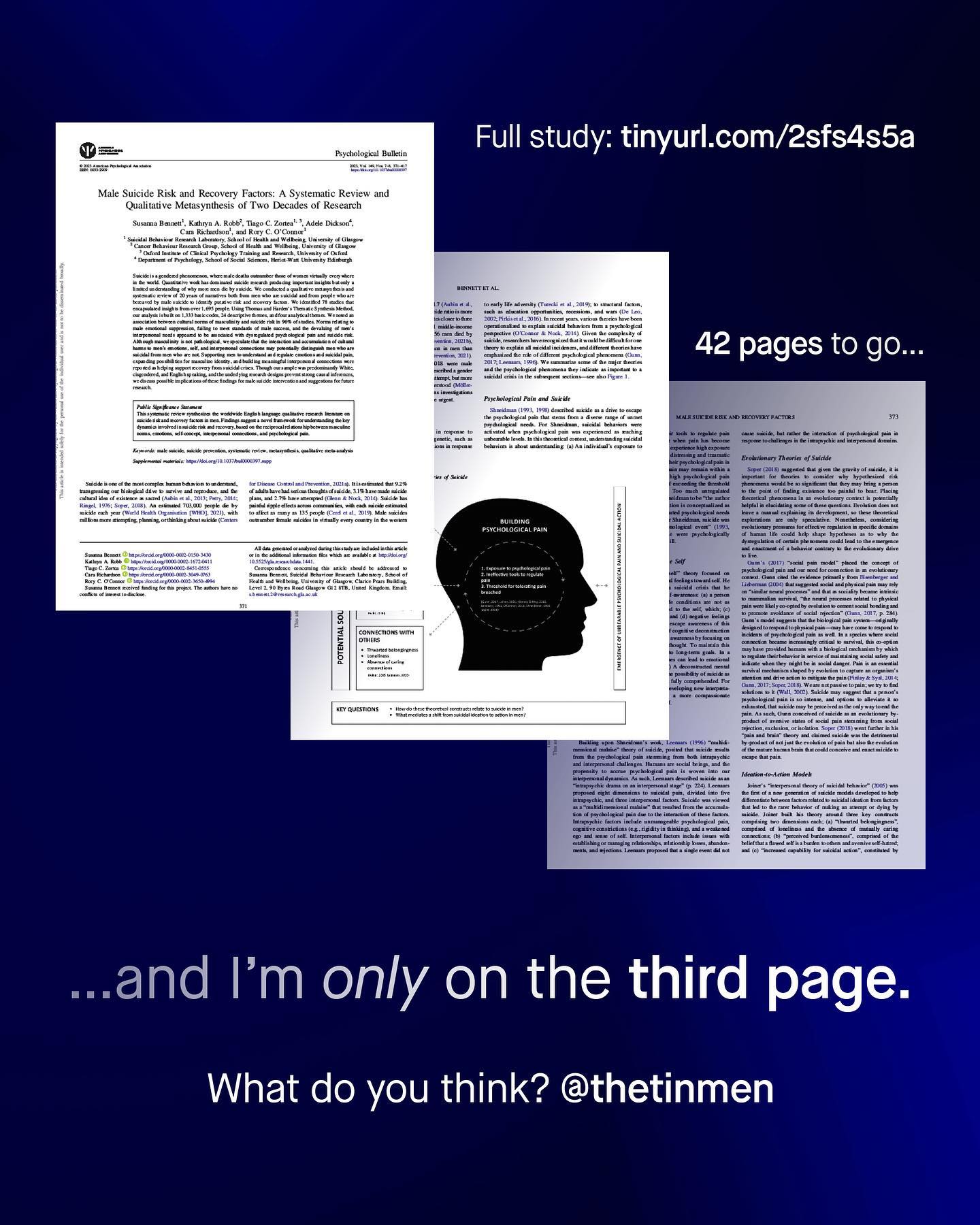 Suicide is an incredibly complex worldwide phenomenon that claims more lives than war, murder and natural disasters combined. It’s also an epidemic that claims more male lives in virtually every country in the world – and is now the single largest cause of early death in young men. And yet for such a tragic and devastatingly massive issue, male suicide has become the centre of political fighting, and hijacked by radical anti-male rhetoric, and nonsensical social justice jargon. Remember, ‘men’ are not a homogenous group. Similarly, male suicide cannot be chalked up to a singular cause, or a quippy hashtag. ’Toxic masculinity’, ‘male privilege’, and ‘patriarchy theory’ are the unwelcome guests to a discussion they were never invited to, and from which they will not leave. As we know, the study of male suicide needs to be apolitical and evidence based, rather than an ideological war ground. And those unable or unwilling to broaden such perspectives are simply not welcome to the conversation any longer. Such mindless rants take up all the oxygen; to distract, deny, and cause division where there needn’t be any. Male suicide should not be a controversial topic; we all want to save our men and boys. So it’s with great pride that I can announce Susie Bennett’s game changing meta synthesis has finally been published, by the world’s most respected psychological journal – The APA’s Psychological Bulletin. Let this be the first word in a more inclusive and far better conversation around male suicide. ~ READ IT FOR FREE Images by Gradienta, Codioful, Jason Leung, Kiwi Hug, Nartan Buyukuildiz from Unsplash. Illustration by Aidan Cooke #malesuicideawareness #malesuicide #nationalsuicidepreventionweek #suicideprevention #malesuicidettm
