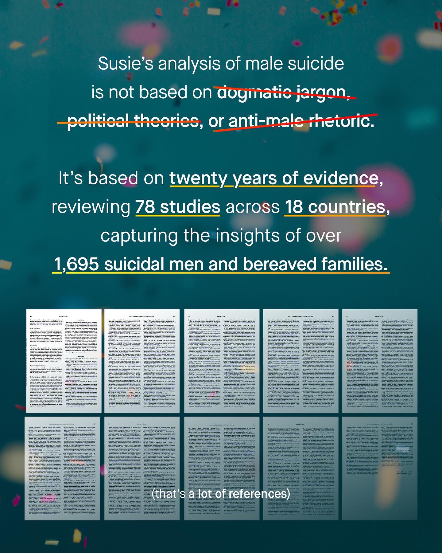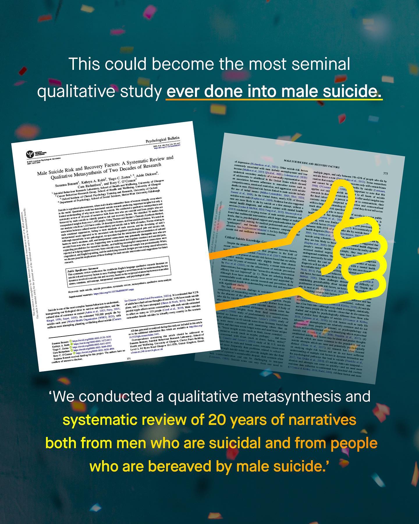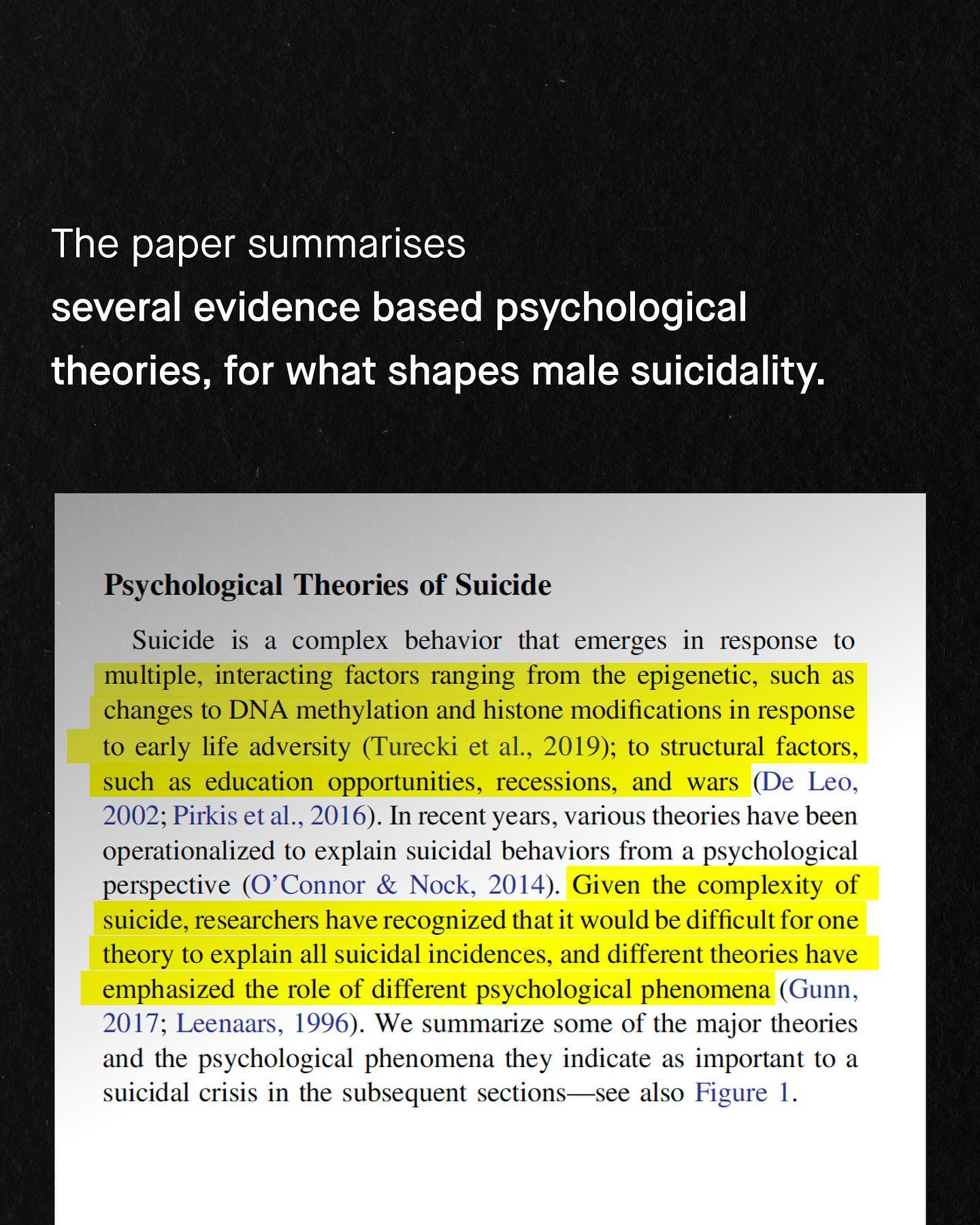 Suicide is an incredibly complex worldwide phenomenon that claims more lives than war, murder and natural disasters combined. It’s also an epidemic that claims more male lives in virtually every country in the world – and is now the single largest cause of early death in young men. And yet for such a tragic and devastatingly massive issue, male suicide has become the centre of political fighting, and hijacked by radical anti-male rhetoric, and nonsensical social justice jargon. Remember, ‘men’ are not a homogenous group. Similarly, male suicide cannot be chalked up to a singular cause, or a quippy hashtag. ’Toxic masculinity’, ‘male privilege’, and ‘patriarchy theory’ are the unwelcome guests to a discussion they were never invited to, and from which they will not leave. As we know, the study of male suicide needs to be apolitical and evidence based, rather than an ideological war ground. And those unable or unwilling to broaden such perspectives are simply not welcome to the conversation any longer. Such mindless rants take up all the oxygen; to distract, deny, and cause division where there needn’t be any. Male suicide should not be a controversial topic; we all want to save our men and boys. So it’s with great pride that I can announce Susie Bennett’s game changing meta synthesis has finally been published, by the world’s most respected psychological journal – The APA’s Psychological Bulletin. Let this be the first word in a more inclusive and far better conversation around male suicide. ~ READ IT FOR FREE Images by Gradienta, Codioful, Jason Leung, Kiwi Hug, Nartan Buyukuildiz from Unsplash. Illustration by Aidan Cooke #malesuicideawareness #malesuicide #nationalsuicidepreventionweek #suicideprevention #malesuicidettm
