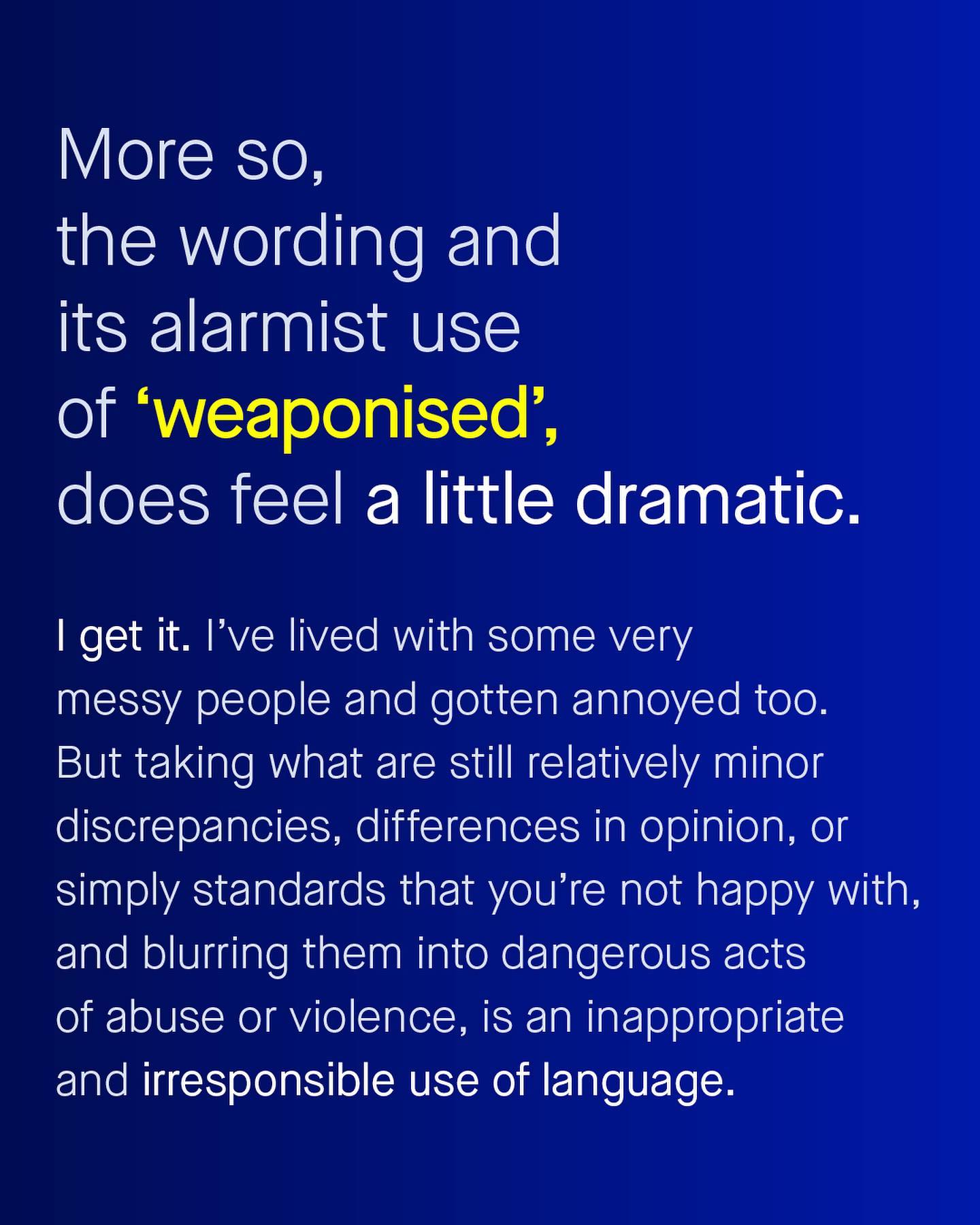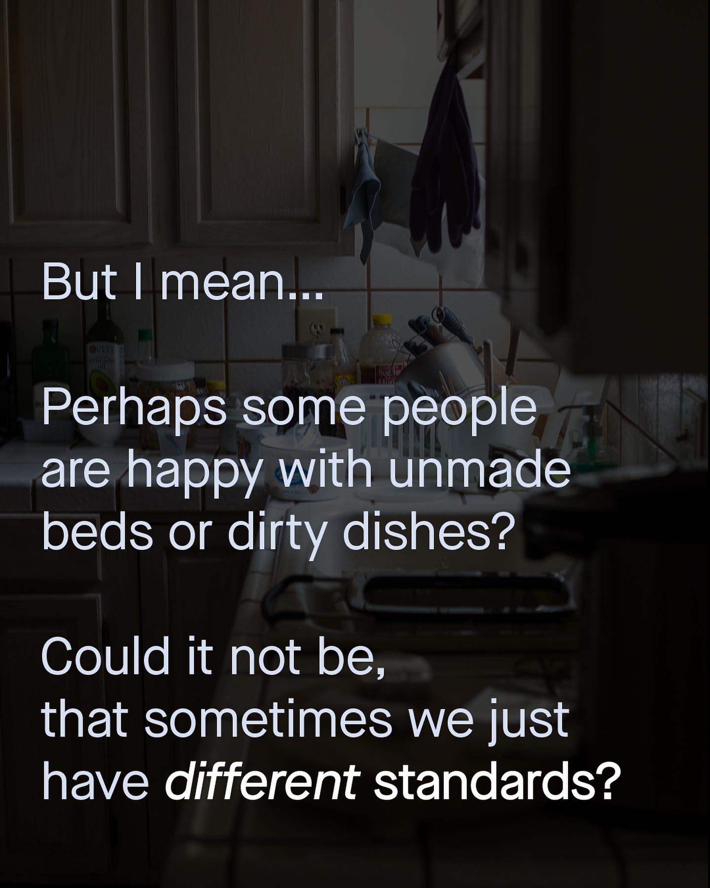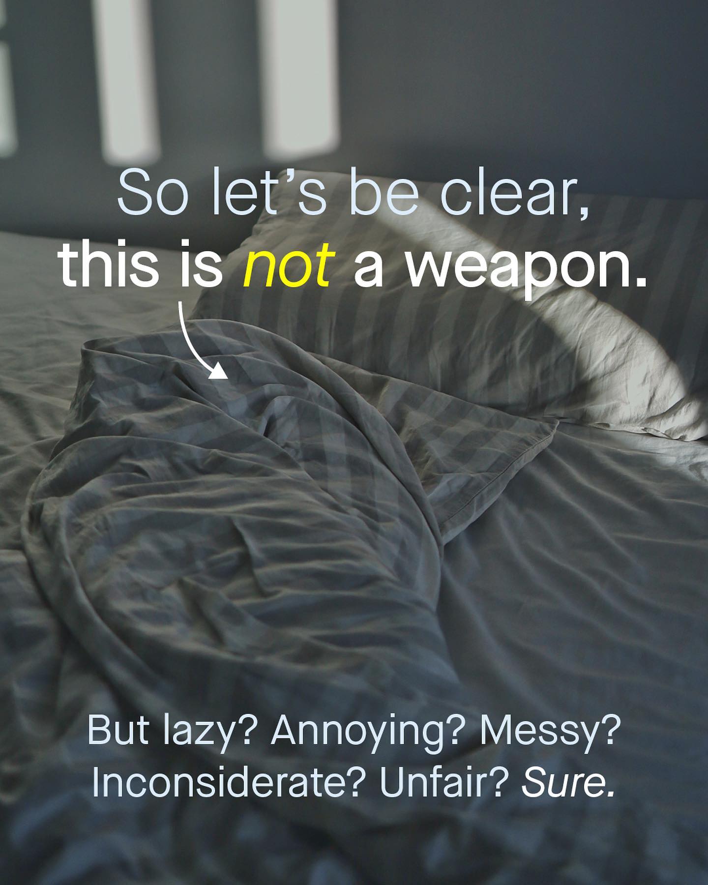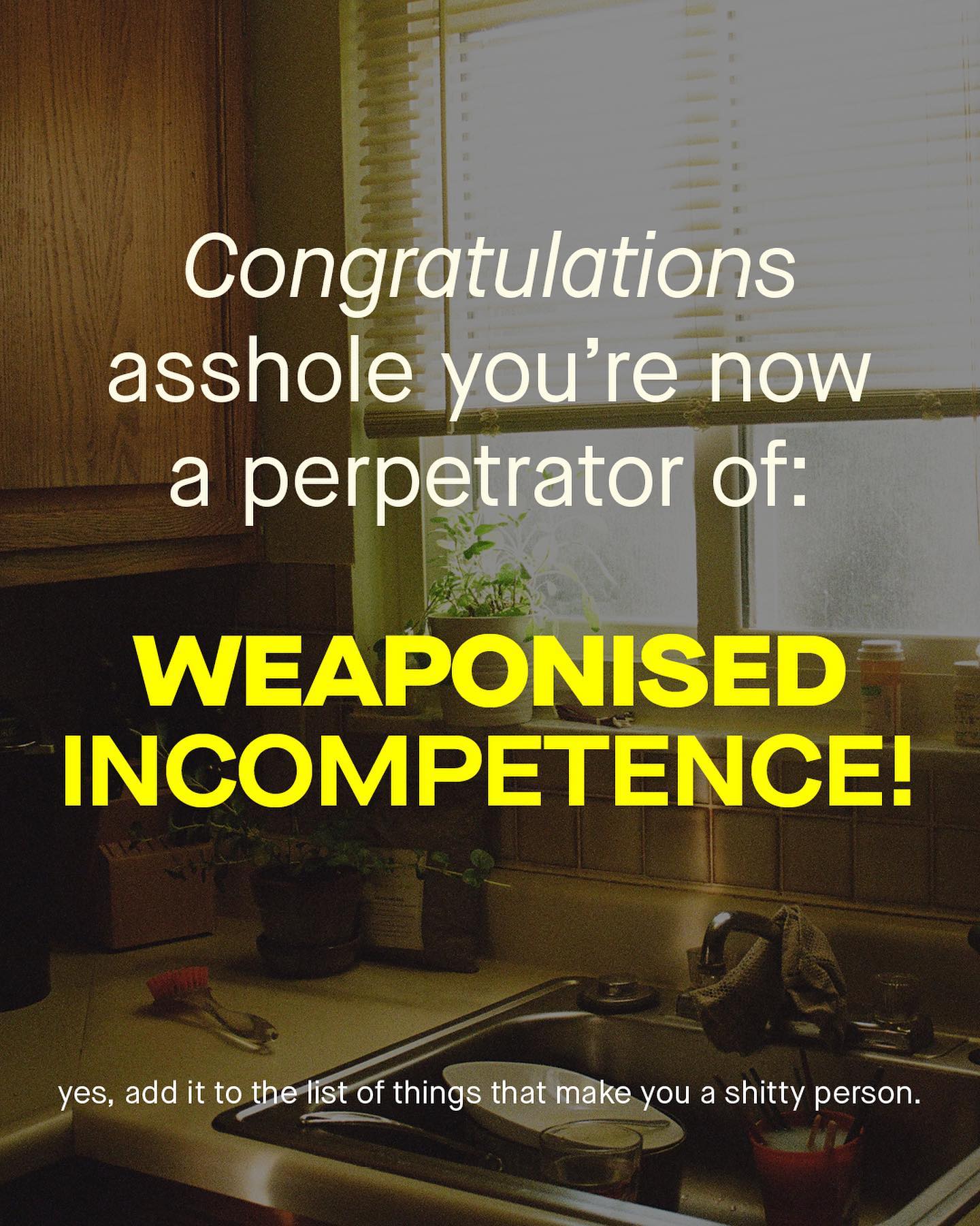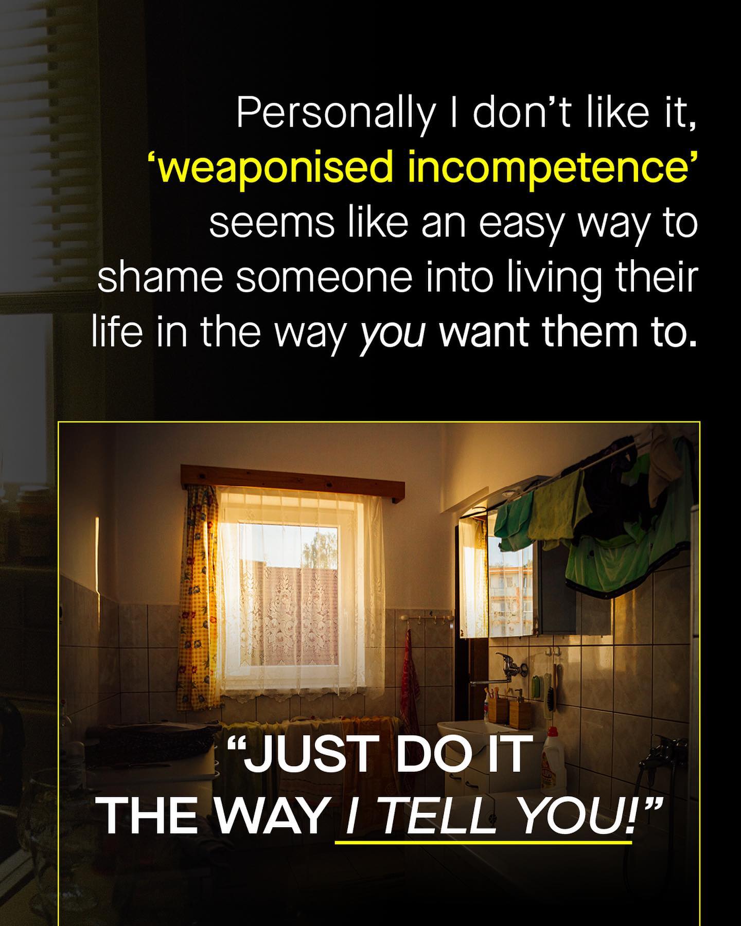 It seems like every other day that some sassy new neologism is thrown haphazardly into the mix. We began with the needless spreading of legs on trains, then the interruption of conversation at work – and now the inability to meet certain standards of domestic life, has been spun into something new, dramatic and dangerous sounding. So are you unhappy with the way your partner cleans? Are you frustrated at their poor form making the bed? Well guess what, you may be the victim of – ‘weaponised incompetence’. And I get it, I really do. There may well be a seed of truth to words that describe such behaviours. It is annoying to have someone drag their feet in a household. But to me ‘weaponised incompetence’ feels badly intended, and something easily misused to simply shame people who are happy living with different standards to you. If someone leaves the dishes until the following morning, or doesn’t mind crinkled clothing, or maybe burns the dinner – is that really a weapon? God help the women who may need more guidance whilst mowing the lawn, changing a car tyre, or helping out with DIY. Seriously, aren’t there better (dare I say, more mature) ways to discuss this same issue? Does everything have to be so dramatic, all of the time?! Why do such words, and the conversations they are part of, always have to take the form of a wedge to be driven between people? Can’t we just, you know, compromise? And I say this as someone who is extremely clean; there are no dishes in my sink, I have several cleans towels ready to go, and my bed is always made. But if someone fails to meet these standards, do I consider myself the victim of weaponised incompetence? No I don’t. Do you? ~ Images by Jason Leung, Ryan Kwok, Clarissa Clarbunco from Unsplash.