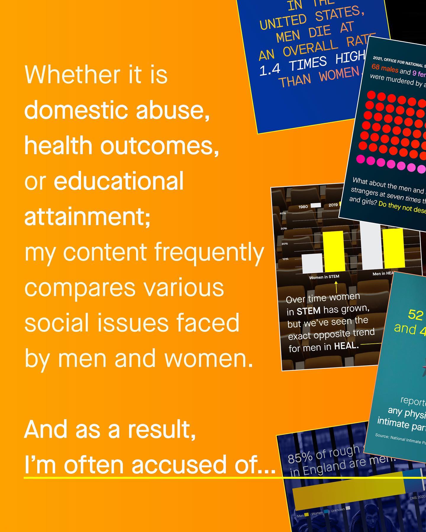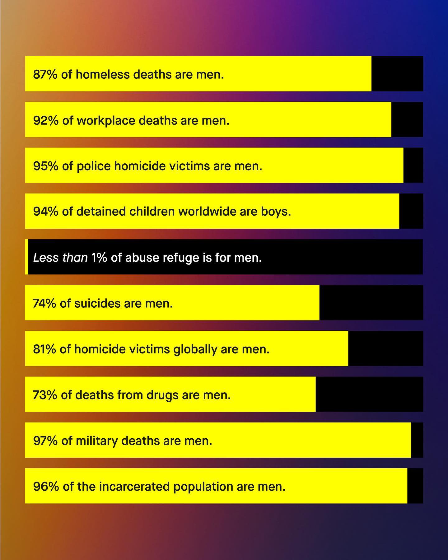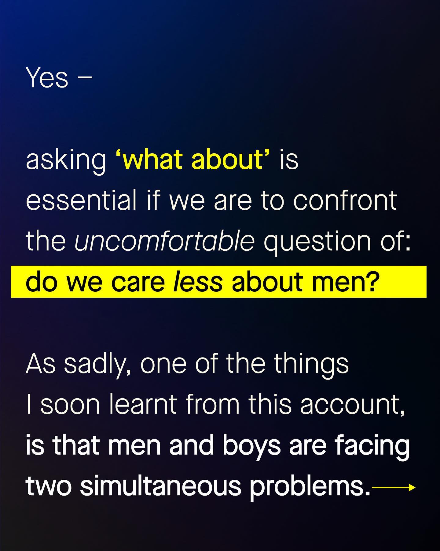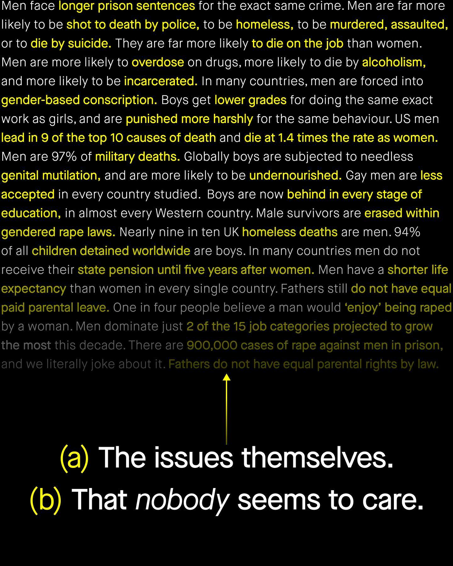 Here’s my entire hypothesis around this page: we don’t care about men and boys. Or at least, we don’t care about them as much as we do about women and girls. It’s easy to see. We silently watch boys slip behind in education, and we will stand idly by as men’s health continues to deteriorate. We’ll do nothing to seriously address the epidemic of male suicide, sit on our hands as the industries which heavily employ men are lost to automation, and do nothing as the millions of abused men continue to be shut out from our abuse support services. The education gap of boys, the employment crisis of men, and the epidemic of deaths of despair, are of too little interest, for far too many people. Meanwhile compassion, advocacy, funding and intervention will rightfully continue to be laid at the feet of our women and girls, as it should be. And whilst I support these women and girls too, the two way road of sexism cannot be ignored any longer. So yes, I will ask, what about the men and boys? What about the 115 million child grooms that nobody talks about? What about the 10,000 Nigerian boys taken by Boko Haram that nobody made signs for? What about the missing indigenous men of Canada, who were never investigated? And yes, what about the thirty boys murdered in London last year, who remain forgotten by the city’s Mayor? What about, what about, what about. I am not surprised so many do not like this question, in the same way that so many children do not like eating vegetables. But it is only through this difficult question that I am able to demonstrate that men and boys suffer a uniquely two layered problem: The first part are the issues impacting men and boys themselves. And the second part is asking ‘why does nobody give a fuck about them’? So yes, I will continue to poke and prod, antagonise if needed, and ask the unpopular questions that many find uncomfortable, perhaps even distasteful, yet which remains no less essential. For there are no easy questions here. So I ask, again, what about the men, what about the boys? ~ Images by Charles DeLuvio, Caroline Thiergart, Dan Cristian Padure and Sean Sinclair, from Unsplash.
