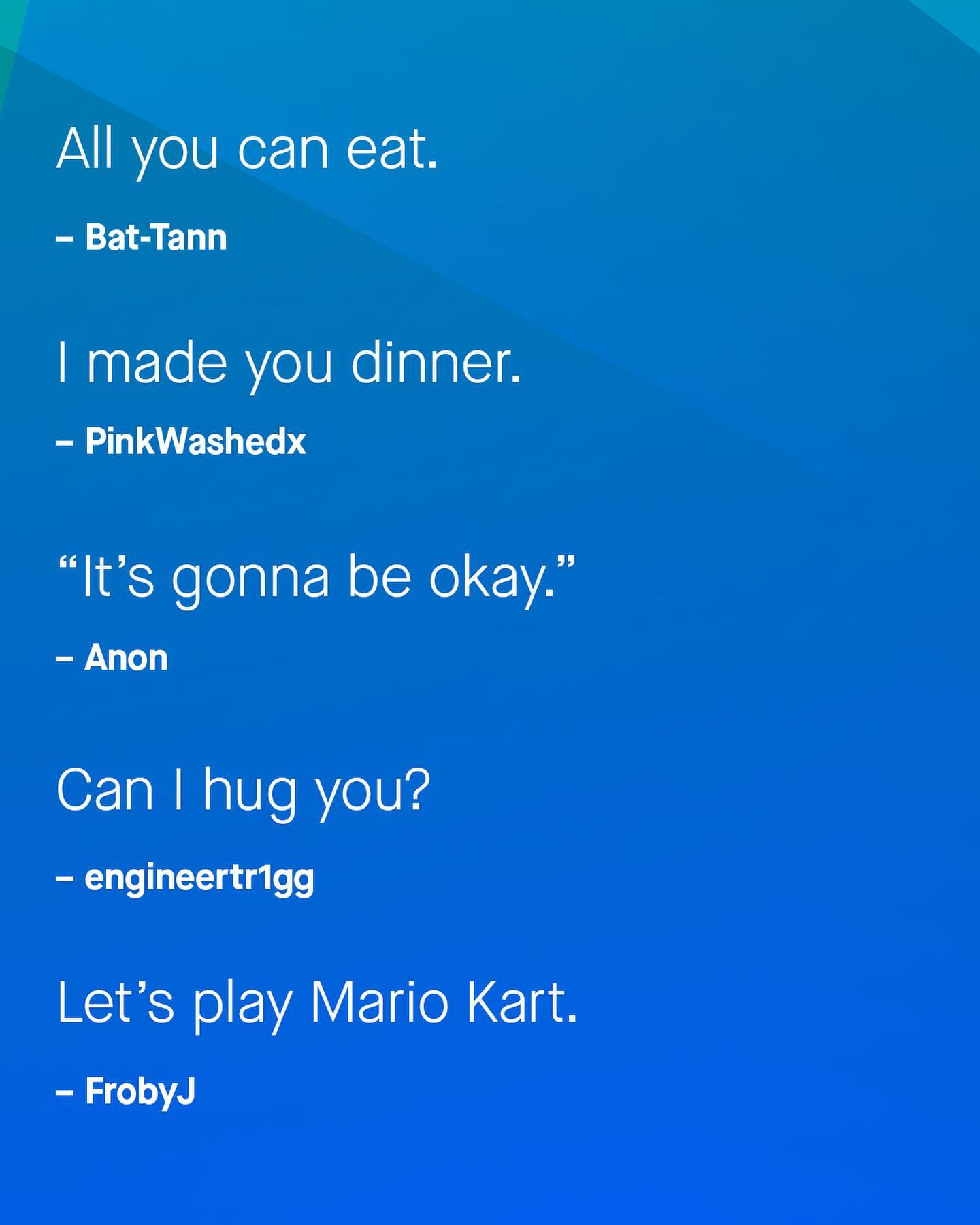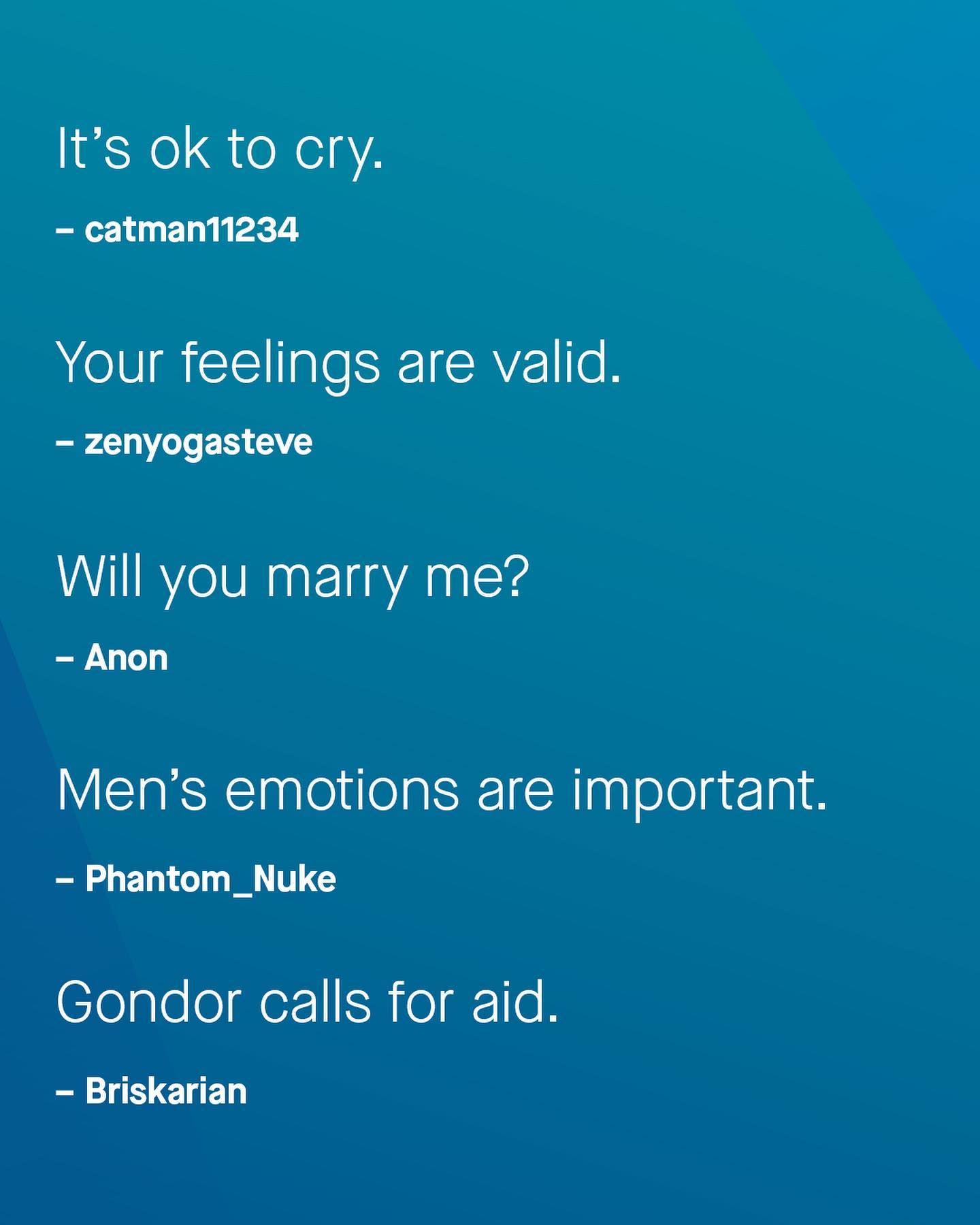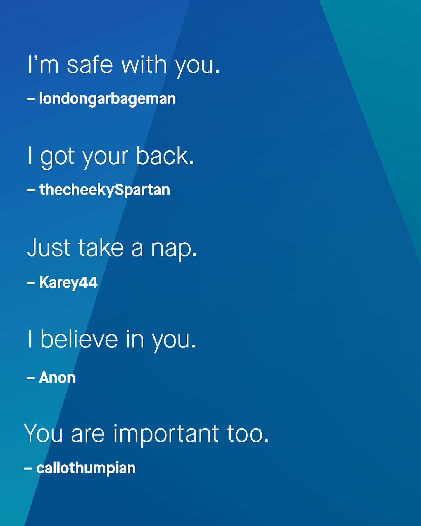 It doesn’t take much to change someone’s day for the better. It can take mere seconds. A small gesture of kindness, or look of love. A moment of thoughtful silence, a silly scribble on a scrap of paper, or just a few words earnestly spoken… So guys, what four words do you want to hear? ~ #mensmentalhealth